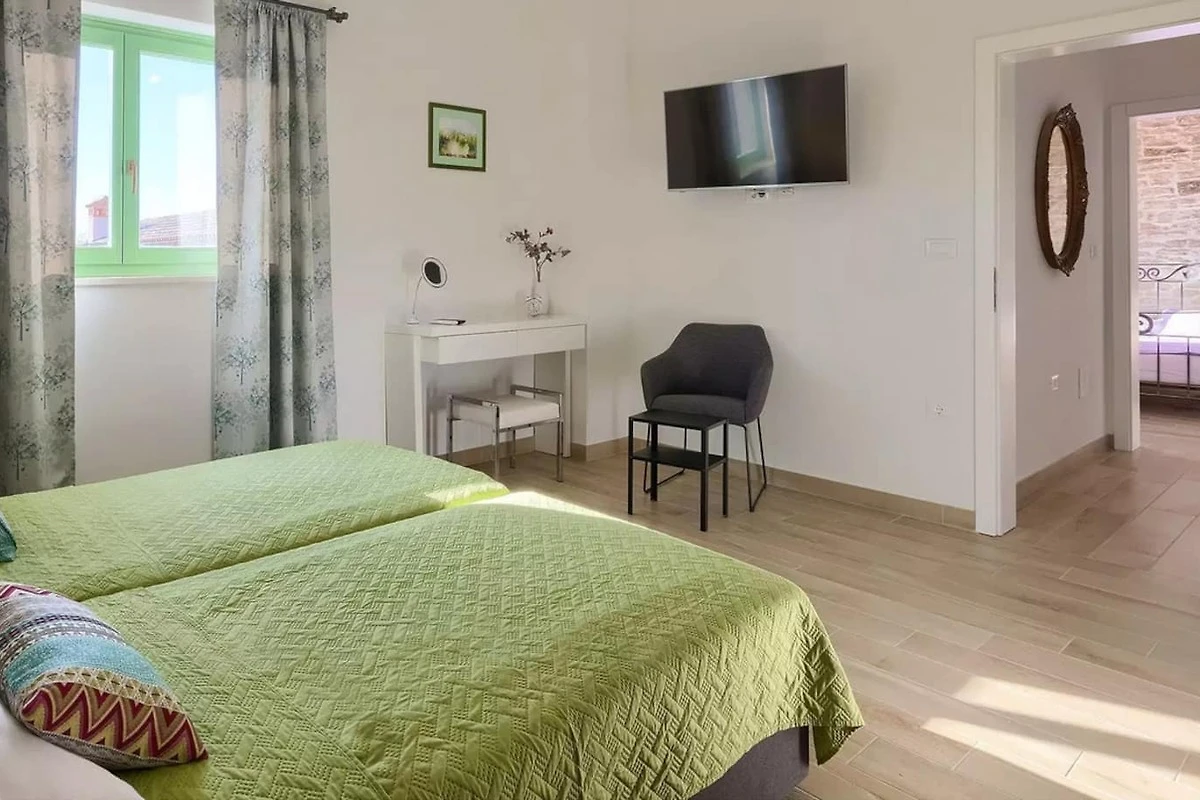 In nur 10 Minuten Autofahrt erreichen Sie die bezaubernde Hafenstadt Rovinj, wo Sie in gemütlichen Cafés entspannen und die St. Euphemia-Kirche bewundern können. Die Umgebung bietet zudem zahlreiche Aktivitäten wie Reiten, Joggen und Wandern, um die herrliche Natur zu erkunden.