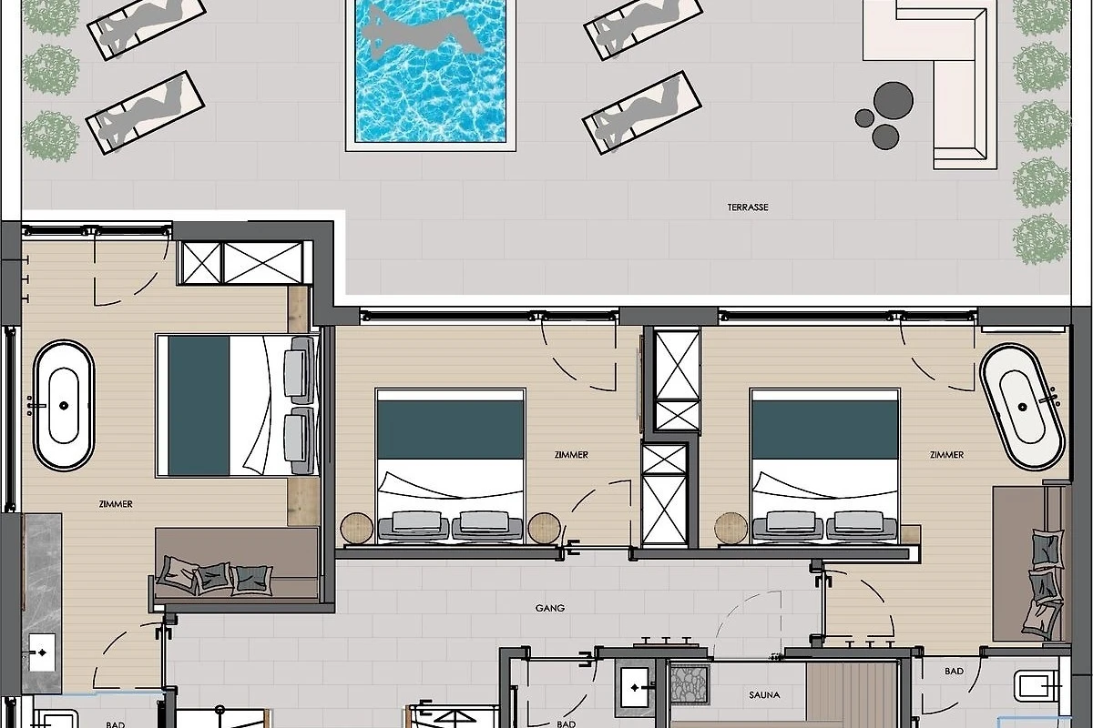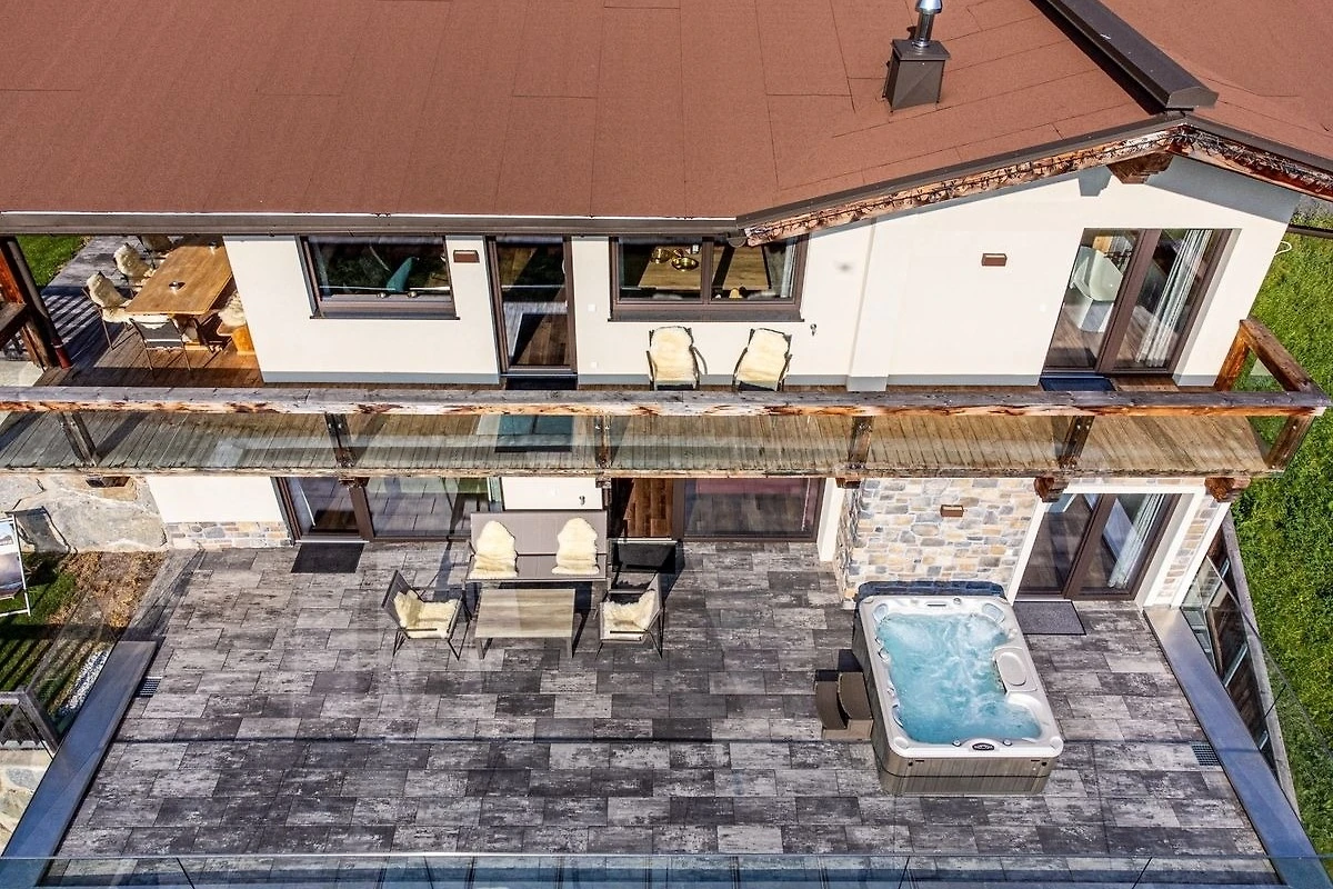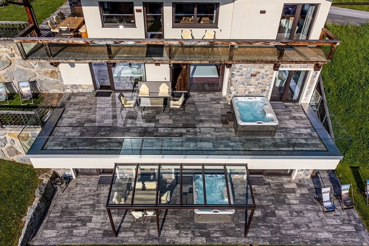 • Privater Outdoor-Whirlpool mit 38 °C auf der ca. 65 m² grossen Terrasse