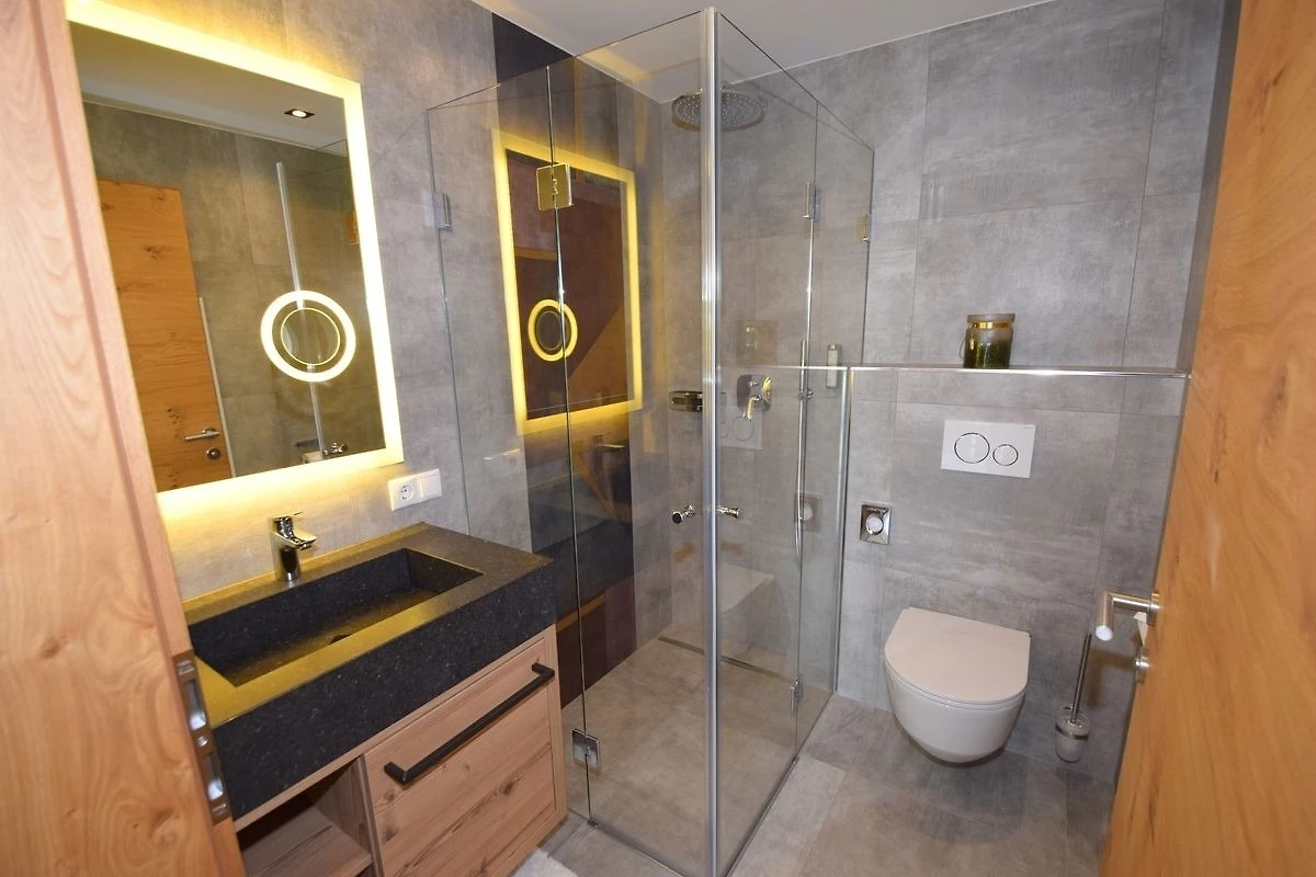 Alle Bäder sind mit integriertem Föhn ausgestattet und hochwertig eingerichtet.