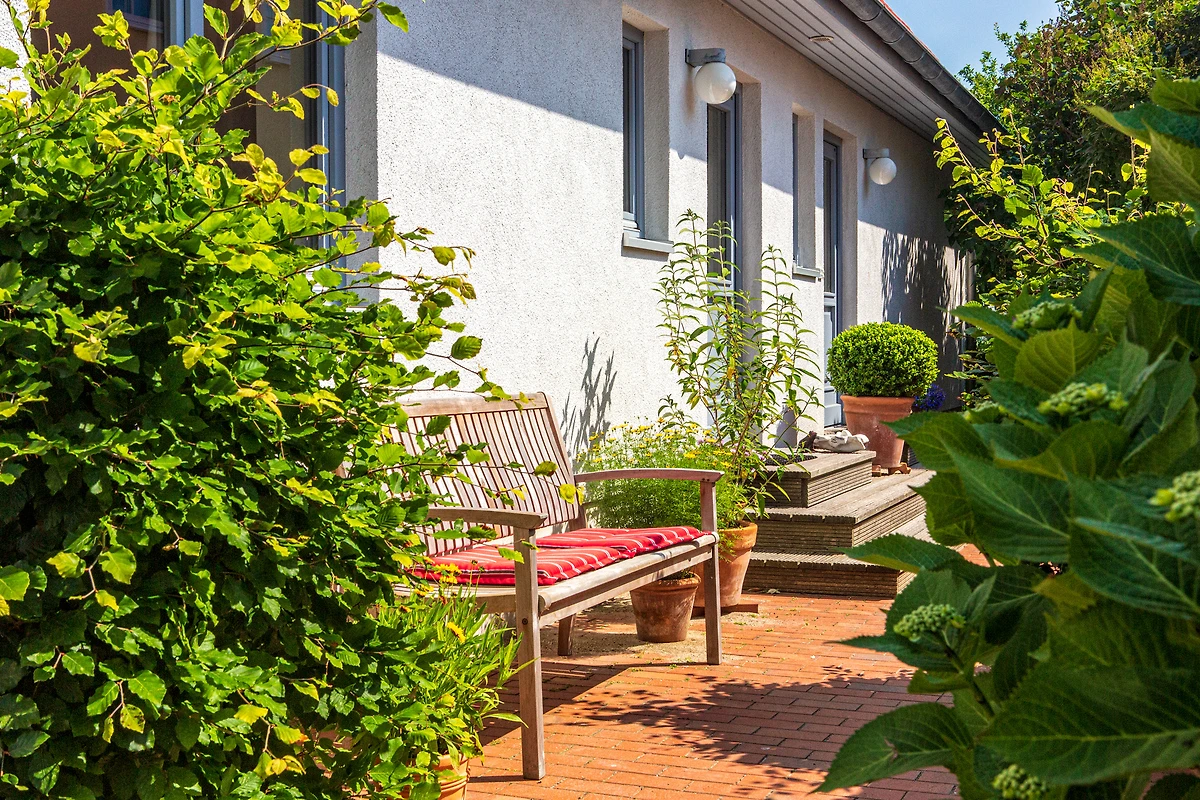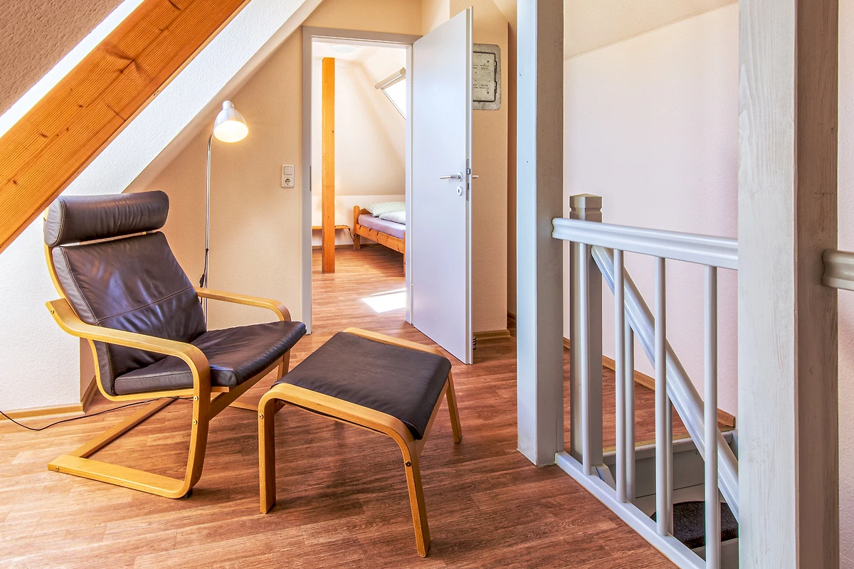 Sie erreichen es über eine Treppe innerhalb der Ferienwohnung. Einen Platz zum Lesen Ihrer Urlaubslektüre finden Sie in der Galerie des Spitzbodens. In unserem Innenhof stehen Gartenmöbel für Sie bereit.