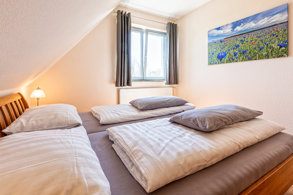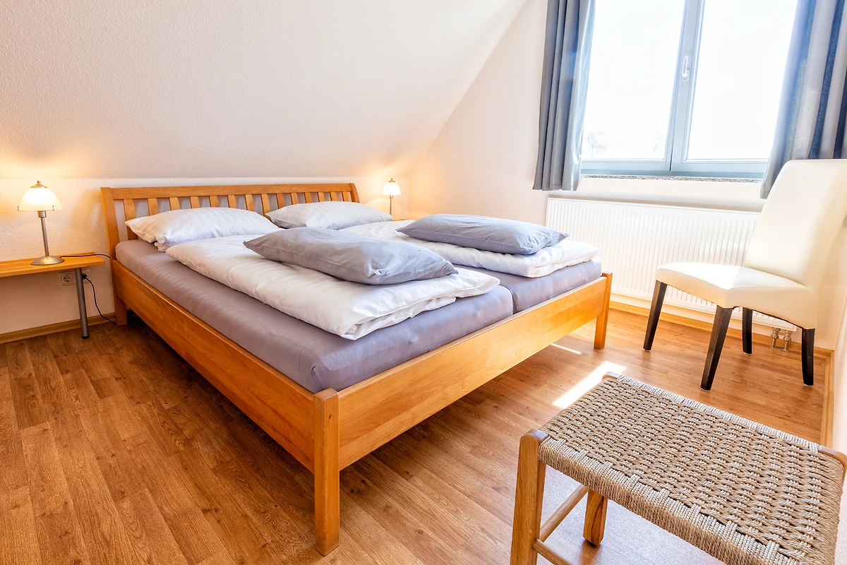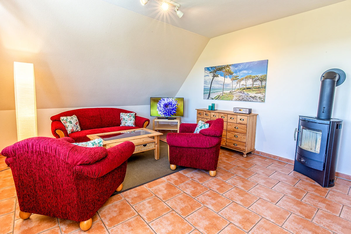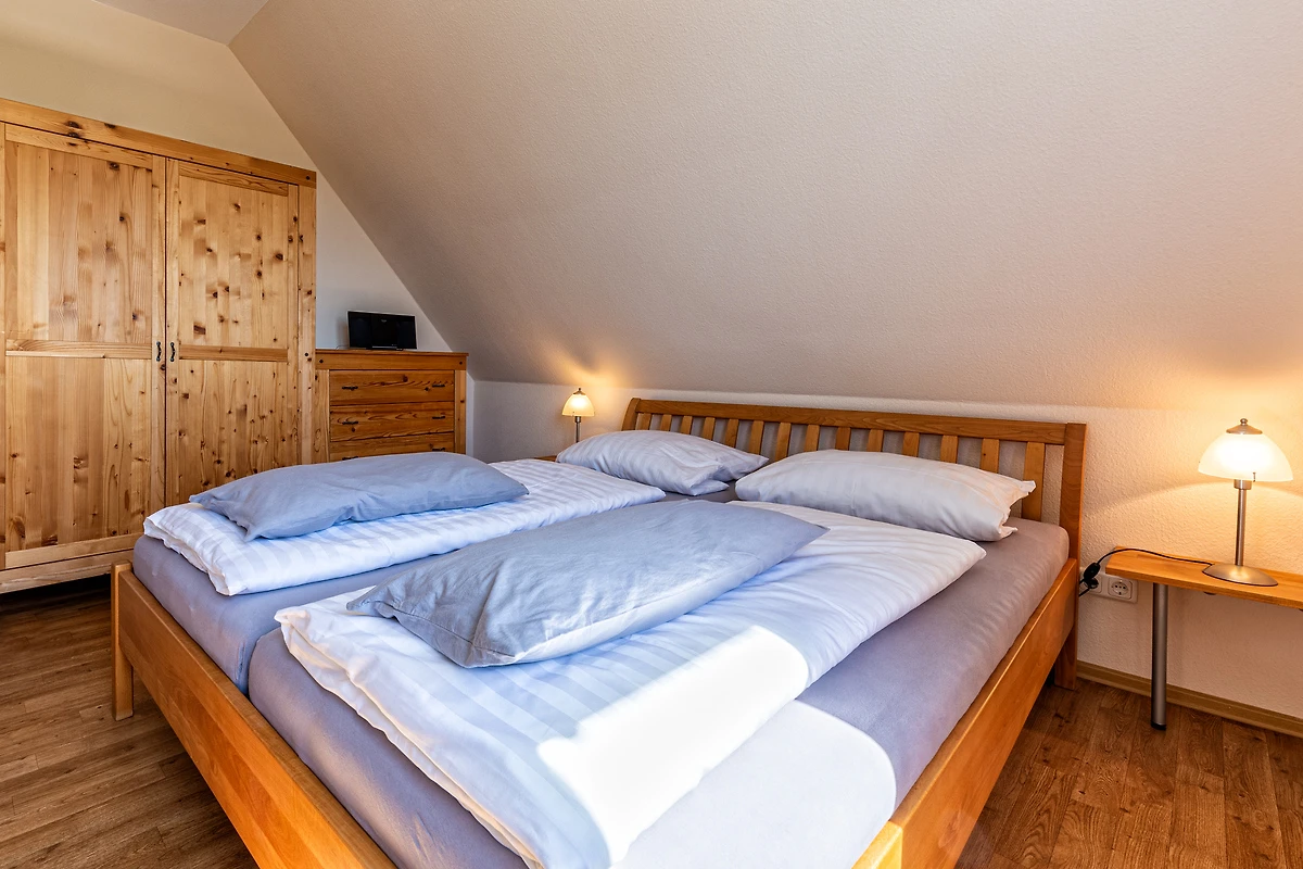 Im geräumigen Wohn-/Esszimmer finden Sie einen Kaminofen sowie den Fernseher mit SAT-Empfang und eine kleine Hifi-Anlage. Die Ferienwohnung verfügt über zwei Schlafzimmer. Eines davon befindet sich im ausgebauten Spitzboden der Ferienwohnung.