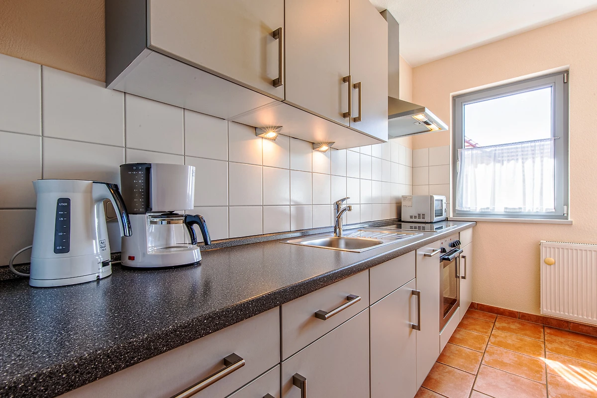 Die Ferienwohnung erreichen Sie über einen eigenen Eingang in einem kleinen Treppenhaus. Die Ferienwohnung bietet Ihnen eine kleine separate u. komplett ausgestattete Küche (Herd mit Ceranfeld und Backofen, Mikrowelle und Geschirrspüler).