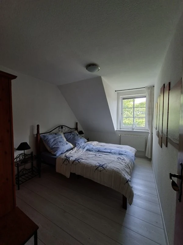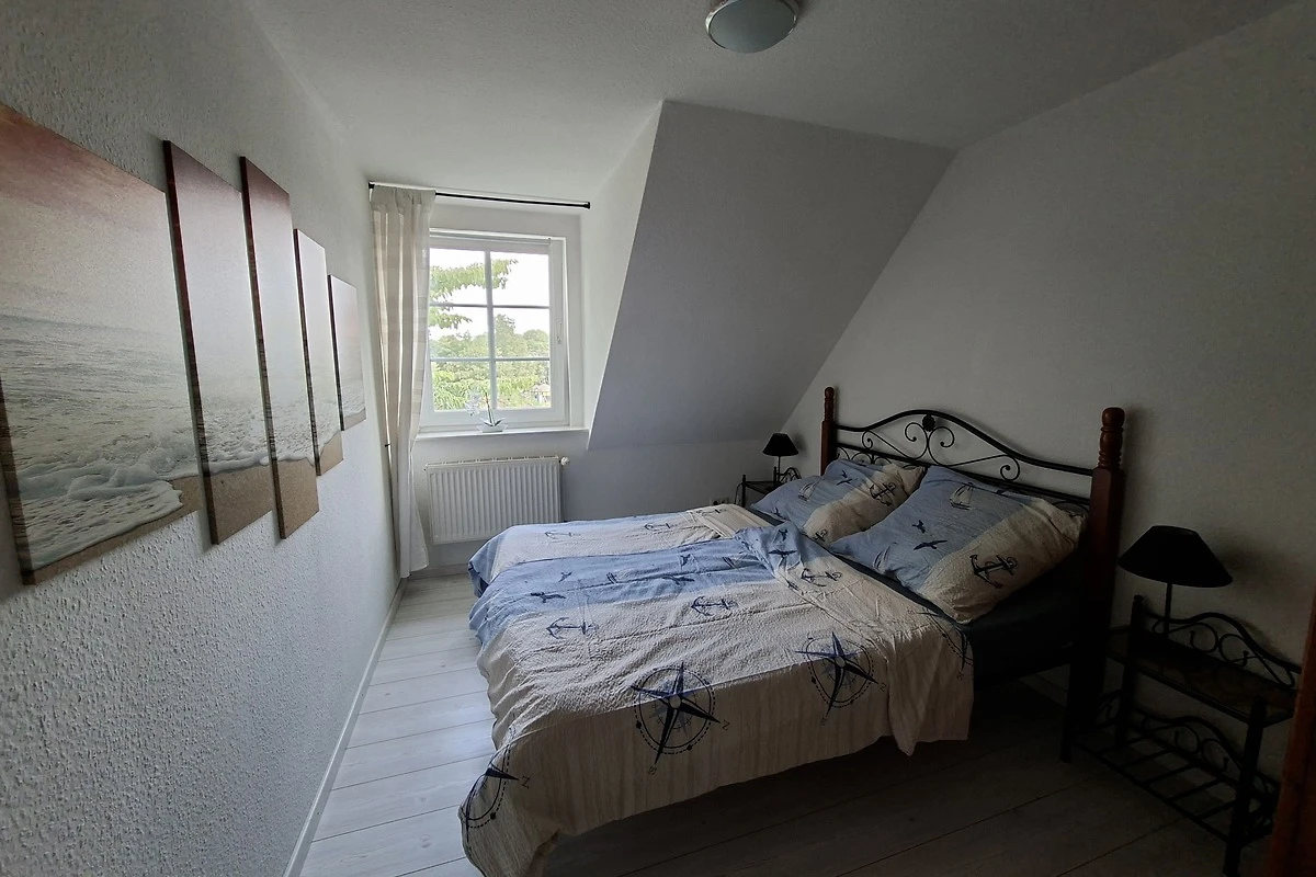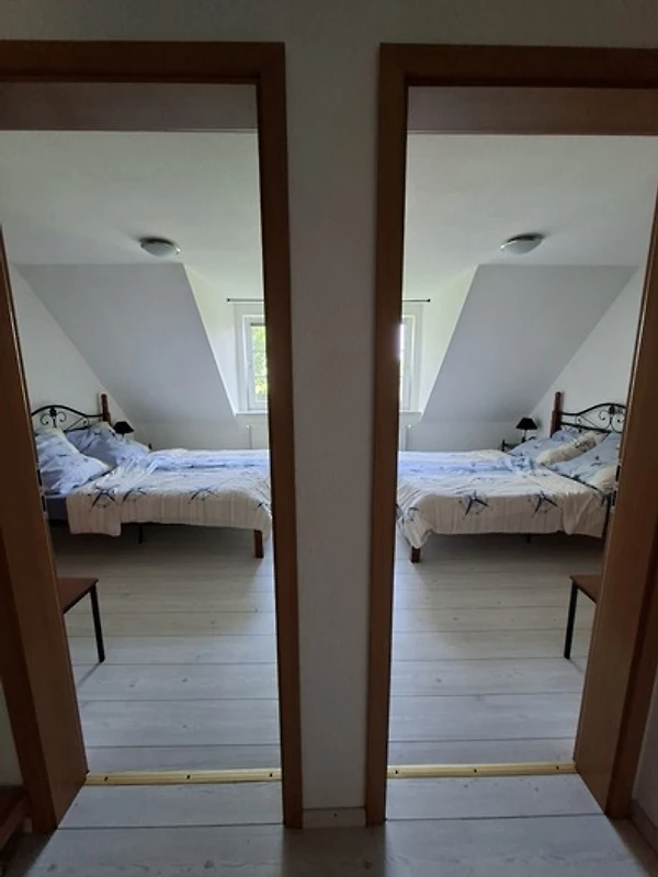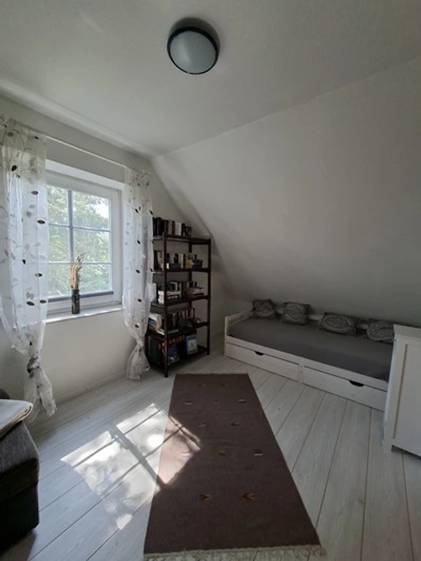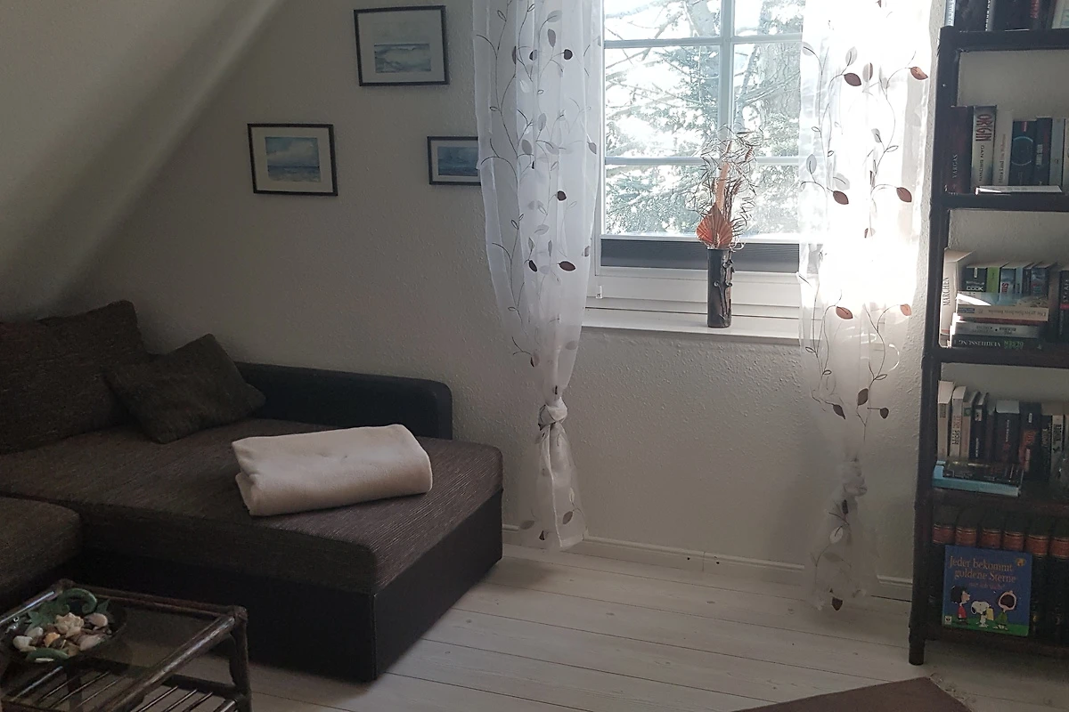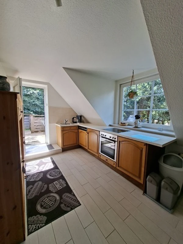 in die Wohnküche. Auf der gleichen Etage befinden sich zwei Schlafzimmer und das Bad mit Wanne und Dusche. Über eine Treppe nach oben ist ein weiterer Raum mit einer Sitzecke und einem zusätzlichen Einzelbett.