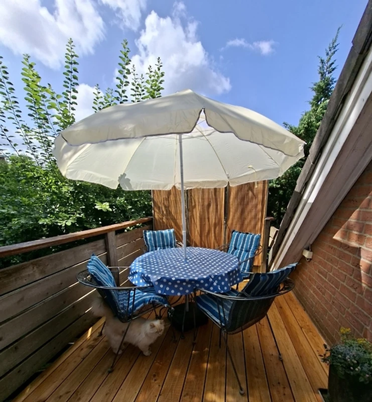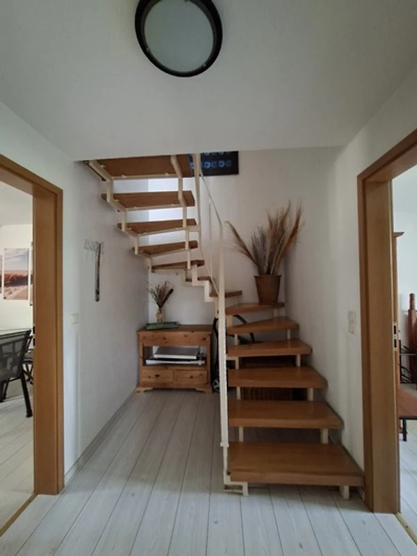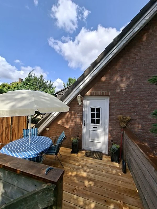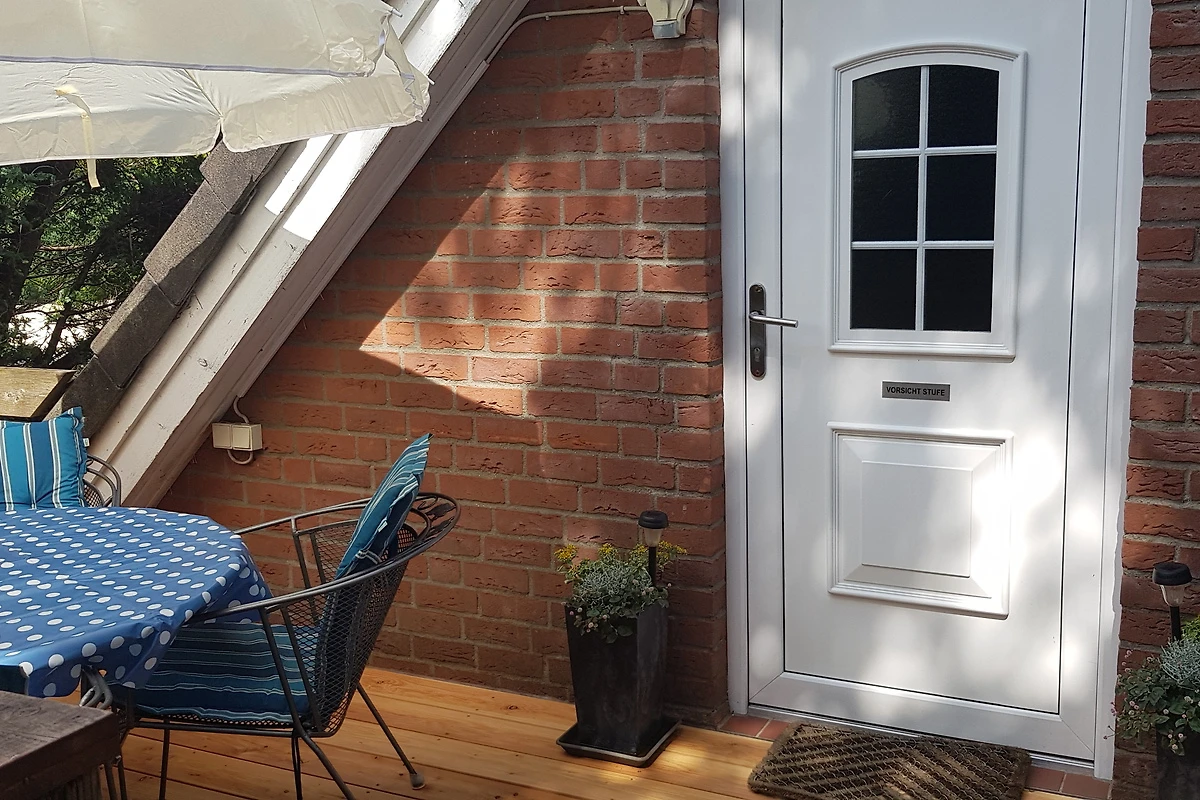 Über eine Außentreppe gelangen Sie auf die Terrasse mit Sitzgelegenheit. Dort befindet sich der Eingang und führt direkt