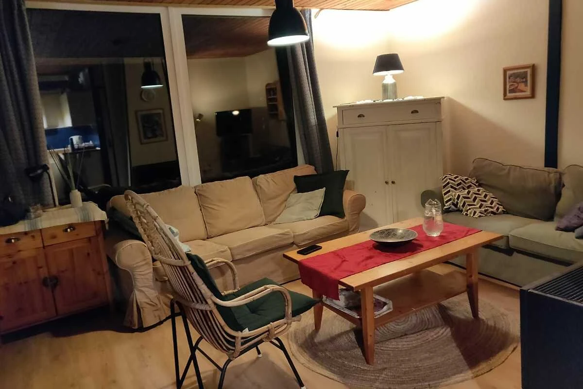 In dem Wohnraum sind eine Wohnzimmerecke mit einem 2 und einen 3 Sitzer, Esstisch und Stühle und eine Küchenzeile mit einer Herdplatte und Multifunktionsmikrowelle. Es stehen ein größeres und ein kleines Schlafzimmer zur Verfügung.