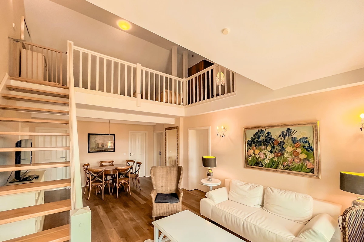 Offene Schlafgalerie mit einem weiteren Doppelbett, erreichbar über eine Treppe innerhalb der Wohnung