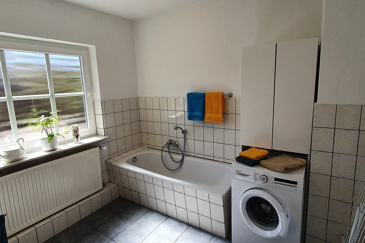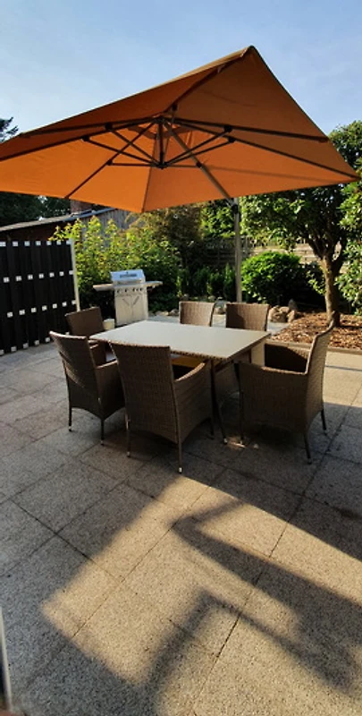 EG: Eine gut und reichlich ausgestattete Küche mit einem Frühstückstresen für 4 Personen, 1 Flur mit großzügigem Garderobenschrank, Schuhablage, ein Bad mit Badewanne, Dusche und Waschmaschine sowie der Wohn- und Esszimmerbereich. An den Wohn-und Esszimmerbereich schließt sich eine Terrasse mit Gartenmöbeln an die zum verweilen unter einem großen Sonnenschirm einladen. Ein Gasgrill für gemütliche Grillabende steht ebenfalls zur Verfügung.
