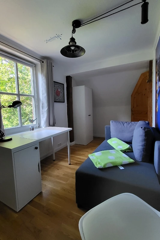 1 Schlafzimmer mit Doppelbett (140x200cm) sowie 1 Schreibtisch, Stuhl, Kleiderschrank und 1 Couch