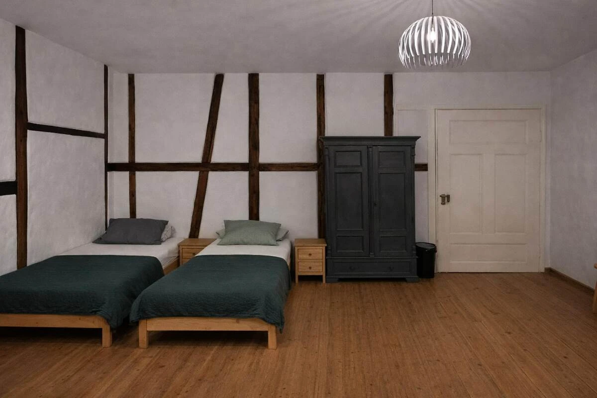 Dieses gemütliche Apartment in der 1. Etage bietet die ideale Unterkunft für Monteure, Geschäftsreisende und Urlaubsgäste. Mit zwei separaten Schlafzimmern – eines mit zwei Einzelbetten, das andere mit drei Einzelbetten – eignet sich die Wohnung perfekt für kleine Gruppen oder Kollegen.