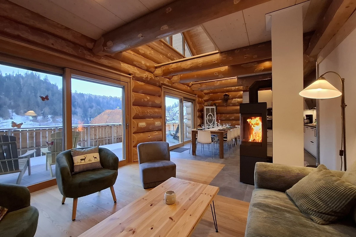 - ein Wohnzimmer mit einem Sofa, Kaminofen, Essplatz und TV