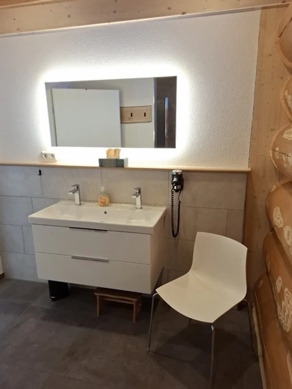 - ein Badezimmer mit WC, bodenebener Dusche, Doppelwaschtisch und Föhn