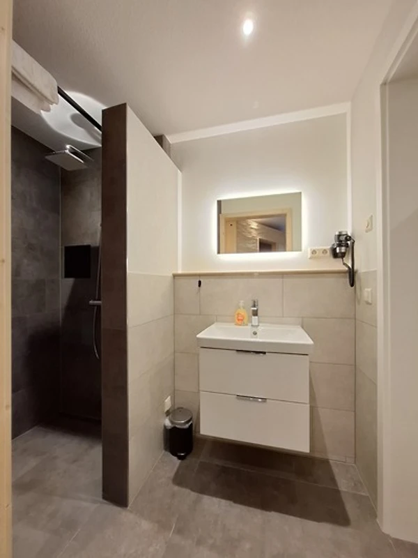 - ein Badezimmer mit bodenebener Dusche, Waschtisch und Föhn