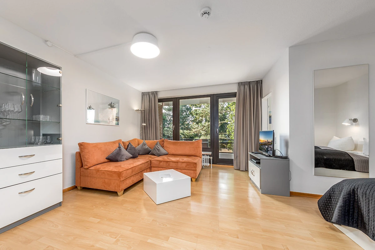 Die Ferienwohnung Timmendorfer Strand Nr. 18 liegt auf der ersten Etage des Hauses und verfügt über ein Wohn-/Schlafzimmer mit einer komfortablen Couchgarnitur, einem Flatscreen-TV und grosser Fensterfront zum anschliessenden Balkon. Zudem steht für Sie im Wohnbereich in einer Schlafnische ein hochwertiges Doppelbett (180x200cm) für 2 Personen bereit.