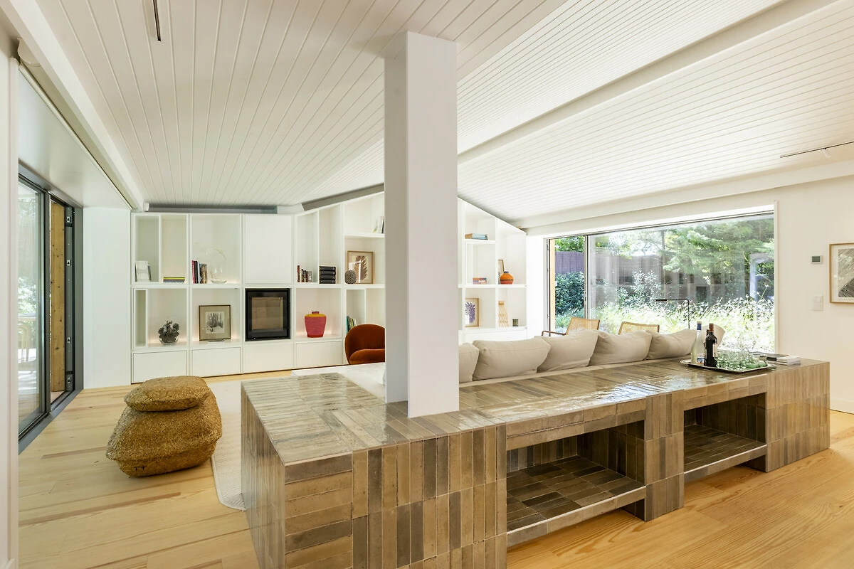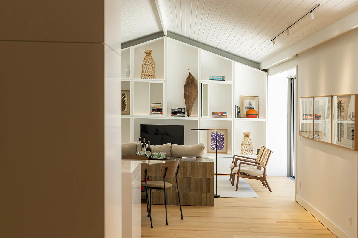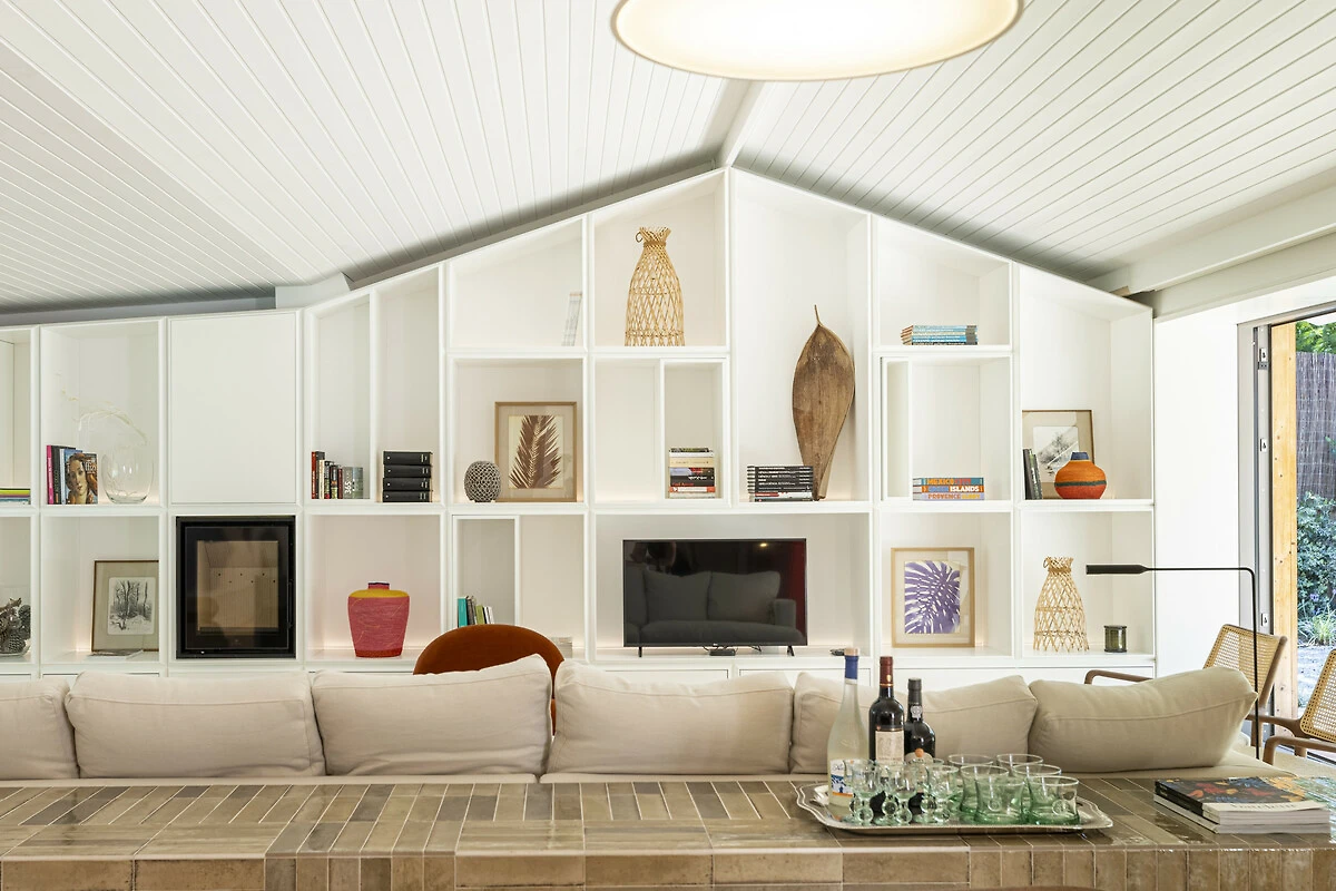 Inside, we find an open plan spacious kitchen, dining and living area. The kitchen floating bar is newly fitted and features all mod cons. The dining table seats ten people easily and the comfy living area faces a wall bookcase featuring artisanal and art objects, creating a contemporary, yet homely feel.