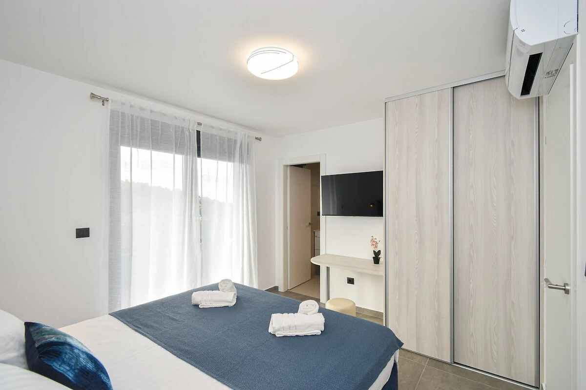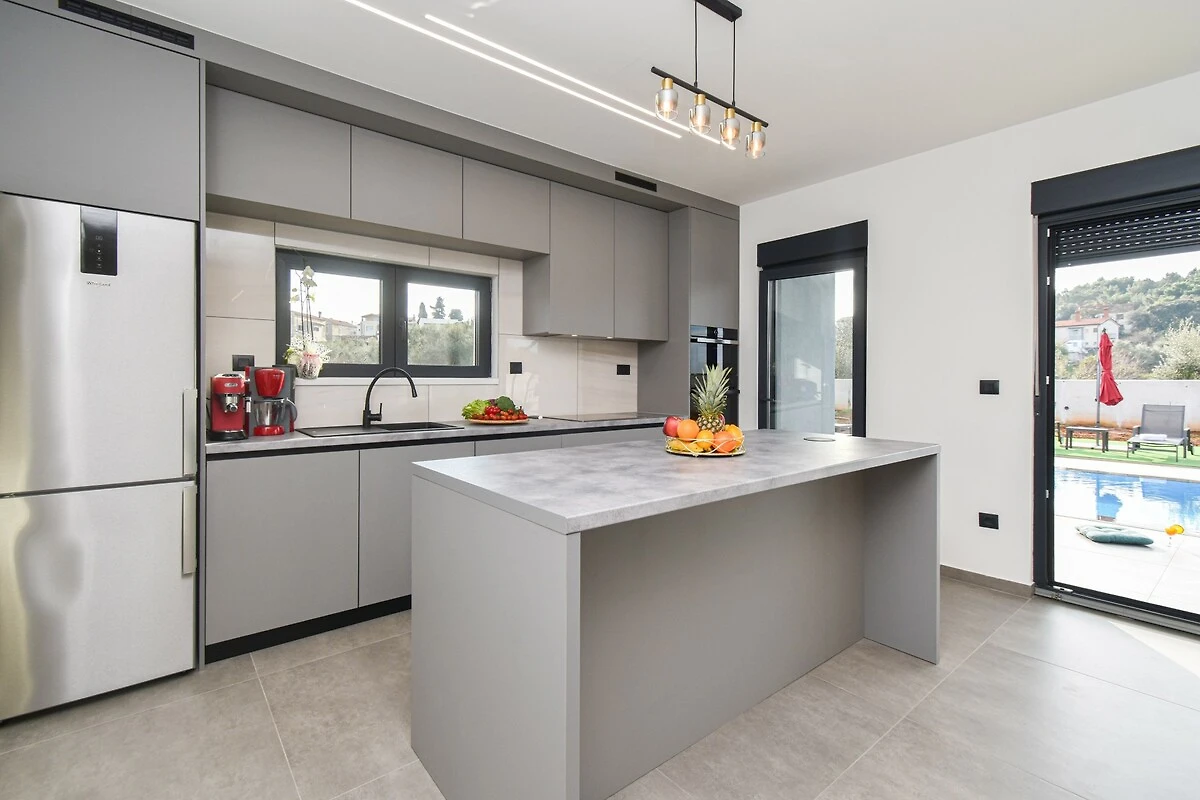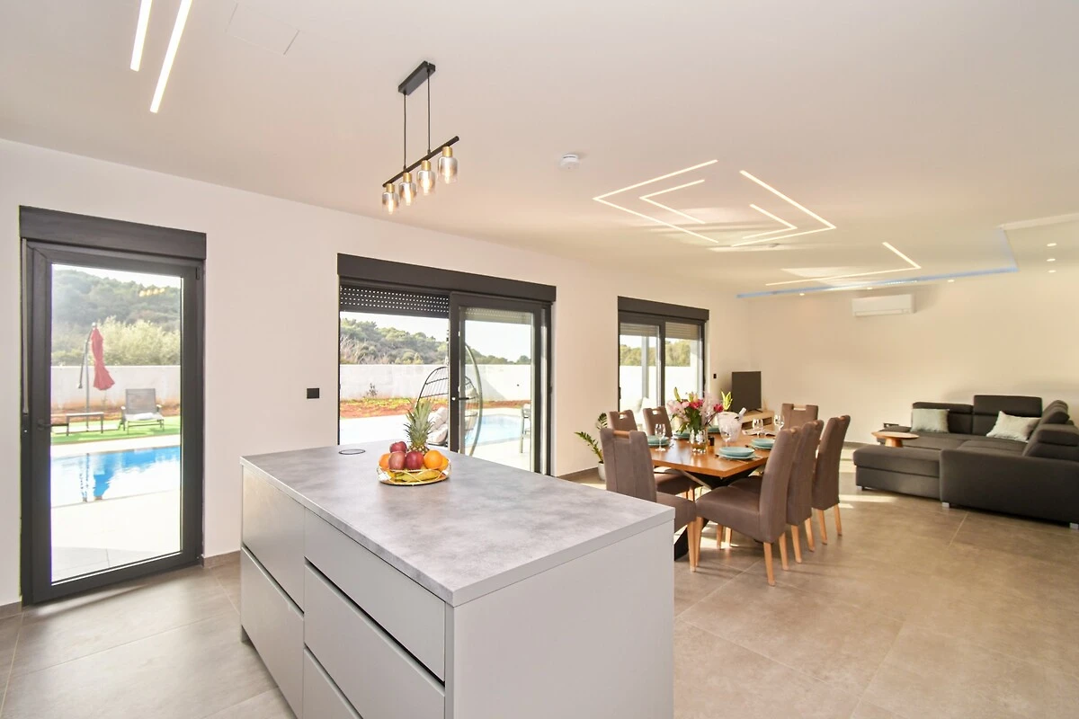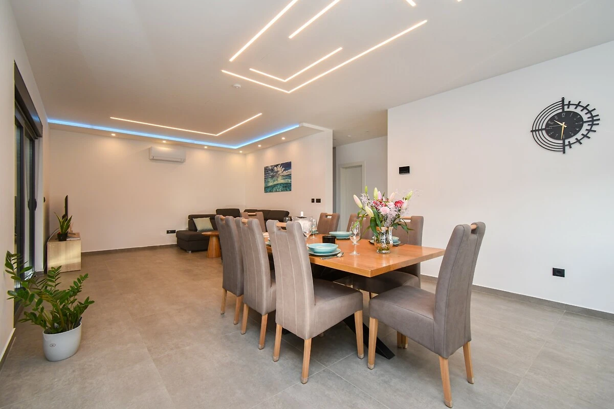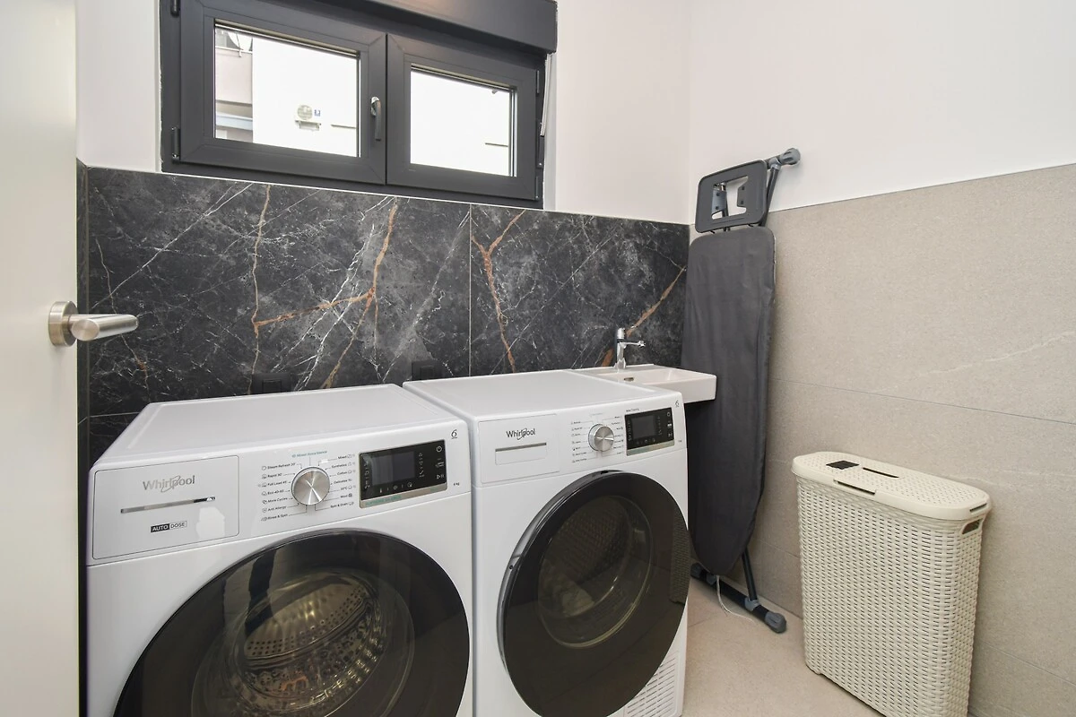 Im Erdgeschoss der Villa befindet sich ein geräumiges und modern eingerichtetes Wohnzimmer mit einem Schlafsofa, auf dem eine zusätzliche Person schlafen kann, eine voll ausgestattete Küche, ein Esstisch, ein Badezimmer sowie ein separater Abstellraum mit Waschmaschine und Trockner. Das Haus ist vollständig klimatisiert.