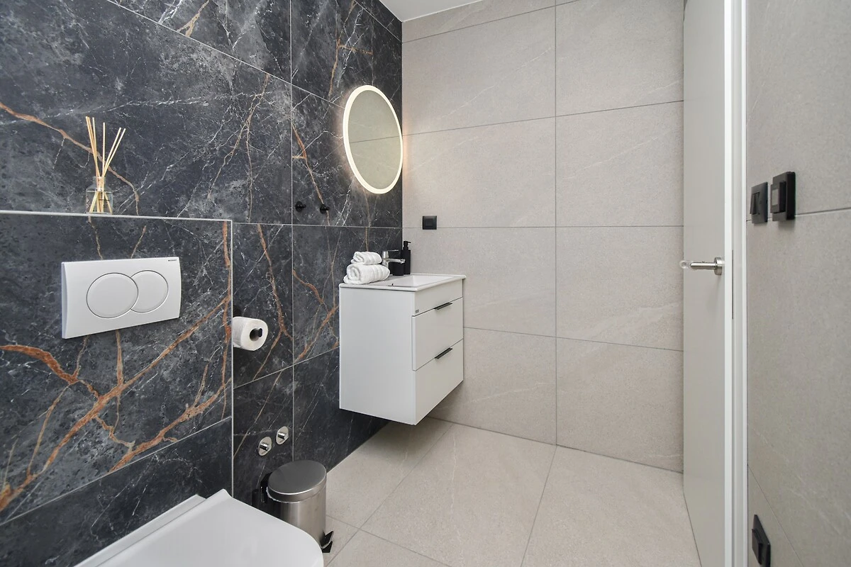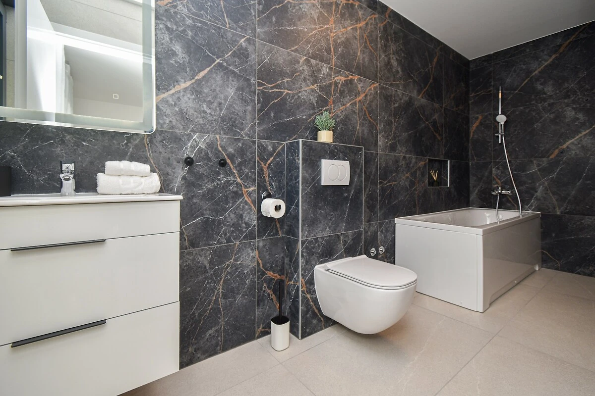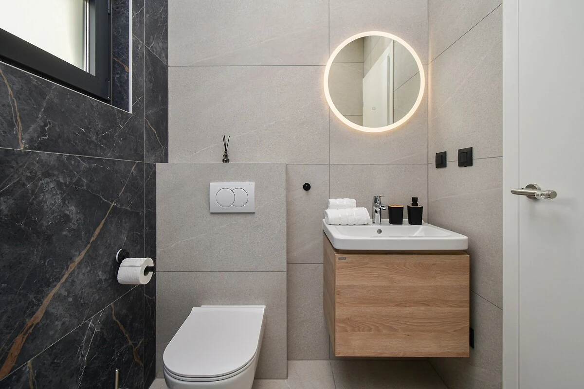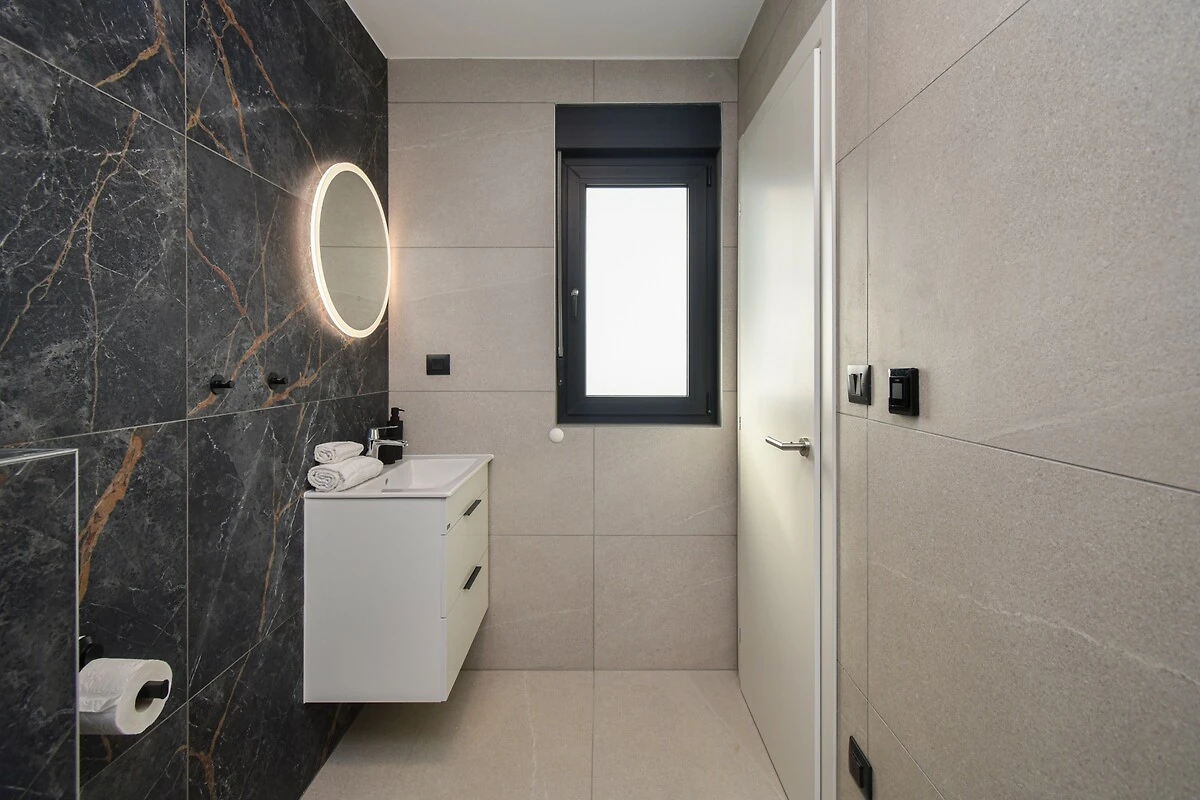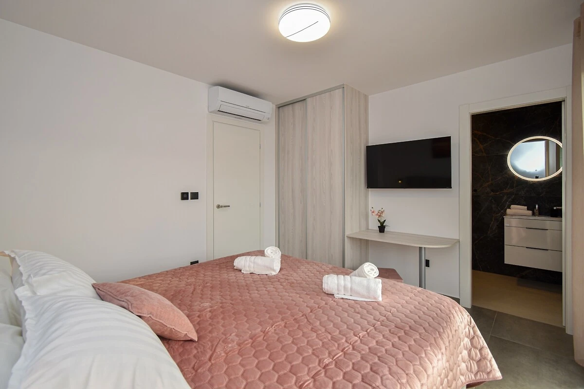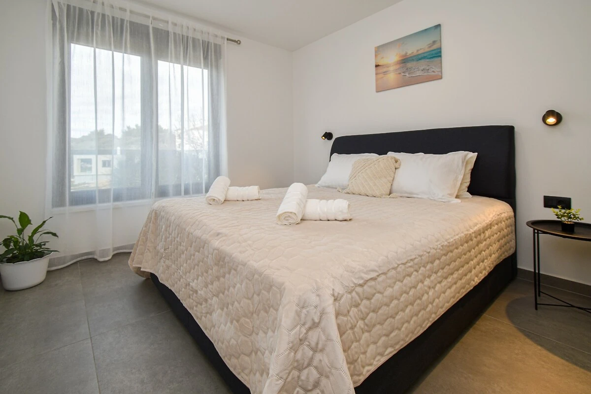Im Erdgeschoss der Villa befindet sich ein geräumiges und modern eingerichtetes Wohnzimmer mit einem Schlafsofa, auf dem eine zusätzliche Person schlafen kann, eine voll ausgestattete Küche, ein Esstisch, ein Badezimmer sowie ein separater Abstellraum mit Waschmaschine und Trockner. Das Haus ist vollständig klimatisiert.
