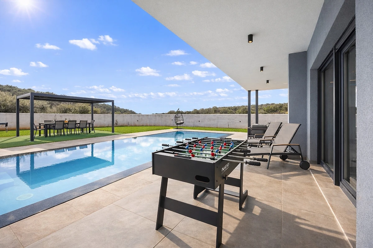 Der Außenbereich erstreckt sich über ein gepflegtes Grundstück von 1000 m² und bietet alles für einen unbeschwerten Aufenthalt im Freien. Den Gästen stehen ein privater Pool mit 35 m², umgeben von Liegen und Sonnenschirmen, ein Außengrill für gesellige Abende sowie ein Kinderspielplatz mit Rutsche und Schaukel und ein Tischfußball zur Verfügung – zur Freude von Kindern und Erwachsenen.