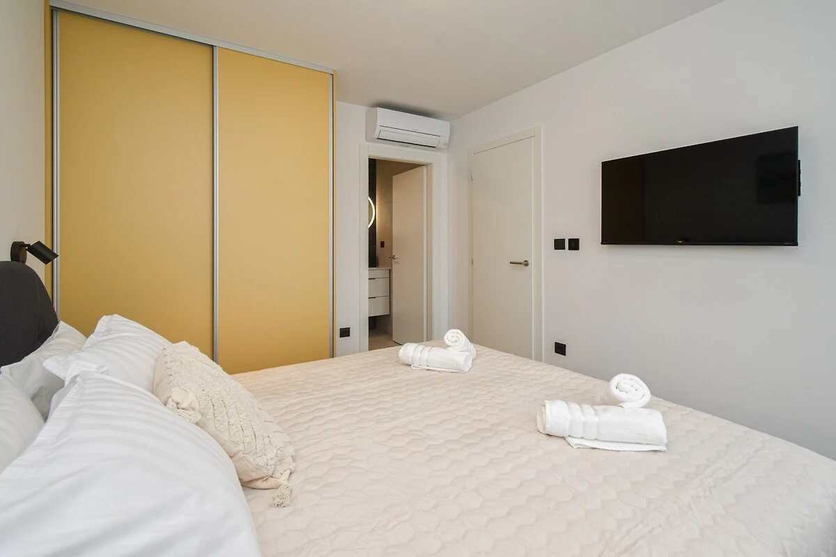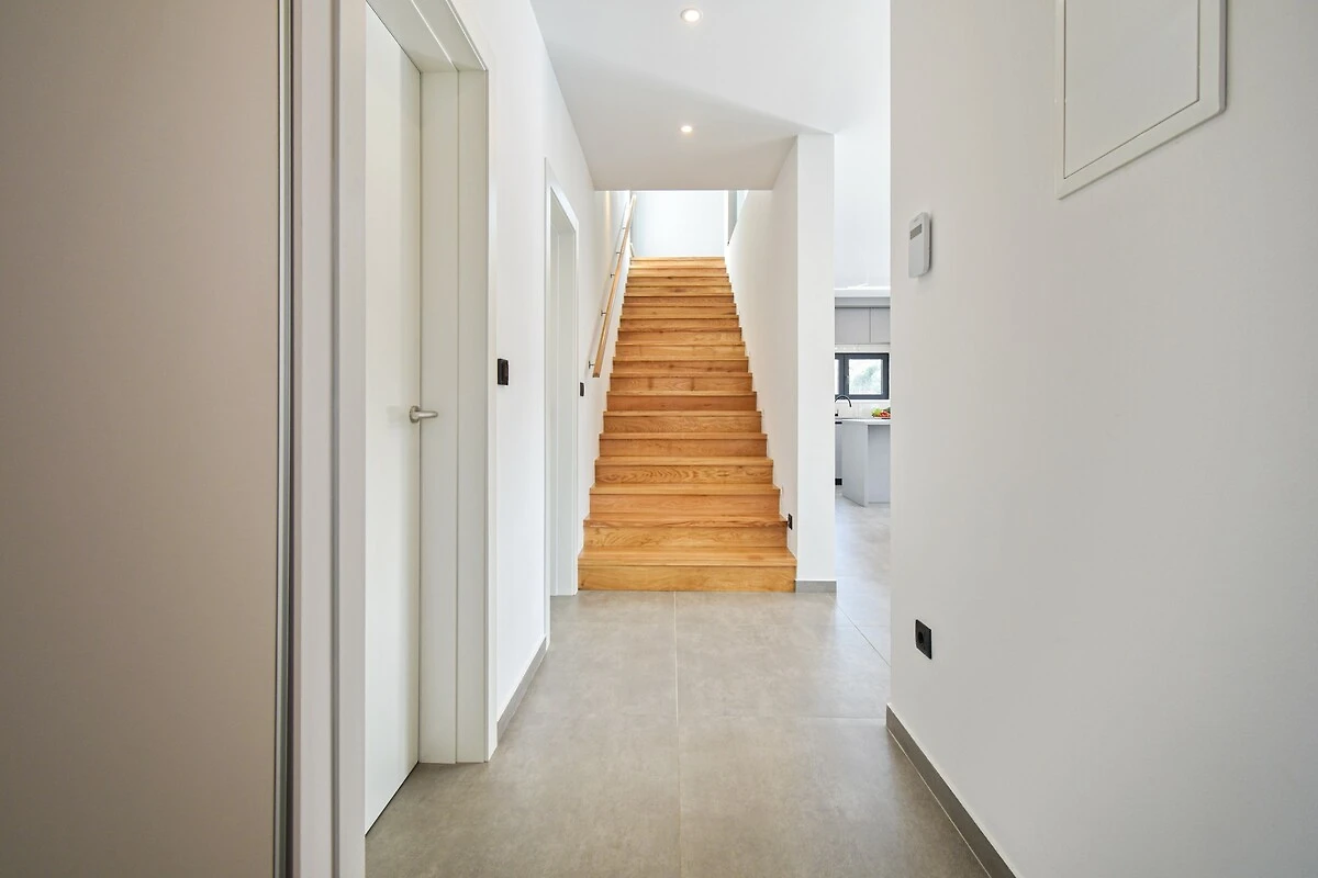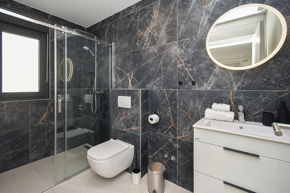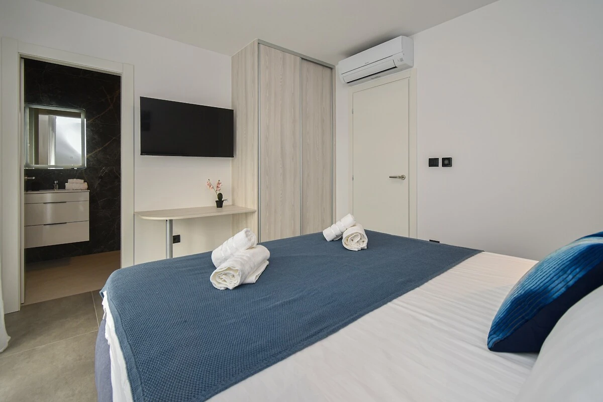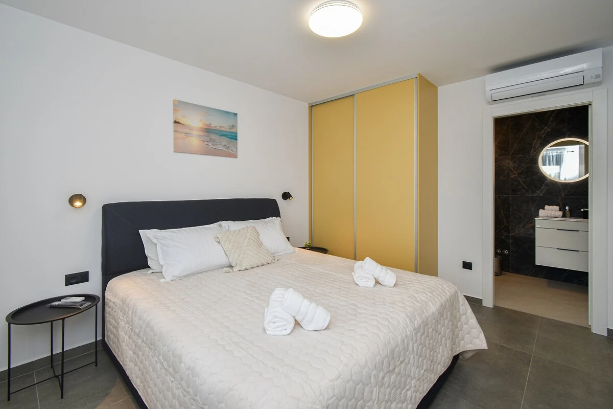Im ersten Stock befinden sich drei komfortable Schlafzimmer mit Kingsize-Doppelbetten, jedes mit eigenem Bad en suite, Klimaanlage und TV. Zwei Schlafzimmer verfügen über einen Balkon – ideal, um den Morgenkaffee oder wunderschöne Sonnenuntergänge mit Meerblick zu genießen. Insgesamt verfügt die Villa über 4 Badezimmer.