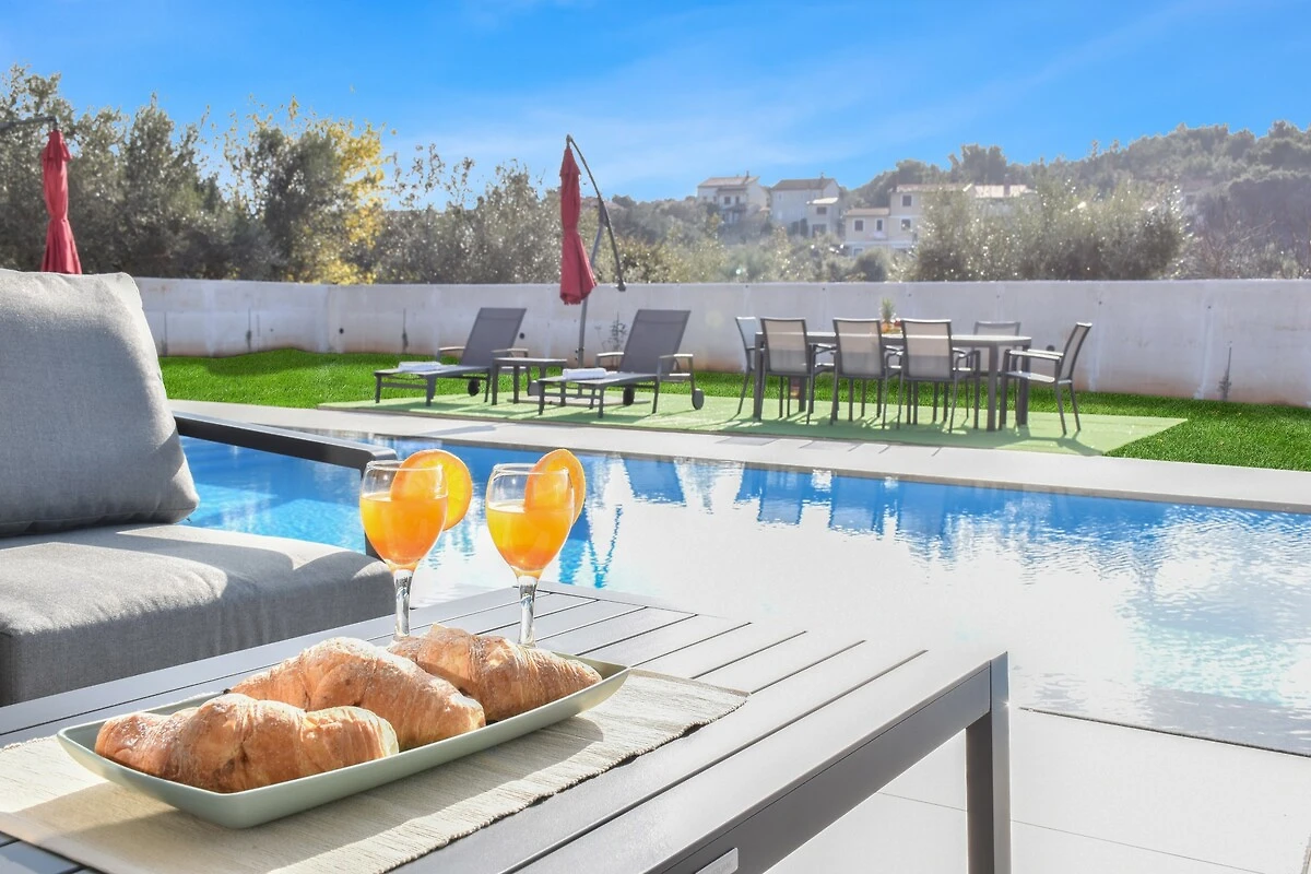 Der Außenbereich der Villa erstreckt sich über ein gepflegtes Grundstück von 1.000 m² und bietet alles, was man für einen unbeschwerten Aufenthalt im Freien benötigt. Den Gästen stehen ein privater Pool mit 35 m², umgeben von Sonnenliegen und Sonnenschirmen, ein Außengrill für gesellige Abende sowie ein Kinderspielplatz mit Rutsche und Schaukel und ein Tischfußball zur Verfügung, der sowohl Kinder als auch Erwachsene begeistert.
