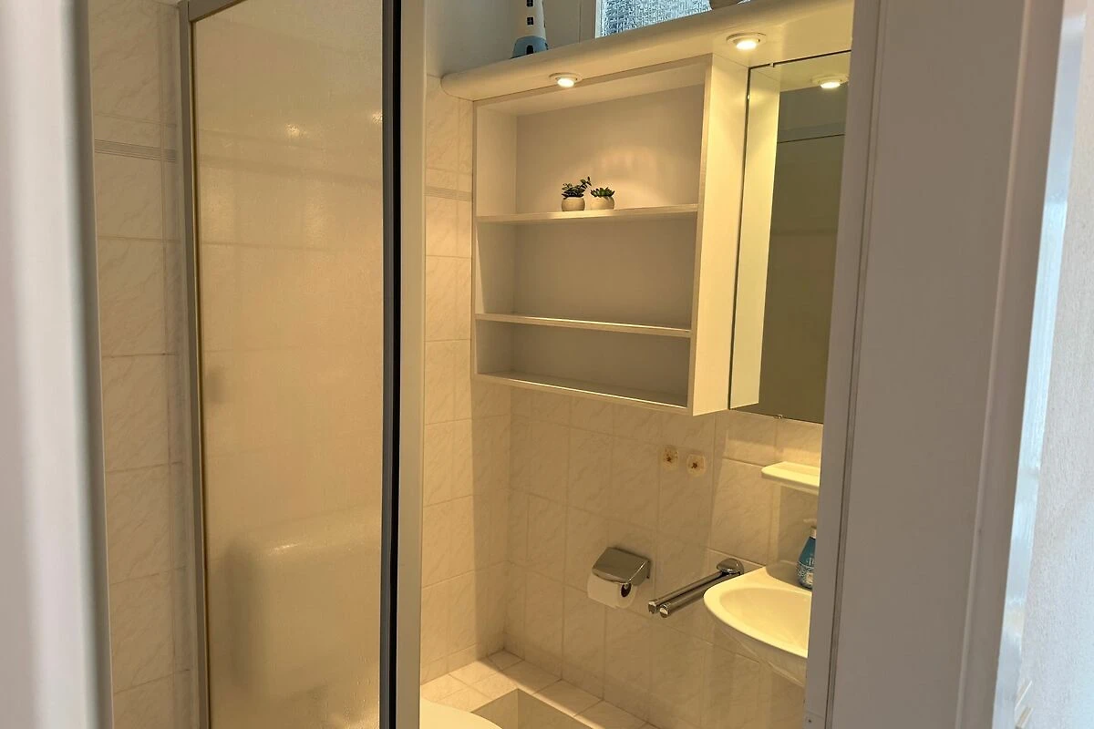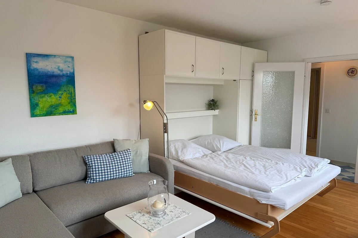 Das Schrankbett lässt sich im Handumdrehen ausklappen und verwandelt den Raum in einen gemütlichen Schlafbereich. Die einladende Couchecke mit Smart-TV bietet den perfekten Ort zum Entspannen und Fernsehen, während auf dem Schlafsofa bei Bedarf sogar noch Platz für ein Kind ist. Ein Esstisch im Wohnbereich sowie eine separate kleine Küche mit eigenem Essplatz ermöglichen flexible Mahlzeiten. Das Badezimmer ist mit einer Dusche und WC ausgestattet.