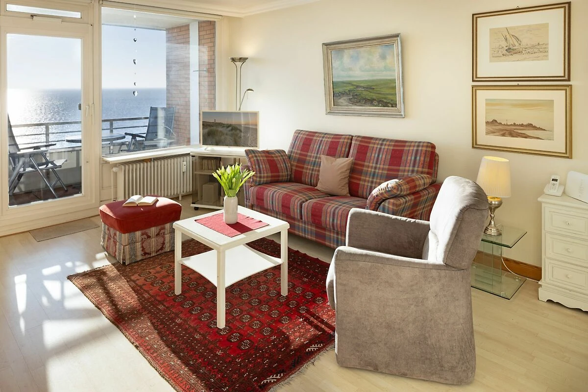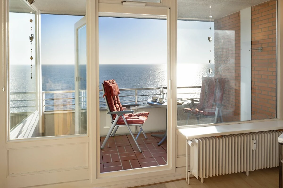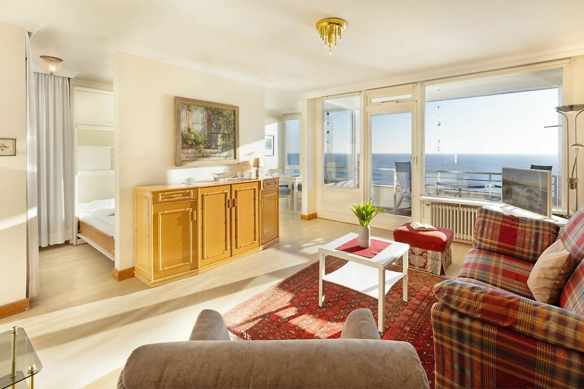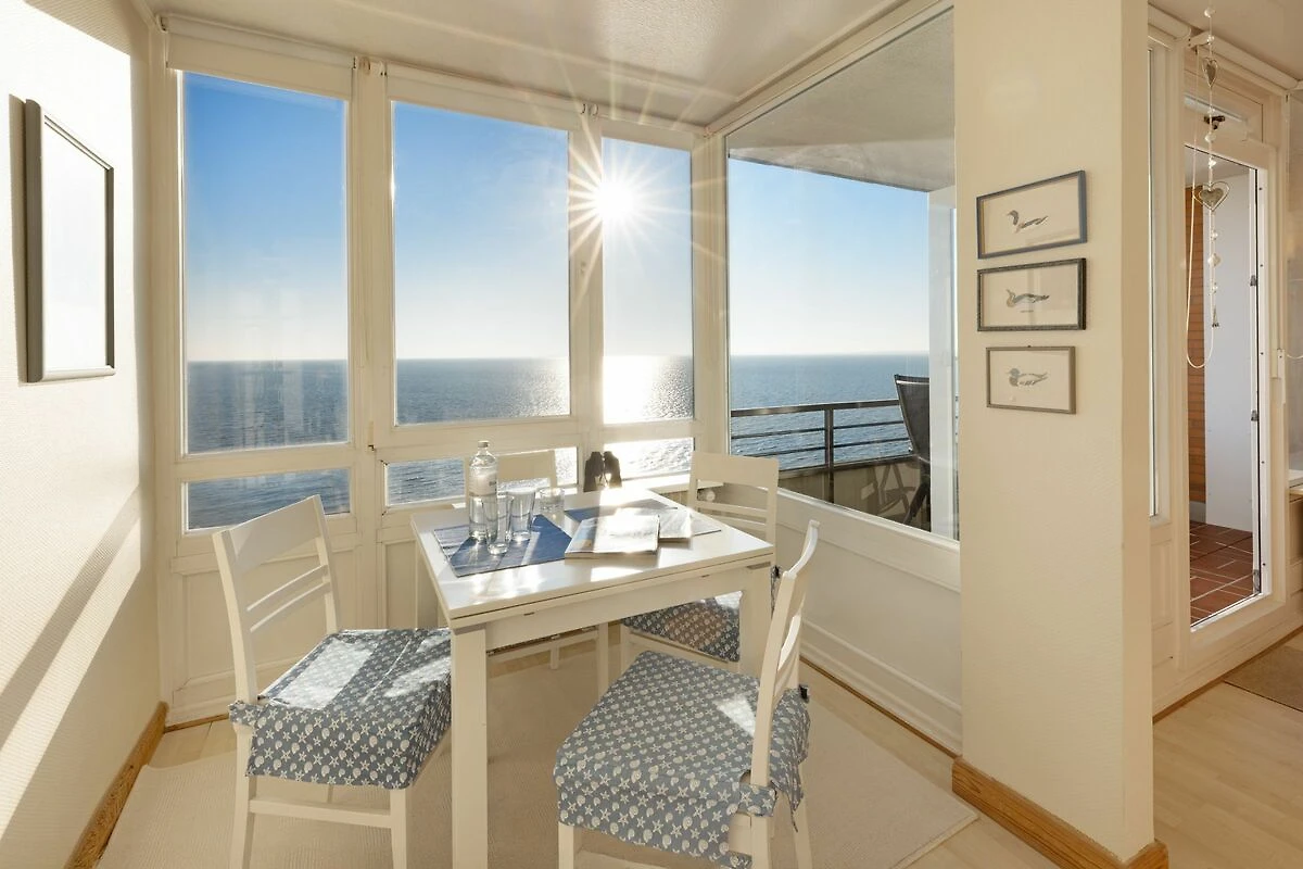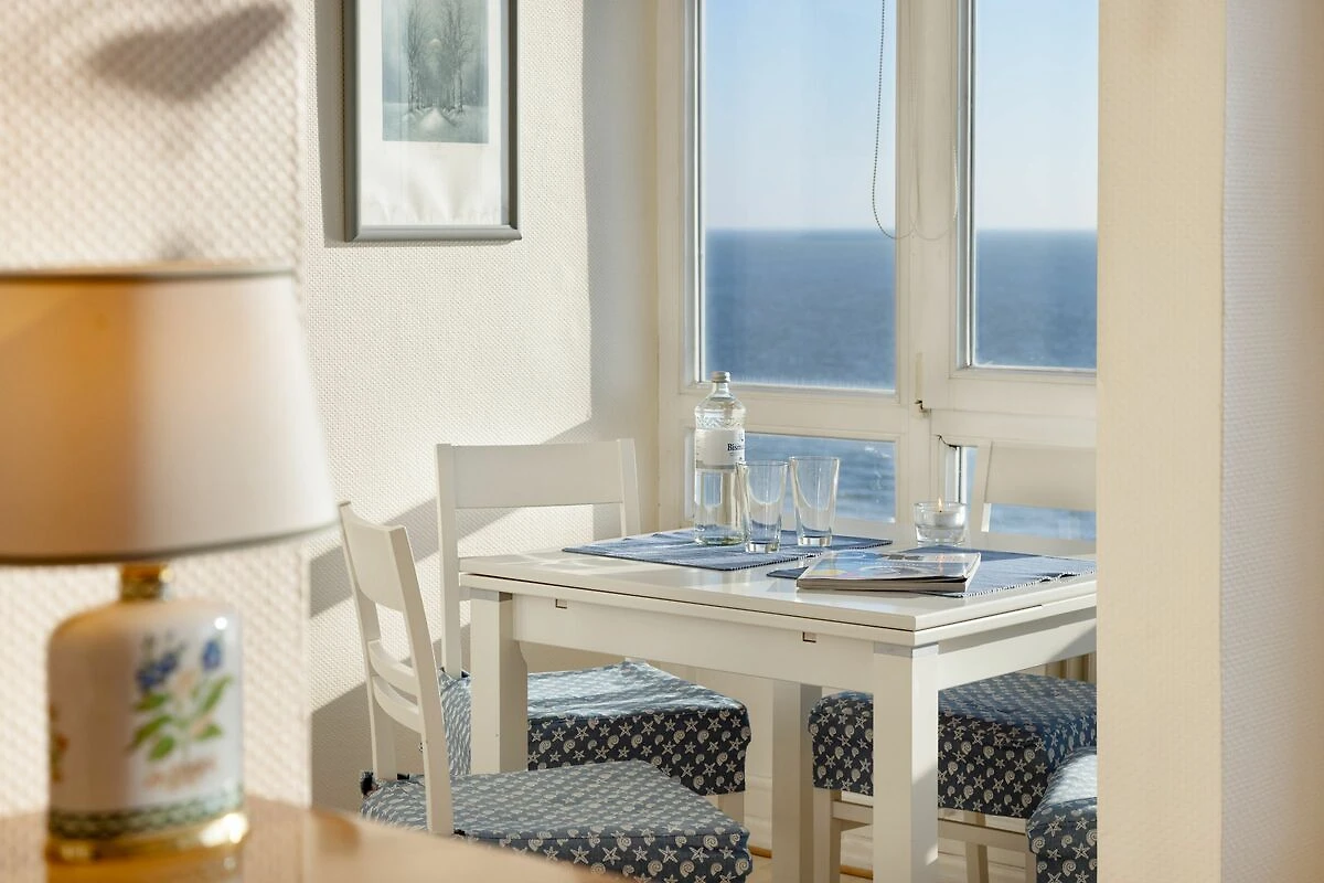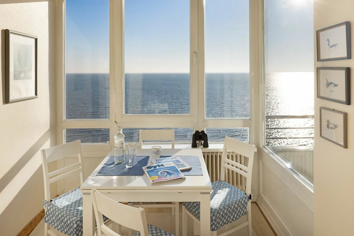 Der offene Wohnbereich ist hell und freundlich gestaltet und mit einer gemütlichen Sofaecke, Sesseln sowie einem Essplatz ausgestattet. Große Fenster sorgen für viel Tageslicht. Der geschlossene Balkon mit Balkonmöbeln bietet einen windgeschützten Platz, um die frische Seeluft und den Ausblick zu genießen.
