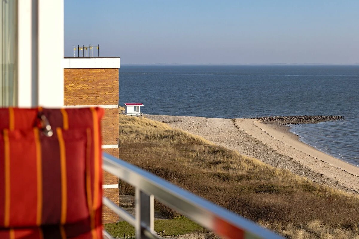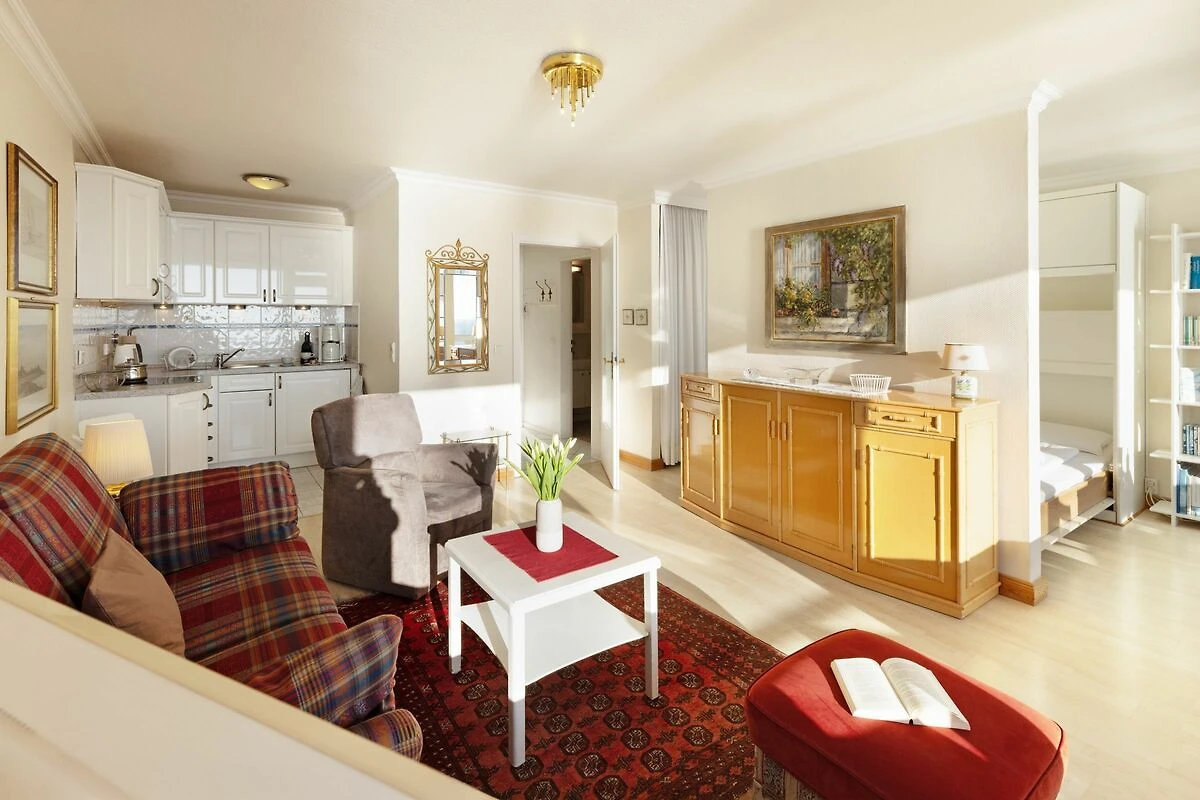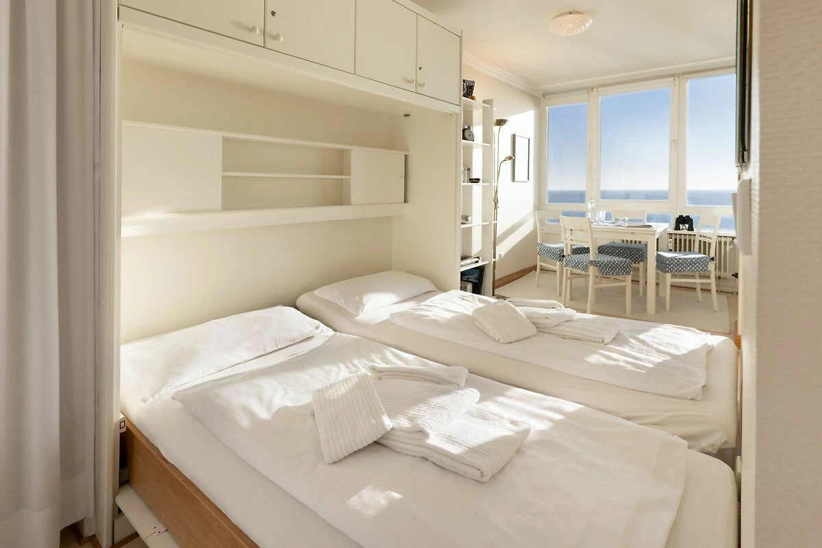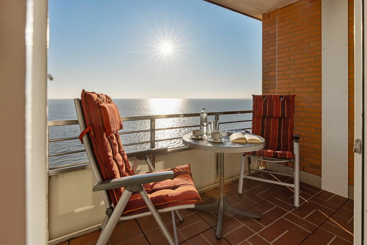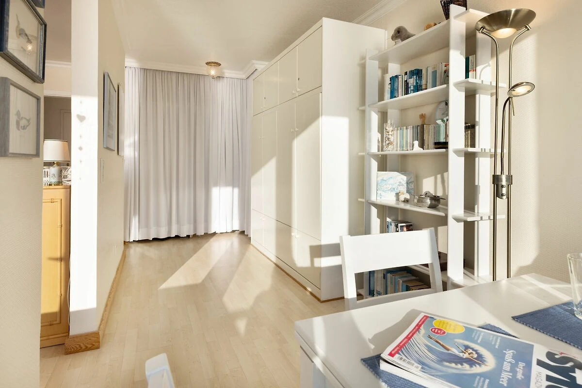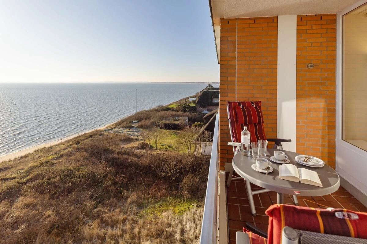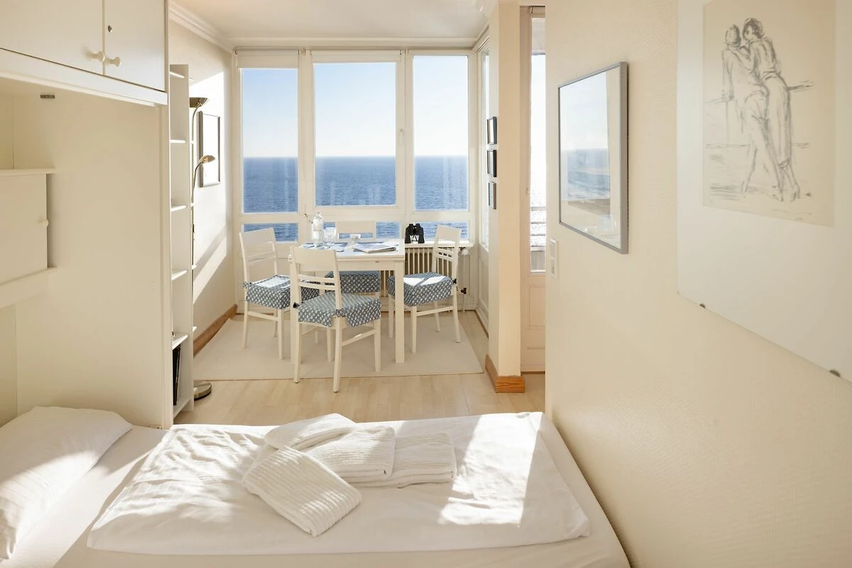 Der offene Wohnbereich ist hell und freundlich gestaltet und mit einer gemütlichen Sofaecke, Sesseln sowie einem Essplatz ausgestattet. Große Fenster sorgen für viel Tageslicht. Der geschlossene Balkon mit Balkonmöbeln bietet einen windgeschützten Platz, um die frische Seeluft und den Ausblick zu genießen.