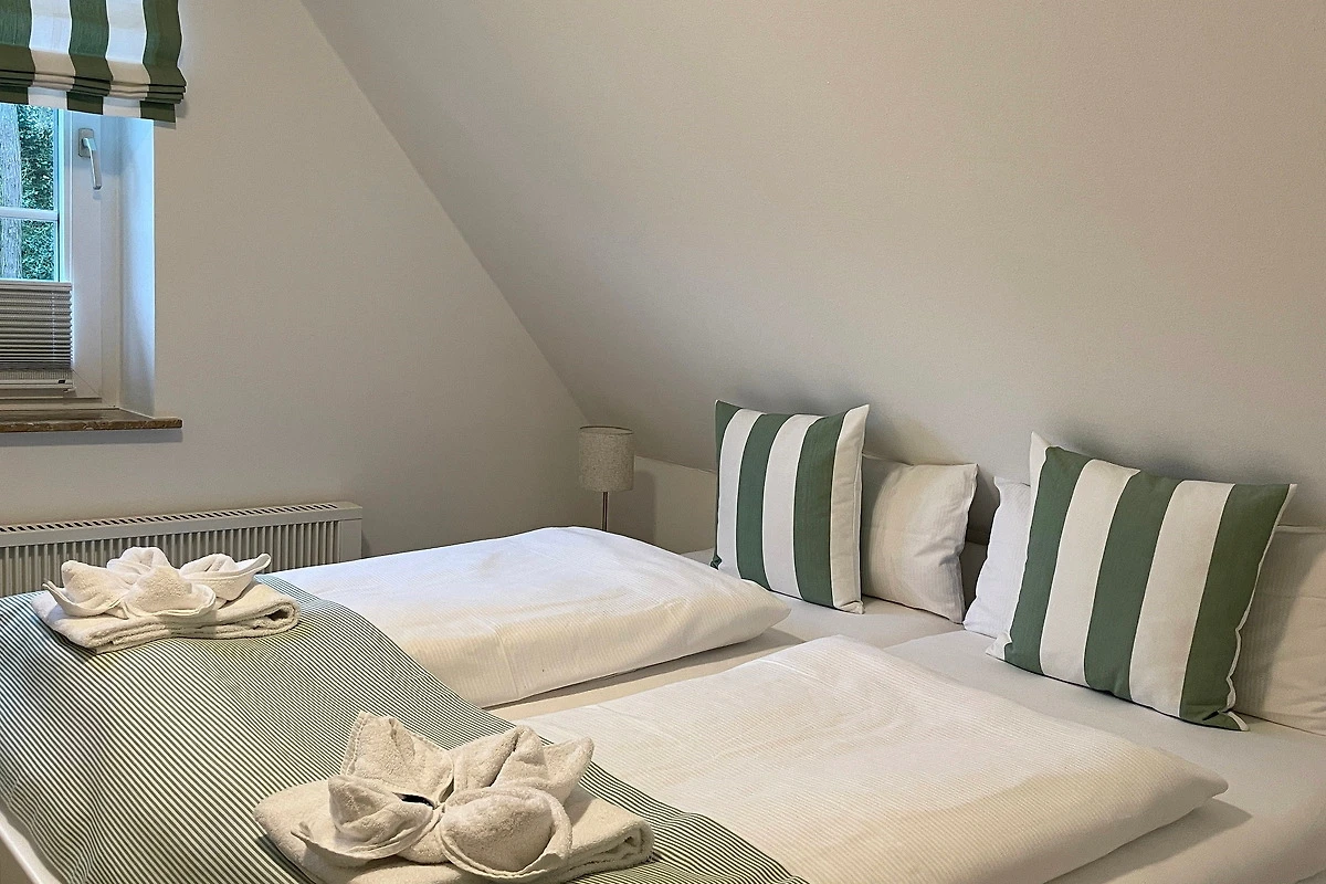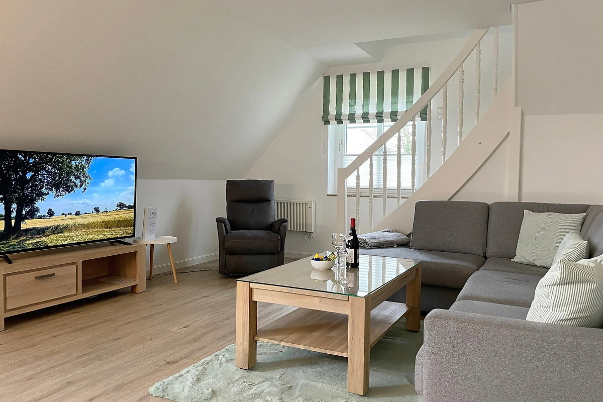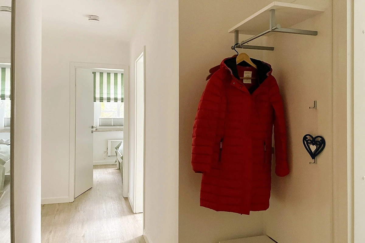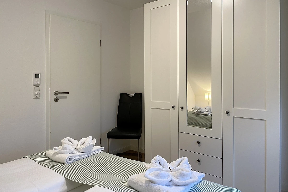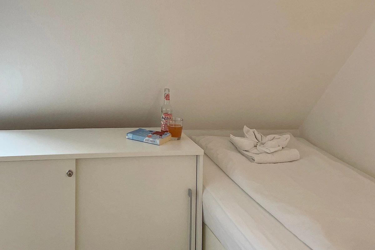 Das Haus am Stadtpark gelegen im Grünstreifen unweit des Stadtparkes mit seinen schönen Waldwegen und dem Abenteuerspielplatz Löwenhöhle ist eine gepflegte Anlage mit einem weitläufigen Grundstück. Hier befindet sich für alle Gäste der Anlage neben einem kleinen Spielplatz und einer Sitzecke auch die Möglichkeit gegen eine geringe Gebühr Waschmaschine und Trockner zu benutzen und die Fahrräder in dem Keller unterzustellen. Eine finnische Dampfsauna (gegen Gebühr) und ein kleiner Fitnessraum laden zum Verweilen ein. Viele Gäste geniessen die ruhige Lage, wobei Sie einen Bäcker, einen Schlachter, den kleinen gut sortierten Einkaufsladen und natürlich den Strand und das Meer fussläufig erreichen können. Die Obergeschosswohnung im Haus am Stadtpark ist eine ideale Wohnung für Familien, welche sich über zwei Etagen erstreckt. Im 1. Obergeschoss befindet sich das moderne Badezimmer mit grosszügiger Dusche, die beiden Schlafräume und der geräumige Wohnschlafraum mit integrierter Küche und Essplatz. Das Wohnzimmer verfügt über eine Sitzgarnitur (Schlafcouch 170 x 190 cm), einen elektrisch verstellbaren Relax Sessels , Smart-TV, WLAN und auf der anderen Seite des Raumes befindet sich die gut ausgestattete Küche mit einem Essplatz. Von hier aus gelangen Sie auf einen kleinen Balkon, der für 2 bis 3 Personen ausgerichtet ist. Ruhige Nächte verbringen Sie in den beiden Schlafzimmern. Das Elternschlafzimmer ist mit einem Doppelbett (180 x 200 cm) und einem Kleiderschrank ausgestattet, wobei das kleine Kinderzimmer ein Bett (90 x 200 cm) sowie eine Kommode vorweist.