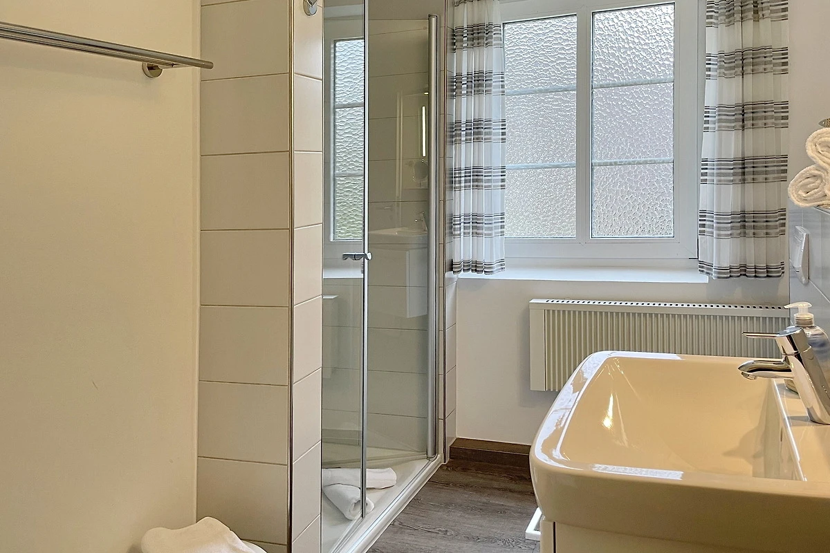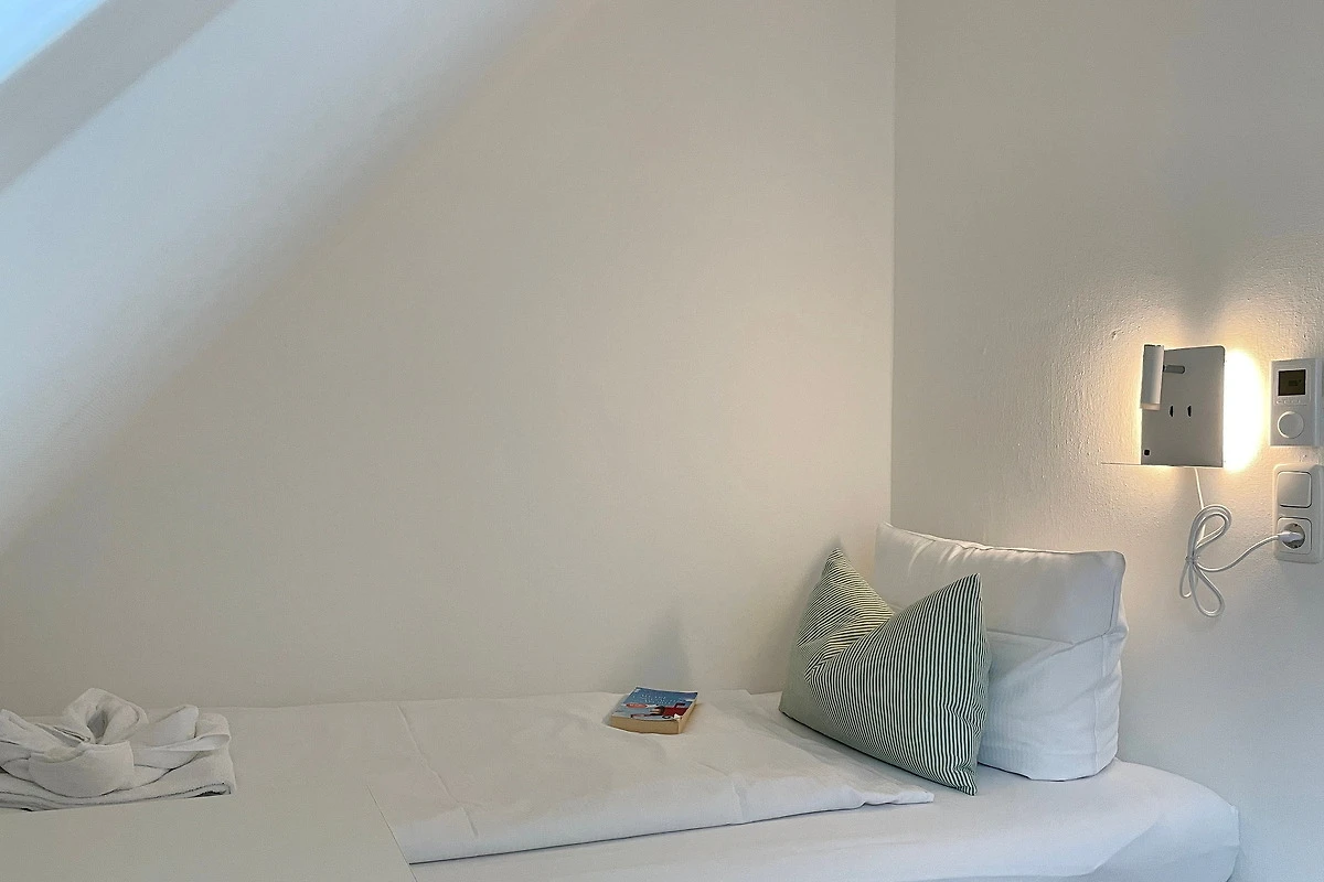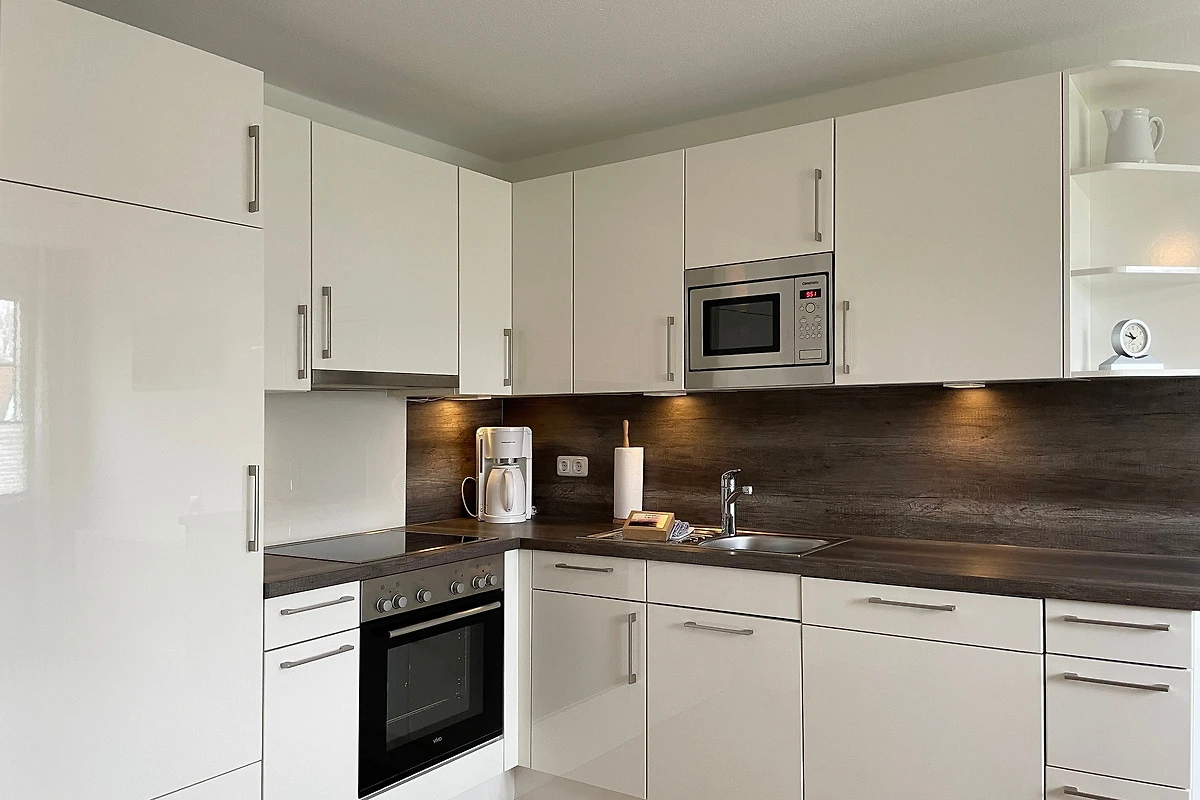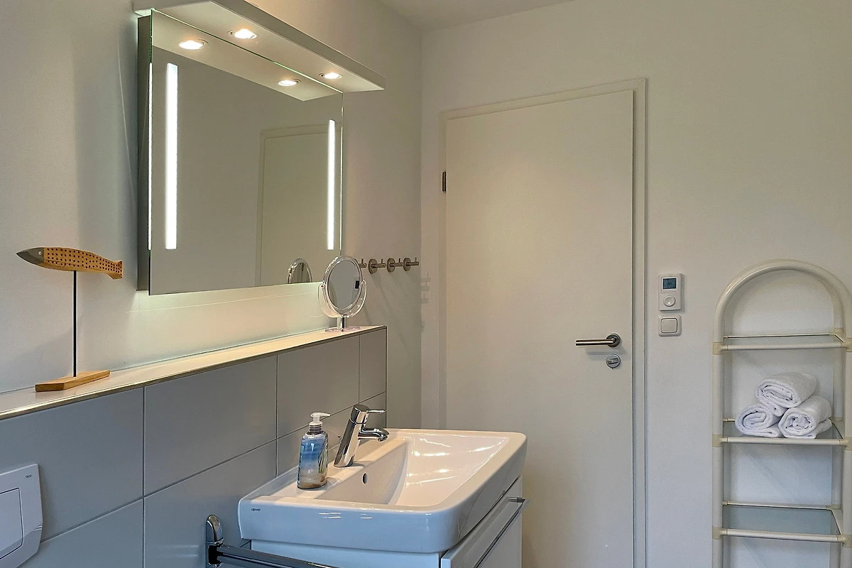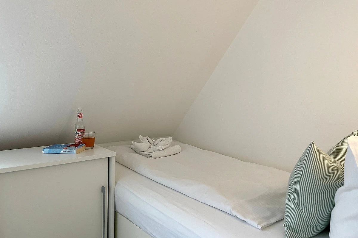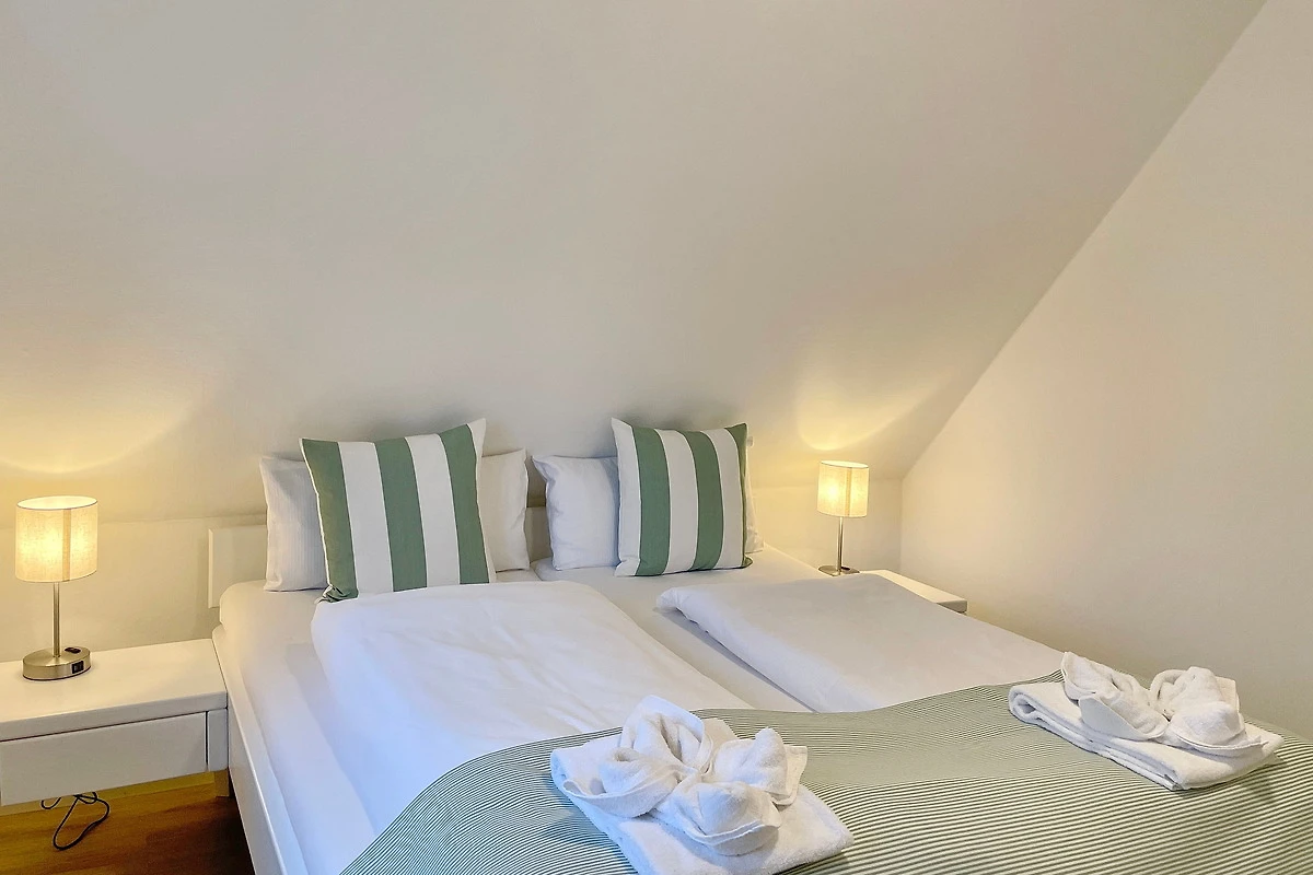 Das Haus am Stadtpark gelegen im Grünstreifen unweit des Stadtparkes mit seinen schönen Waldwegen und dem Abenteuerspielplatz Löwenhöhle ist eine gepflegte Anlage mit einem weitläufigen Grundstück. Hier befindet sich für alle Gäste der Anlage neben einem kleinen Spielplatz und einer Sitzecke auch die Möglichkeit gegen eine geringe Gebühr Waschmaschine und Trockner zu benutzen und die Fahrräder in dem Keller unterzustellen. Eine finnische Dampfsauna (gegen Gebühr) und ein kleiner Fitnessraum laden zum Verweilen ein. Viele Gäste geniessen die ruhige Lage, wobei Sie einen Bäcker, einen Schlachter, den kleinen gut sortierten Einkaufsladen und natürlich den Strand und das Meer fussläufig erreichen können. Die Obergeschosswohnung im Haus am Stadtpark ist eine ideale Wohnung für Familien, welche sich über zwei Etagen erstreckt. Im 1. Obergeschoss befindet sich das moderne Badezimmer mit grosszügiger Dusche, die beiden Schlafräume und der geräumige Wohnschlafraum mit integrierter Küche und Essplatz. Das Wohnzimmer verfügt über eine Sitzgarnitur (Schlafcouch 170 x 190 cm), einen elektrisch verstellbaren Relax Sessels , Smart-TV, WLAN und auf der anderen Seite des Raumes befindet sich die gut ausgestattete Küche mit einem Essplatz. Von hier aus gelangen Sie auf einen kleinen Balkon, der für 2 bis 3 Personen ausgerichtet ist. Ruhige Nächte verbringen Sie in den beiden Schlafzimmern. Das Elternschlafzimmer ist mit einem Doppelbett (180 x 200 cm) und einem Kleiderschrank ausgestattet, wobei das kleine Kinderzimmer ein Bett (90 x 200 cm) sowie eine Kommode vorweist.