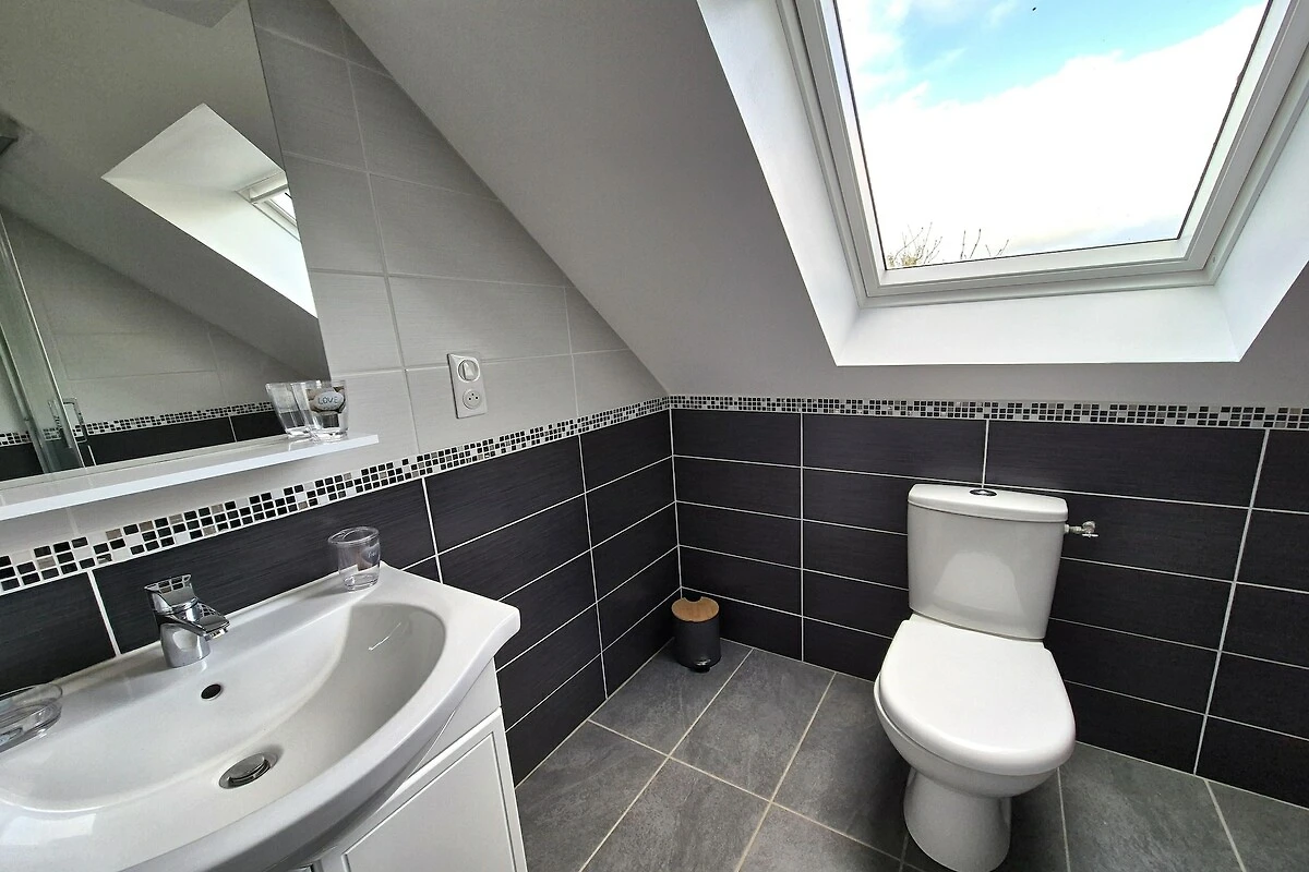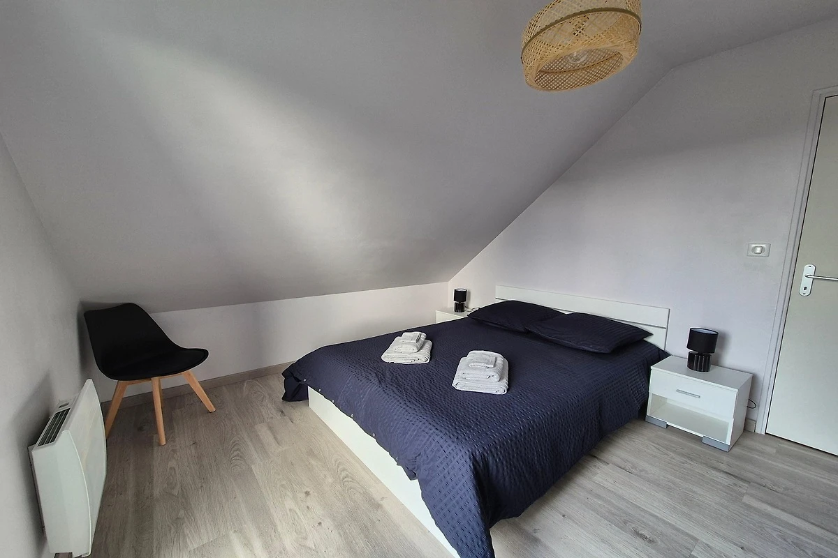 Das Haus verfügt über zwei komfortable Schlafzimmer, ein funktionales Badezimmer und ein helles Wohnzimmer mit voll ausgestatteter Küche und einem einladenden Essbereich. Alles ist darauf ausgerichtet, dass Sie sich wie zu Hause fühlen – egal ob für einen Kurzurlaub oder einen längeren Aufenthalt. Draußen erwartet Sie ein privater, umzäunter 175 m² großer Garten, perfekt zum Essen im Freien, Entspannen oder um Kinder sicher spielen zu lassen. Ein großer, nicht umzäunter 975 m² großer Gemeinschaftsgarten rundet das Angebot ab und bietet zusätzliche Grünfläche in ruhiger, grüner Umgebung. Ein idealer Ausgangspunkt, um die Region, ihre Strände, Wanderwege und den Charme der bretonischen Küste zu erkunden und das ländliche Leben hautnah zu erleben.