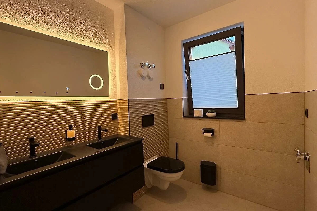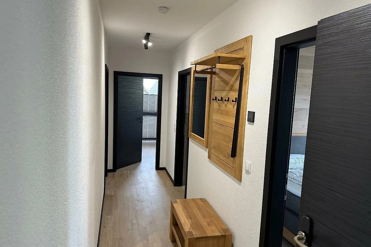 Das Bad ist mit Dusche, Waschbecken, Spiegel und Haartrockner versehen. Die geschmackvolle Einrichtung mit hochwertigem Holzfußboden und bequemen Sitzmöbeln schafft eine angenehme Atmosphäre für gemeinsame Stunden im Wohnzimmer.