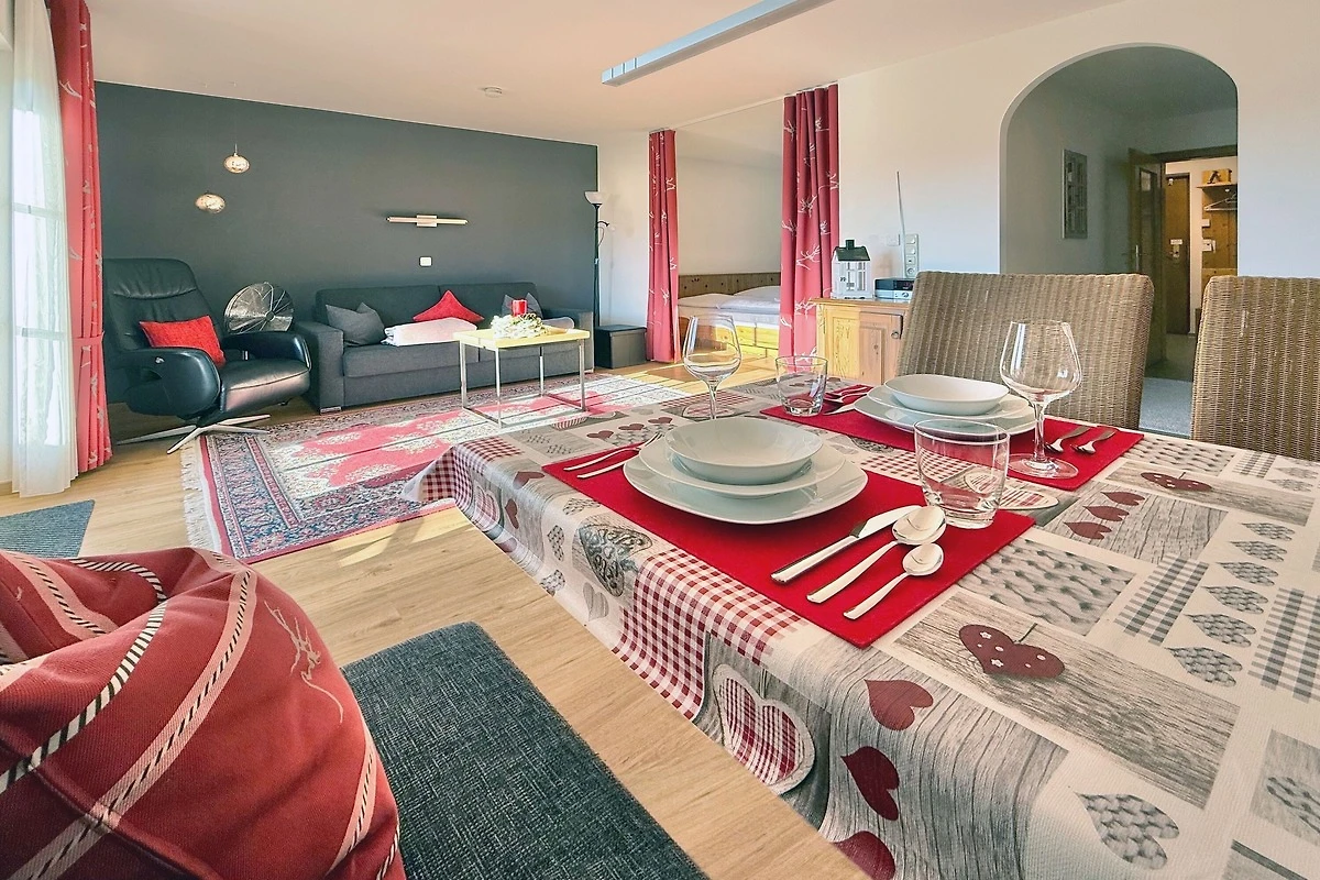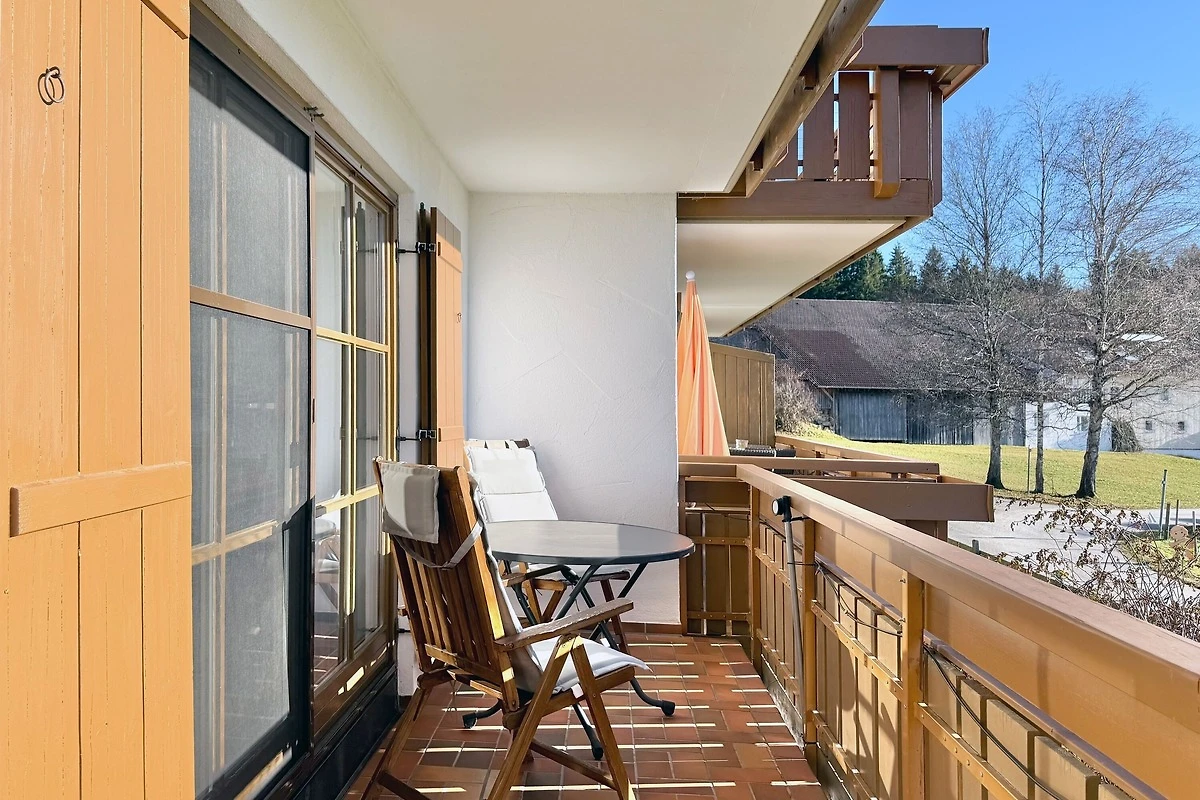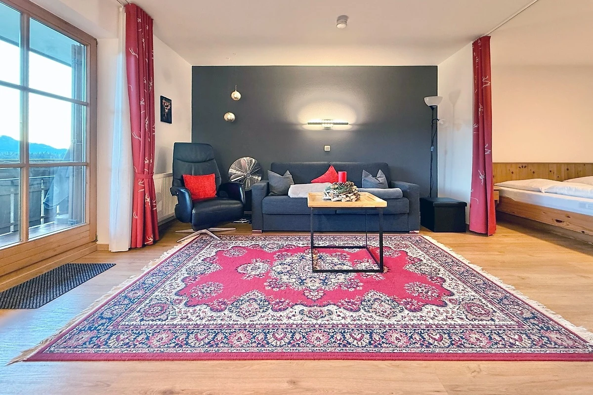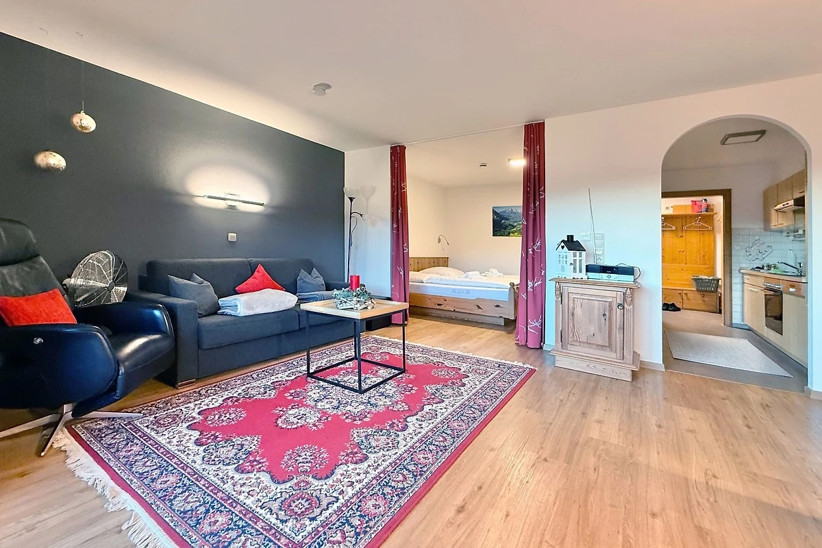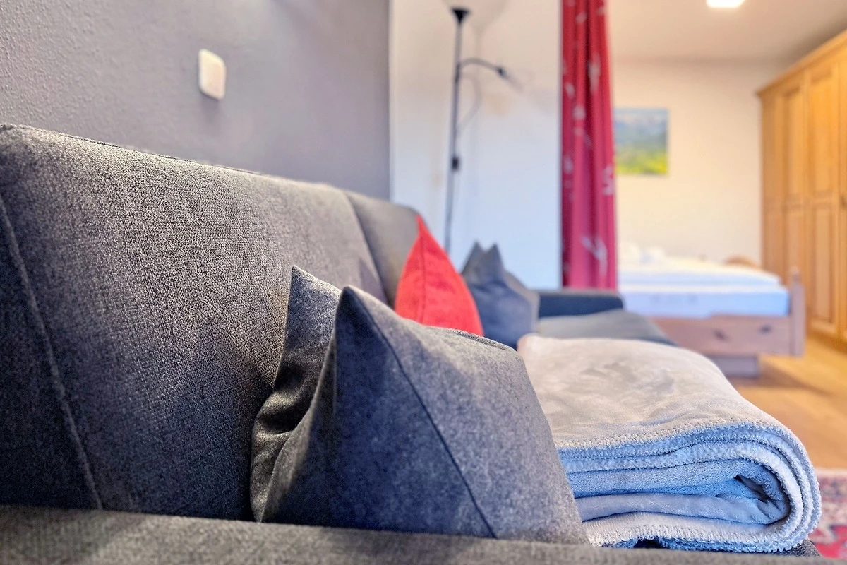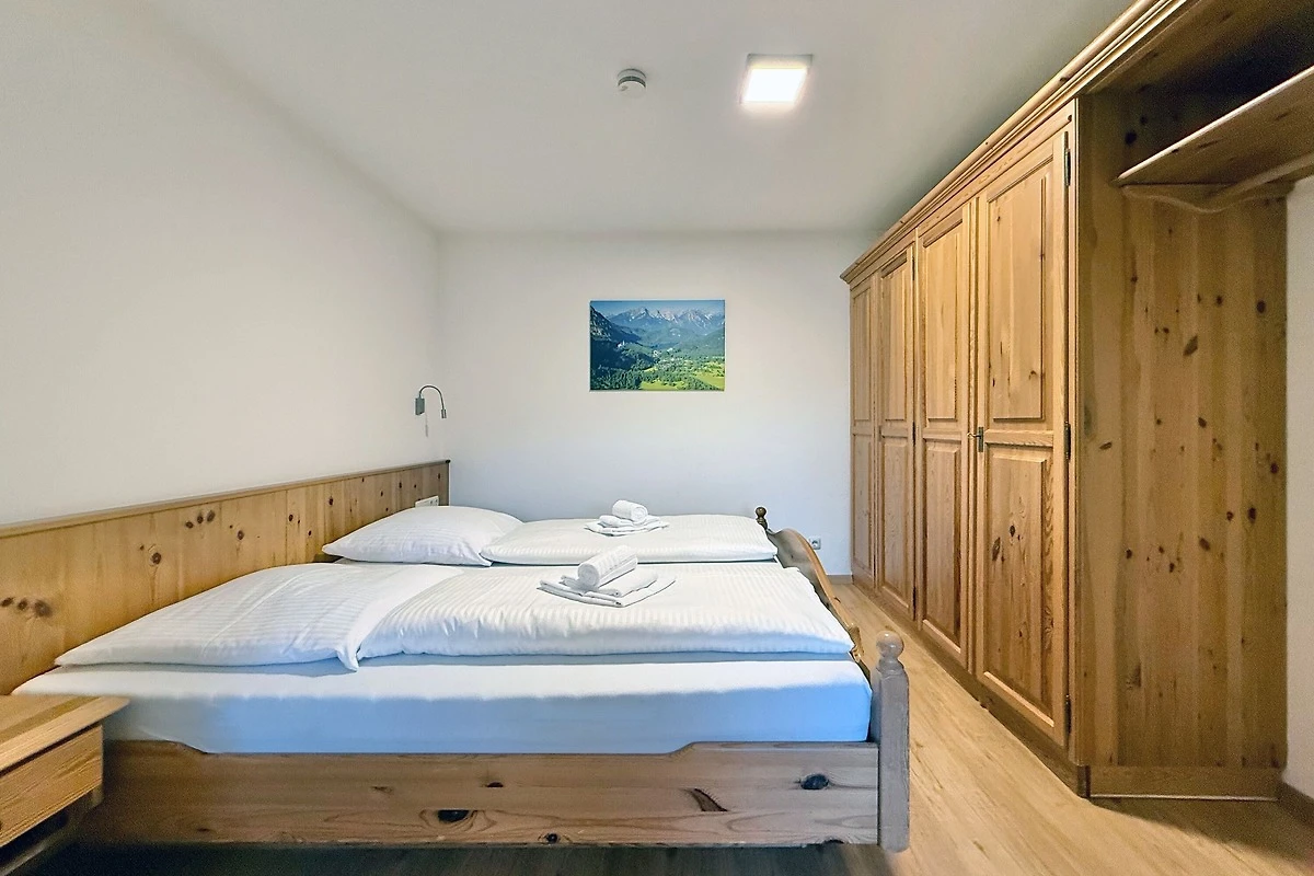 Die Ferienwohnung verfügt über einen offen gestalteten Schlafbereich, einen gemütlichen Wohnbereich sowie ein modernes Badezimmer. Das komfortable Doppelbett sorgt für angenehmen Schlafkomfort. Vom Balkon aus geniessen Sie entspannte Stunden an der frischen Allgäuer Luft und lassen den Tag ruhig ausklingen.