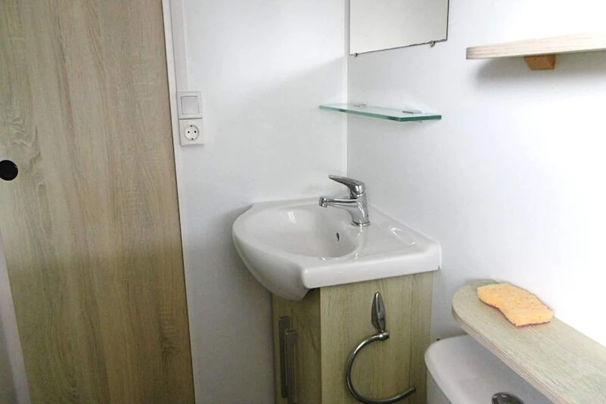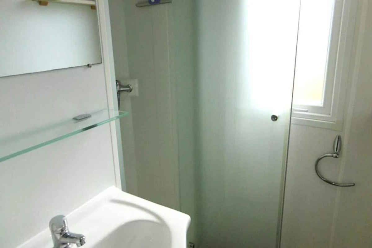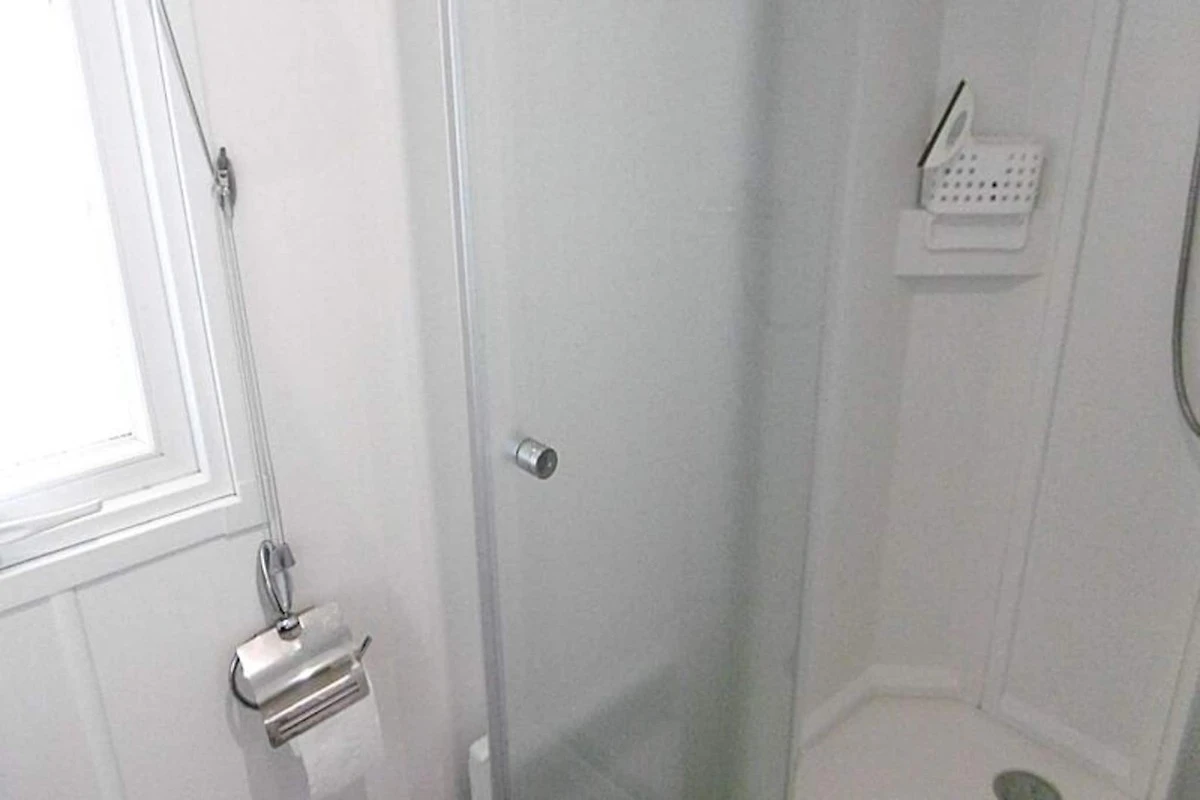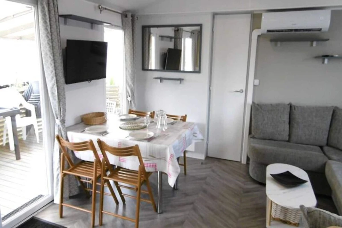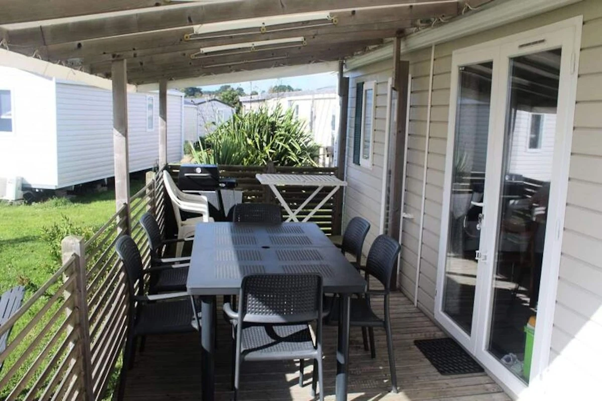 Das Mobilheim ist durchdacht gestaltet und bietet Platz für bis zu sechs Gäste. Das gemütliche Wohnzimmer mit einem bequemen Sofa führt zu einer voll ausgestatteten Küchenzeile, ideal für die Zubereitung frischer Meeresfrüchte aus der Region. Das Hauptschlafzimmer verfügt über ein Doppelbett und ein eigenes Badezimmer, während zwei weitere Schlafzimmer jeweils mit zwei Einzelbetten ausgestattet sind. Ein zweites Badezimmer und ein separates WC sorgen für Komfort für Familien oder Gruppen. Moderne Annehmlichkeiten wie Kühlschrank, Mikrowelle und Kaffeemaschine bieten Ihnen alle Annehmlichkeiten von zu Hause.