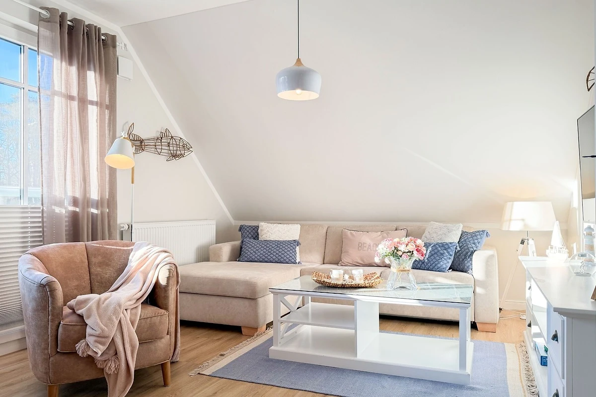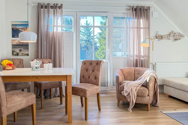 Ankommen, aufatmen, zur Ruhe kommen – die Kajüte 4 ist Ihr stilvoller Rückzugsort für eine entspannte Auszeit an der Ostsee. Hell, modern und mit viel Liebe zum Detail eingerichtet, verbindet diese hochwertige Neubau-Ferienwohnung maritimes Flair mit zeitgemässem Wohnkomfort. Auf rund 48 m² geniessen bis zu zwei Erwachsene und ein Kleinkindeine harmonische Atmosphäre – umgeben von unberührter Natur und nur wenige Schritte vom Strand und dem Darsser Wald entfernt.