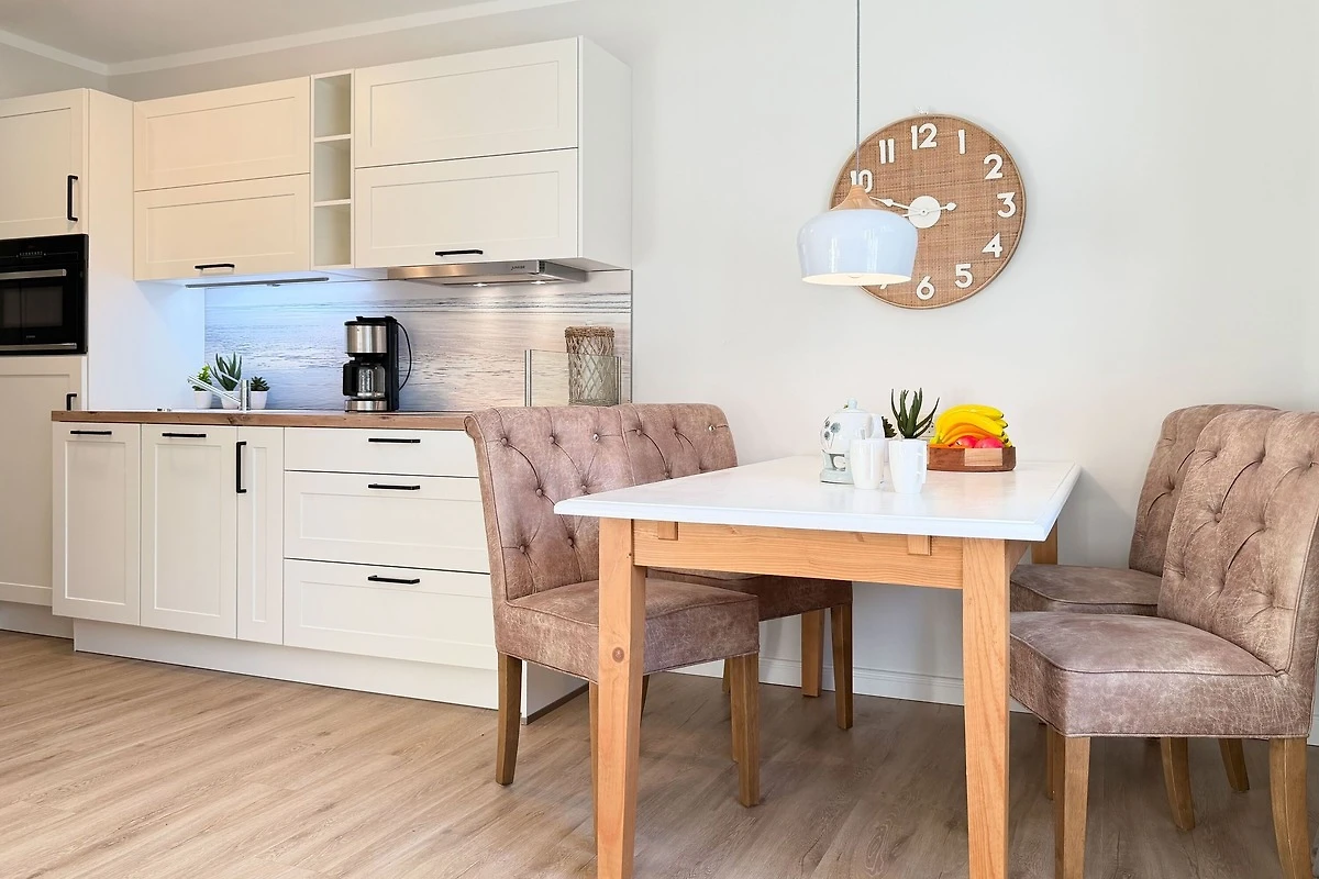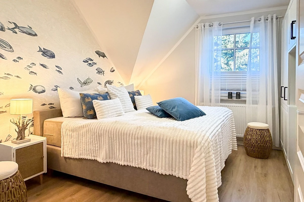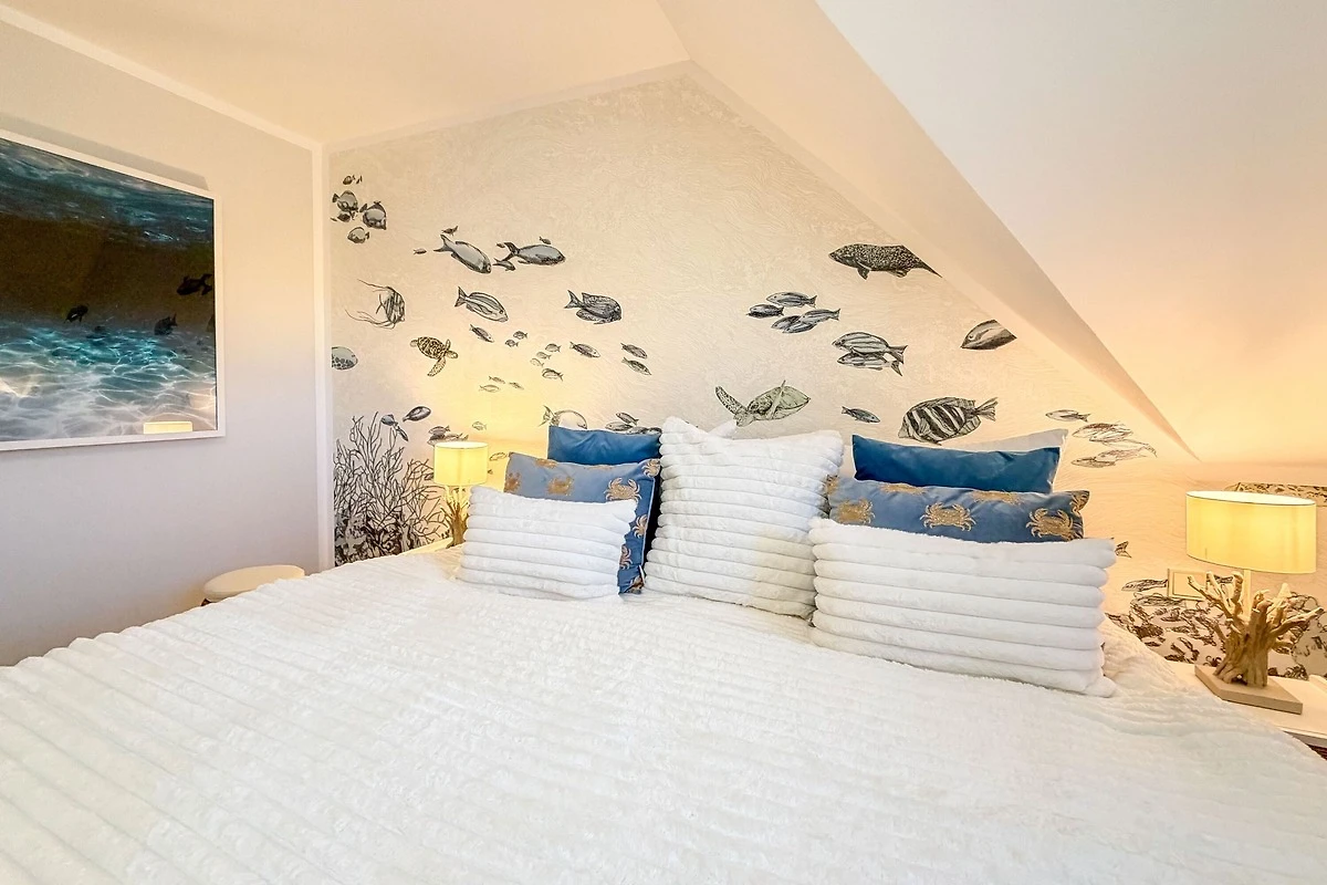 Die Ferienwohnung empfängt Sie mit einer beruhigenden Atmosphäre und durchdachter Raumaufteilung. Ein separater Flur schafft zusätzliche Privatsphäre, während die bodentiefen Fenster den Blick ins Grüne freigeben. Ob Sie den Tag sportlich im Nationalpark verbringen oder einfach die Seele auf dem Balkon baumeln lassen – in der Kajüte 4 finden Sie die perfekte Balance aus Aktivität und Erholung.