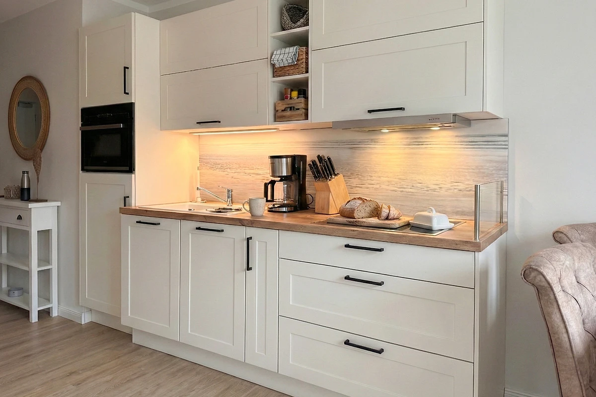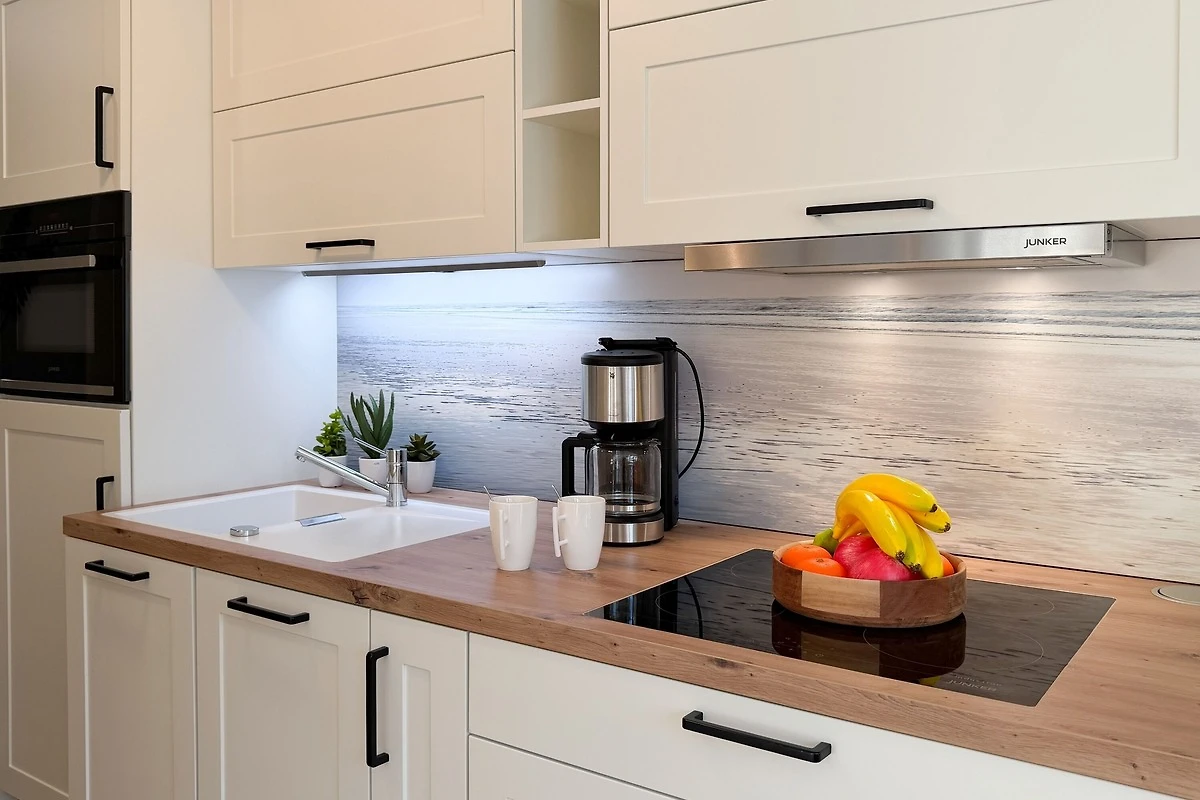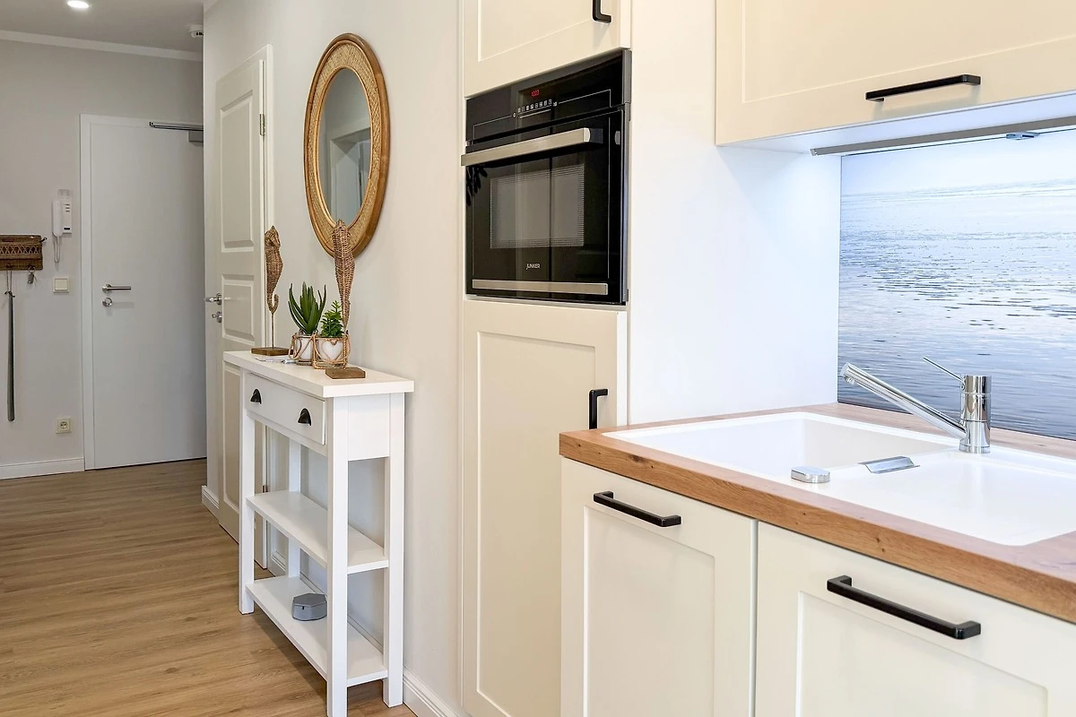 Voll ausgestattete Komfort-Küche: Mit Backofen, Spülmaschine und hochwertigen Utensilien – hier macht das Kochen auch im Urlaub Freude.