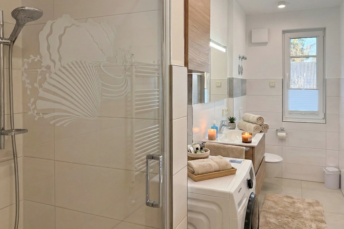 Modernes Badezimmer: Edles Design mit bodengleicher Dusche und einer praktischen Waschmaschine für Ihre Urlaubsgarderobe.