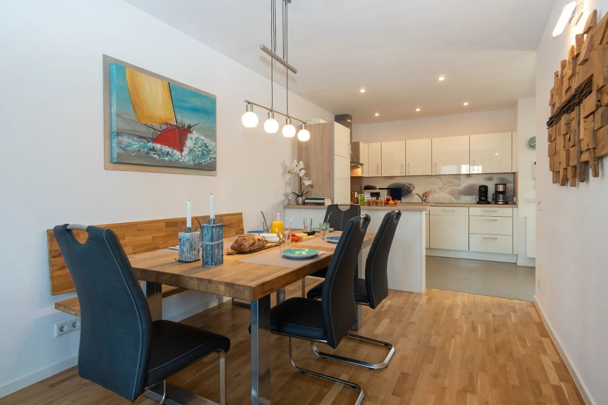 Ihr Urlaubsdomizil befindet sich in der ersten Etage der Anlage am Wilhelmsplatz und verfügt auf 2 Etagen über einen lichtdurchfluteten Wohn- & Essbereich, grosszügigen Küchenbereich mit vielen Extras (z.B. Thermomix, Geschirrspülmaschine, Backofen und Mikrowelle) und Gäste WC. Im Obergeschoss finden Sie 2 Schlafzimmern mit jeweils Terrassenzugang und einem Badezimmer mit Badewanne. Beide Schlafzimmer verfügen über ein gemütliches Doppelbett. Zwei weitere Schlafplätze sind auf dem bequemen Schlafsofa im Wohnzimmer.