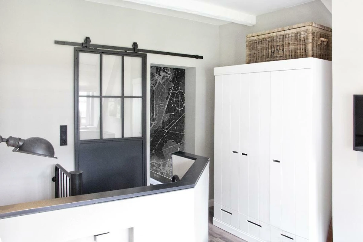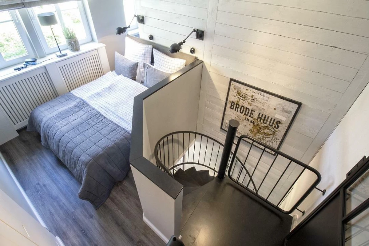 Im Obergeschoss befindet sich der offene Schlafbereich mit komfortablem Doppelbett (ca. 160 x 200 cm) und zusätzlichem Flatscreen-TV. Ein besonderes Highlight ist die separate, innenliegende Sauna aus Echtholz – ideal für wohltuende Wellnessstunden nach einem Tag am Meer. Aus dem Schlafzimmerfenster geniessen Sie einen seitlichen Ostseeblick.