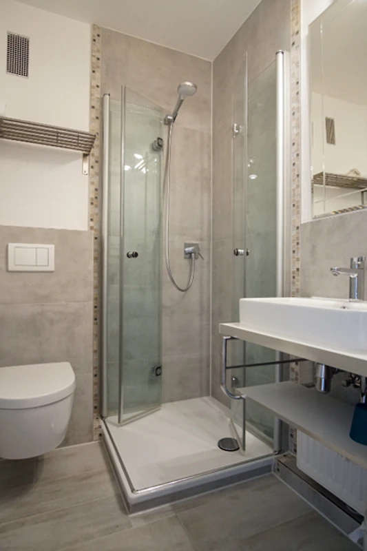 Das Schlafzimmer im hinteren Bereich ist mit einem komfortablen Doppelbett (ca. 140 x 200 cm) ausgestattet. Der Eingangsbereich führt Sie zum praktischen, gut durchdachten Duschbad.