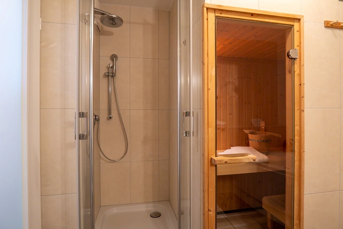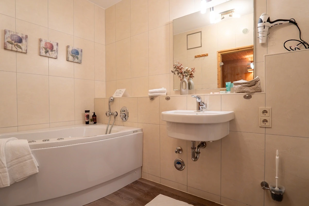 Beide Schlafzimmer sind ein wahrer Rückzugsort der Ruhe, ausgestattet mit einem komfortablen Doppelbett (ca. 180 x 200 cm), in dem Sie nach einem erlebnisreichen Tag in der Umgebung wunderbar entspannen können. Der Flur im Eingangsbereich führt Sie weiter zum Wellnessbad, das mit einer Badewanne und einer eigenen Sauna für entspannende Stunden sorgt – der perfekte Ort, um sich zu erholen und neue Energie zu tanken.