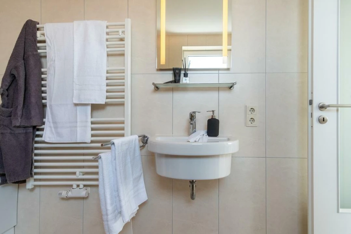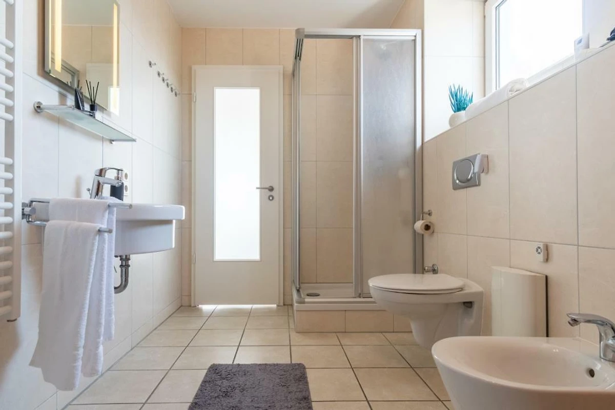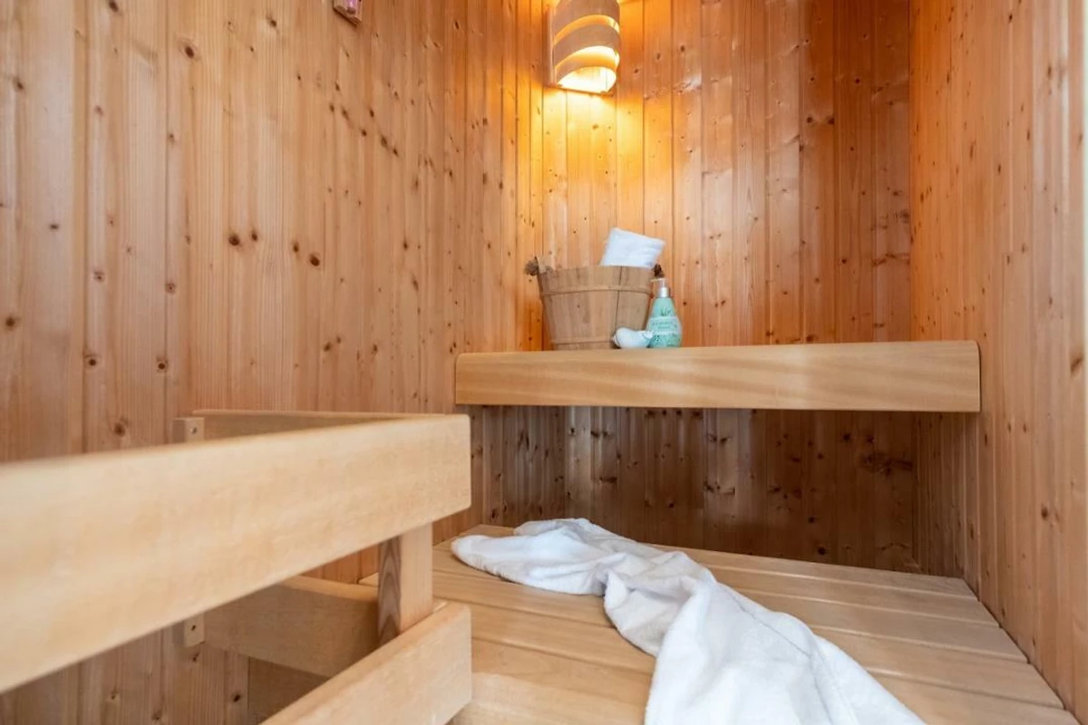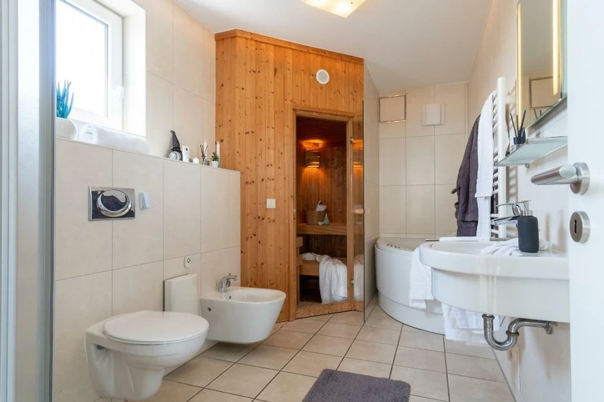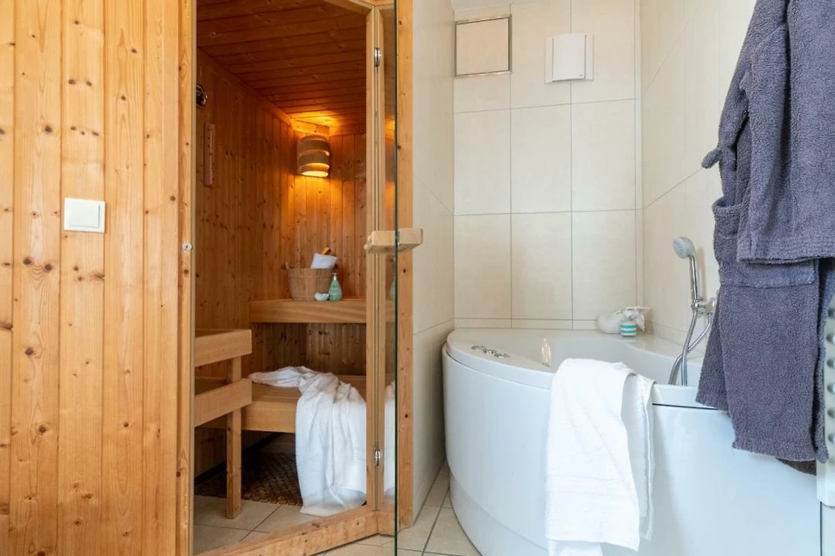 Das Schlafzimmer ist ein wahrer Rückzugsort der Ruhe, ausgestattet mit einem komfortablen Doppelbett (ca. 180 x 200 cm), in dem Sie nach einem erlebnisreichen Tag in der Umgebung wunderbar entspannen können. Im Wohnzimmer bietet das Schlafsofa einen zusätzlichen Schlafplatz. Der Flur im Eingangsbereich führt Sie weiter zum Wellnessbad, das mit einer Badewanne und einer eigenen Sauna für entspannende Stunden sorgt – der perfekte Ort, um sich zu erholen und neue Energie zu tanken.