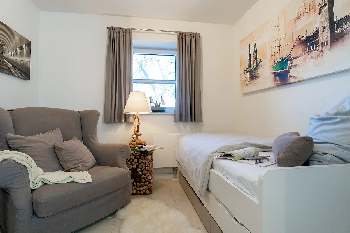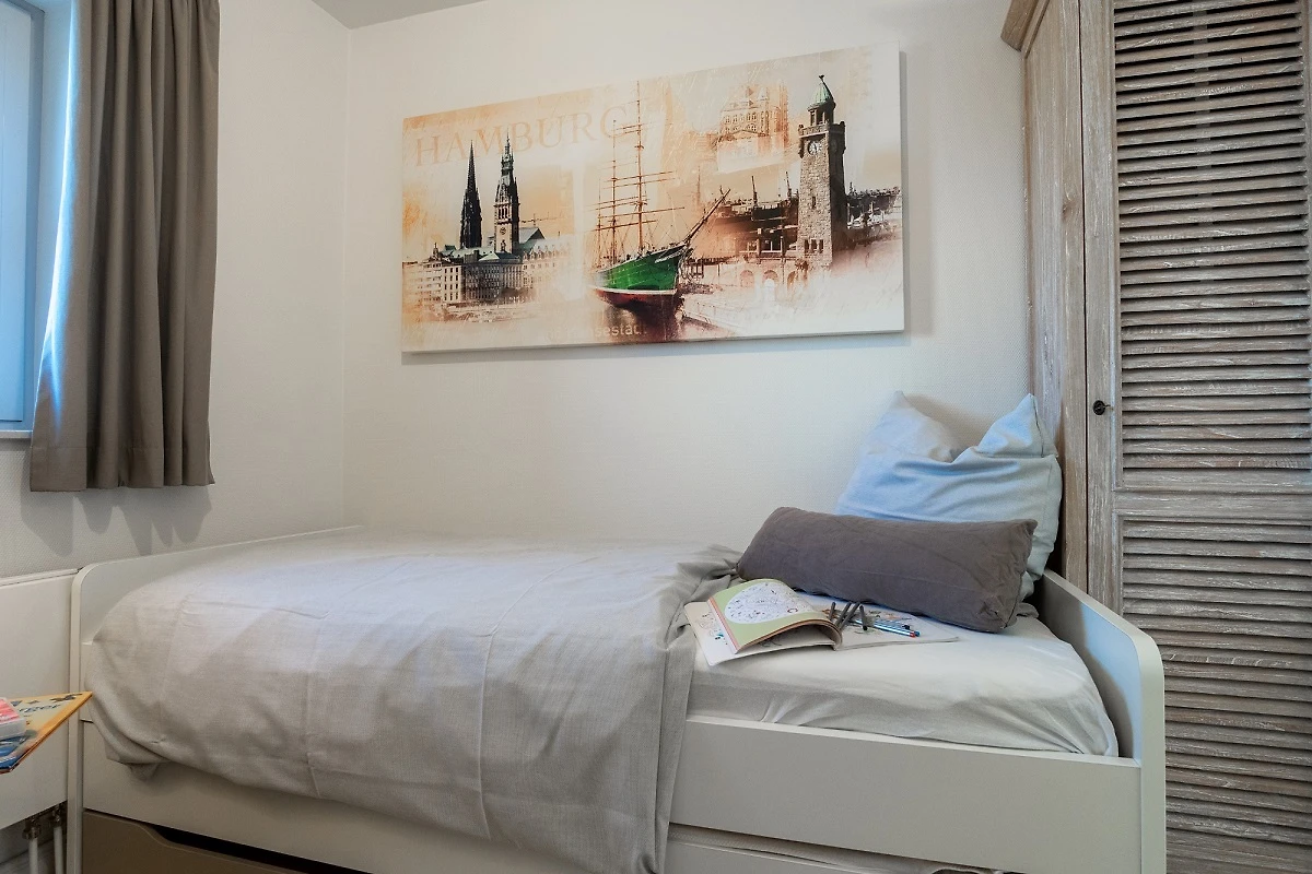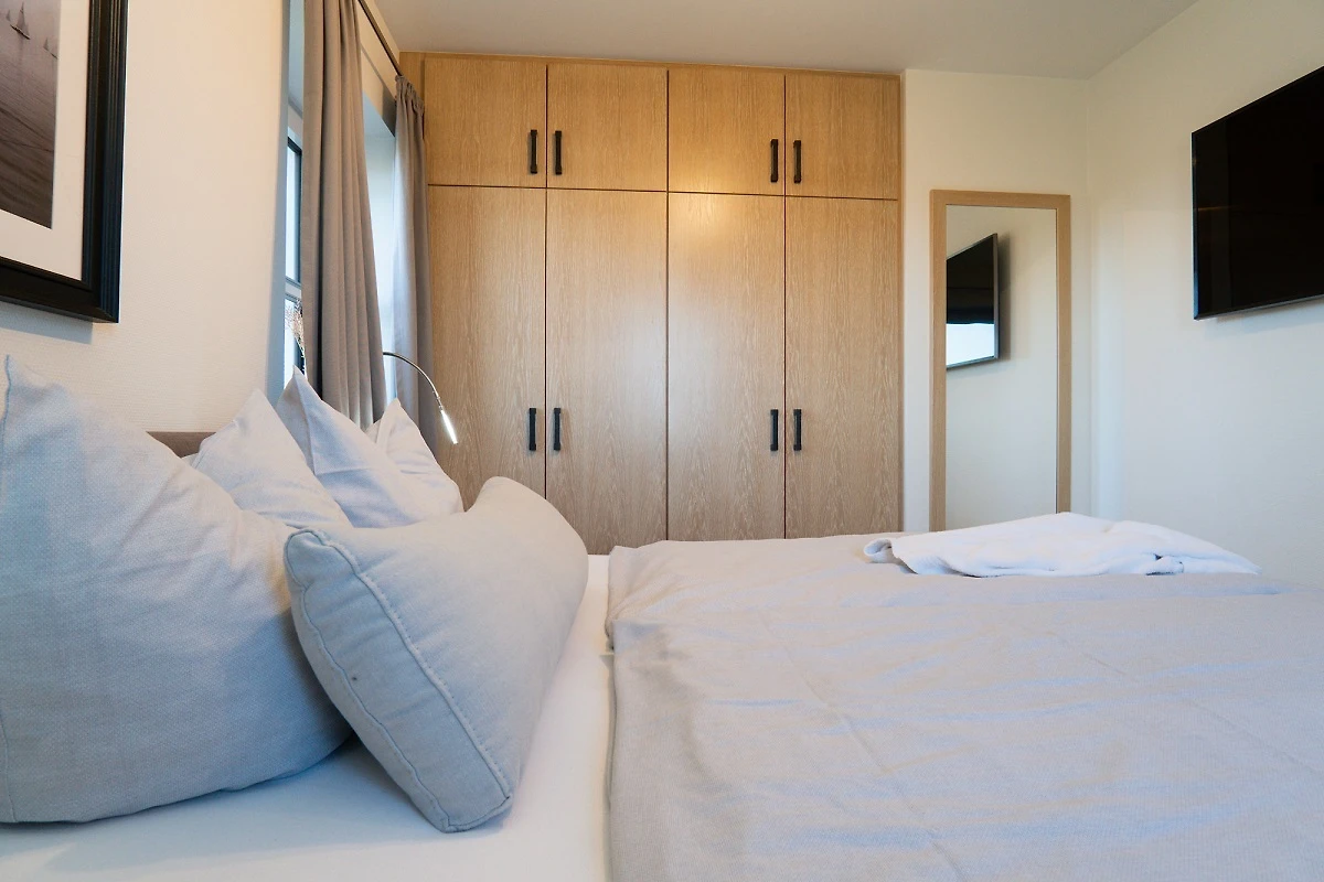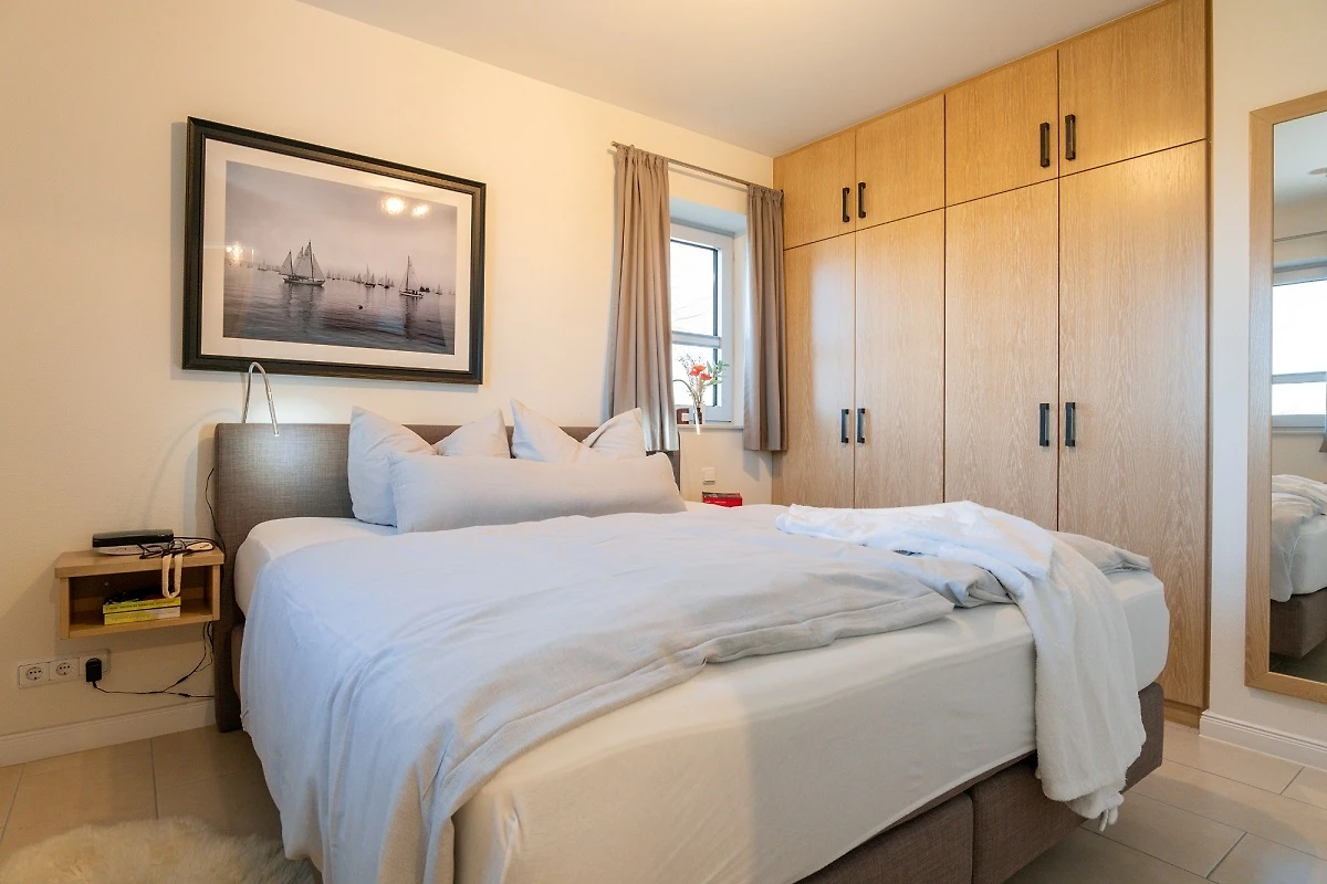 Das grosse Schlafzimmer verfügt über ein gemütliches Boxspringbett (ca. 180*200cm) und einem eigenen TV. Das zweite Schlafzimmer ist mit einem komfortablen Kojenbett (oben ca. 90*200cm, unten ca. 80*190cm) und eigenem TV eingerichtet. Beide Schlafzimmer sind mit Plissees ausgestattet. Das Badezimmer ist mit einer bodengleichen Dusche mit Glastrennwand, sowie einer eigenen Waschmaschine ausgestattet.