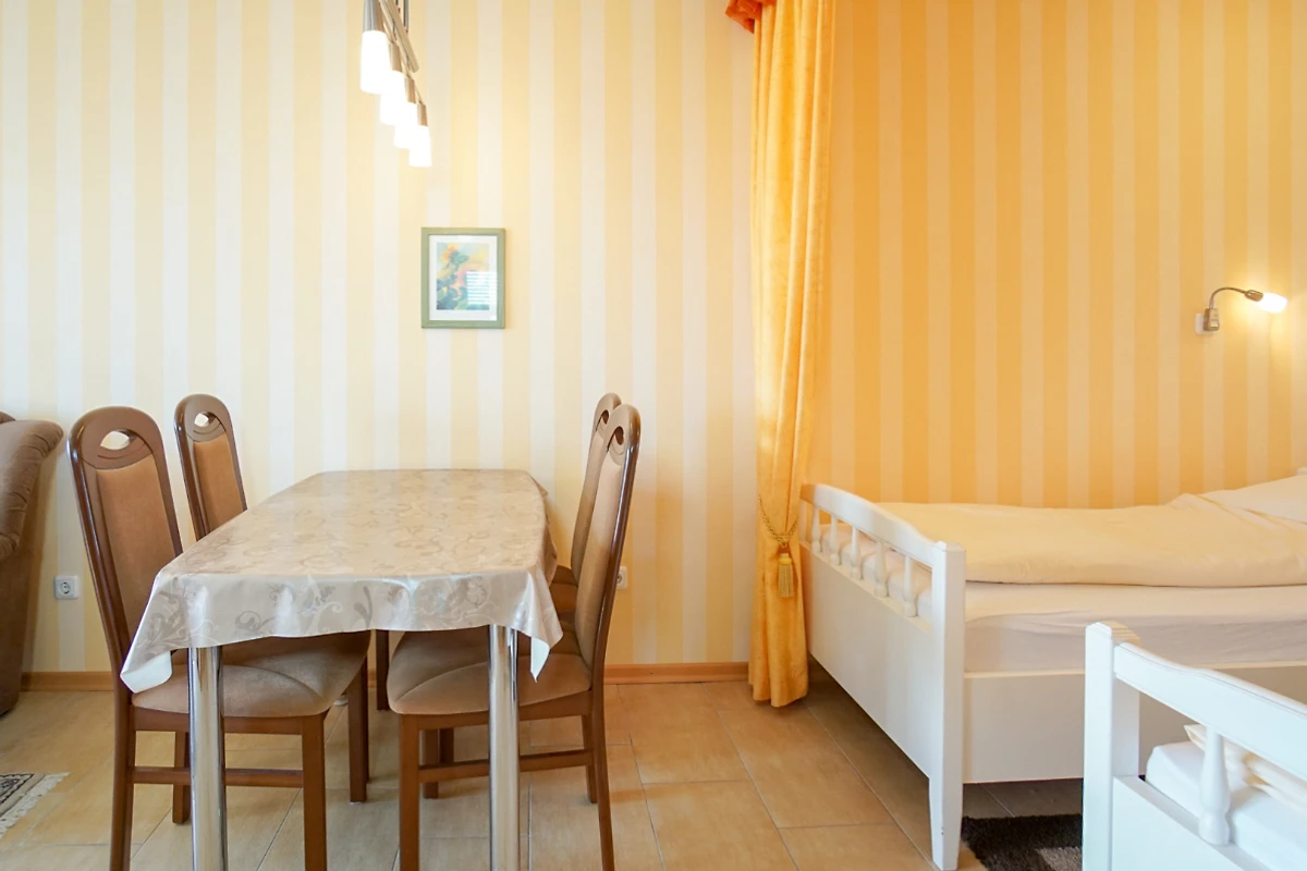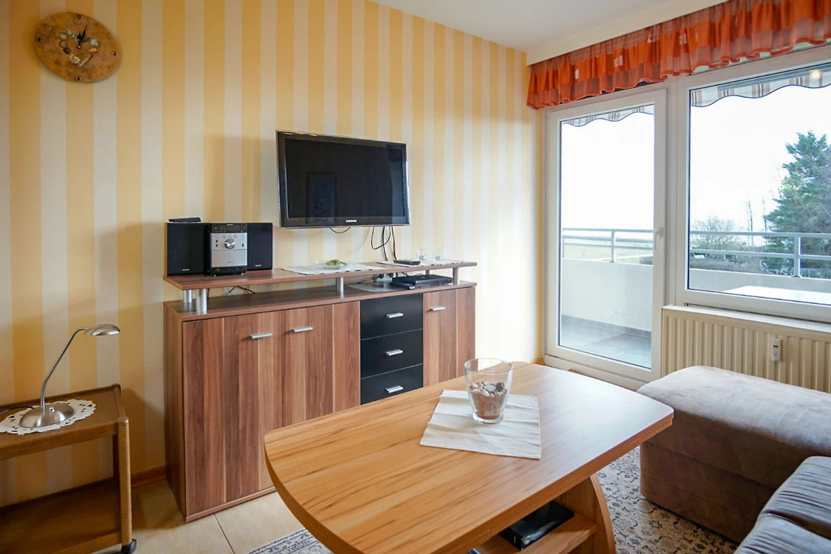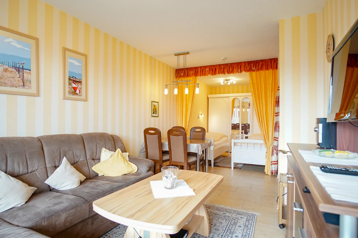 Die gemütliche 47m²-Wohnung in der ersten Etage verfügt über einen grosszügigen Wohnbereich mit einer gemütlichen Sofaecke mit Flatscreen-TV und der Essecke für vier Personen. Vom Wohnzimmer aus gelangen Sie auf den Balkon. Im hinteren Wohnbereich befinden sich zwei bequeme Einzelbetten. Der offene Küchenbereich ist für den Urlaubsbedarf voll ausgestattet. Eine Kaffeemaschine gehört ebenso dazu, wie ein Wasserkocher und ein Toaster. Geschirr und Besteck sind ausreichend vorhanden. Das angrenzende Kinderzimmer verfügt über ein Etagenbett und ist auch für Teenager geeignet.
