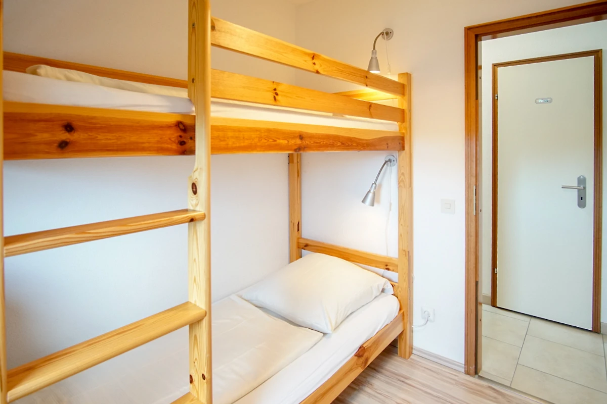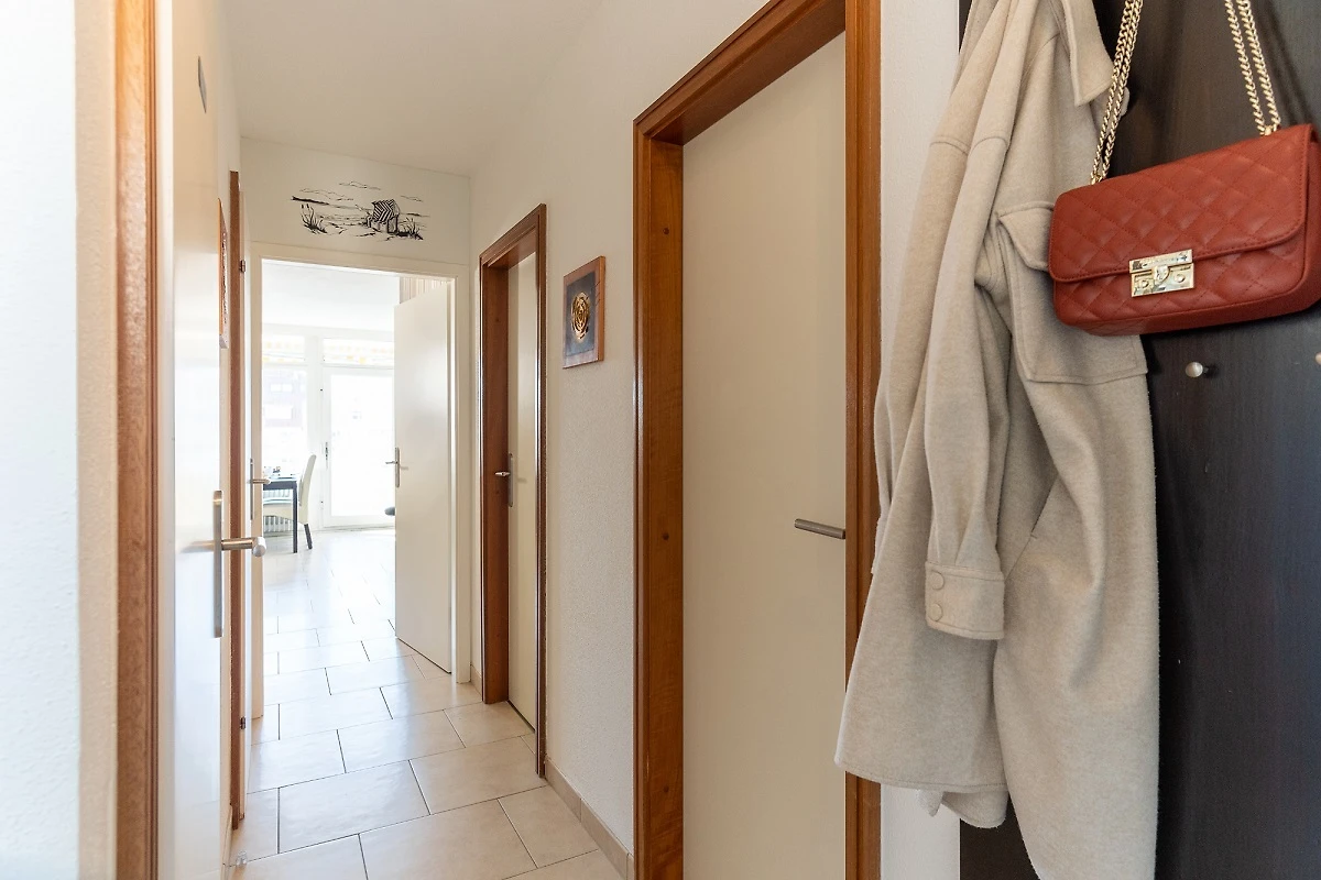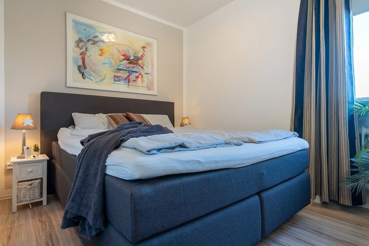 Die modernisierte 54m²-Wohnung in der 2. Etage im Haus 1 der Anlage "Vier Jahreszeiten" am Südstrand verfügt über einen grosszügigen Wohnbereich mit einer gemütlichen Sofaecke mit Flatscreen-TV und der Essecke für vier Personen. Vom Wohnzimmer aus gelangen Sie auf den Süd-Westbalkon. Der offene Küchenbereich ist, für den Urlaubsbedarf, voll ausgestattet. Eine Kaffeemaschine gehört ebenso dazu, wie der Wasserkocher und ein Toaster. Geschirr und Besteck sind ausreichend vorhanden. Ausserdem steht Ihnen noch eine Mikrowelle zur Verfügung. Das angrenzende Kinderzimmer verfügt über ein Etagenbett und ist auch für Teenager geeignet. Das Elternschlafzimmer ist mit einem Boxspringbett (160*200 cm) ausgestattet.