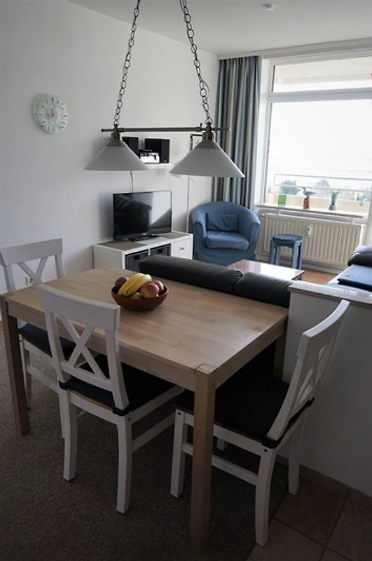 Die gemütliche 47m²-Wohnung befindet sich in der sechsten Etage und verfügt über einen hellen Wohnbereich mit einem gemütlichen Eck-Sofa, Flatscreen-TV und einer Essecke für vier Personen. Vom Wohnzimmer aus gelangen Sie auf den Westbalkon mit herrlichem Merblick. Der offene Küchenbereich ist, für den Urlaubsbedarf, voll ausgestattet. Eine Kaffeemaschine gehört ebenso dazu, wie der Wasserkocher und ein Toaster. Geschirr und Besteck sind ausreichend vorhanden. Ausserdem steht Ihnen noch eine Mikrowelle zur Verfügung. Das Schlafzimmer ist mit einem bequemen Doppelbett, das Kinderzimmer ist mit einem Etagenbett ausgestattet.