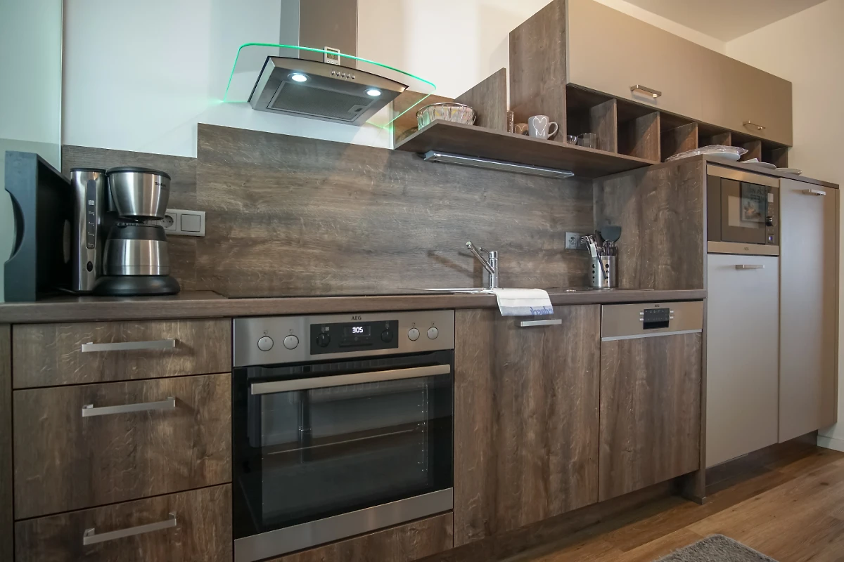 Der offene Küchenbereich ist, für den Urlaubsbedarf, voll ausgestattet. Eine Kaffeemaschine gehört ebenso dazu, wie der Wasserkocher und ein Toaster. Geschirr und Besteck sind ausreichend vorhanden. Ergänzt wird die Ausstattung mit einem Backofen, Geschirrspüler und einer Mikrowelle. Das Badezimmer verfügt über eine grosse Dusche mit Glastrennwand.