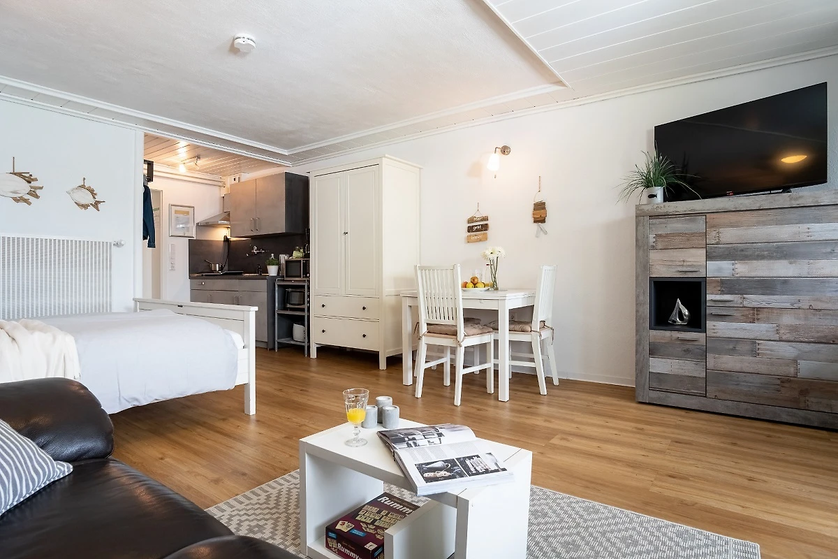 Die gemütliche, helle 31m²-Wohnung befindet sich im Erdgeschoss und verfügt über eine sonnige Südterrasse mit Blick zum Binnensee. Der Wohn-Schlafbereich ist mit einer gemütlichen Sofaecke und einem grossen Doppelbett (ca. 160x200cm) ausgestattet. Die kleine Kochnische verfügt neben den gängigen Kochutensilien zusätzlich über eine Mikrowelle und ein Zwei-Platten-Kochfeld.