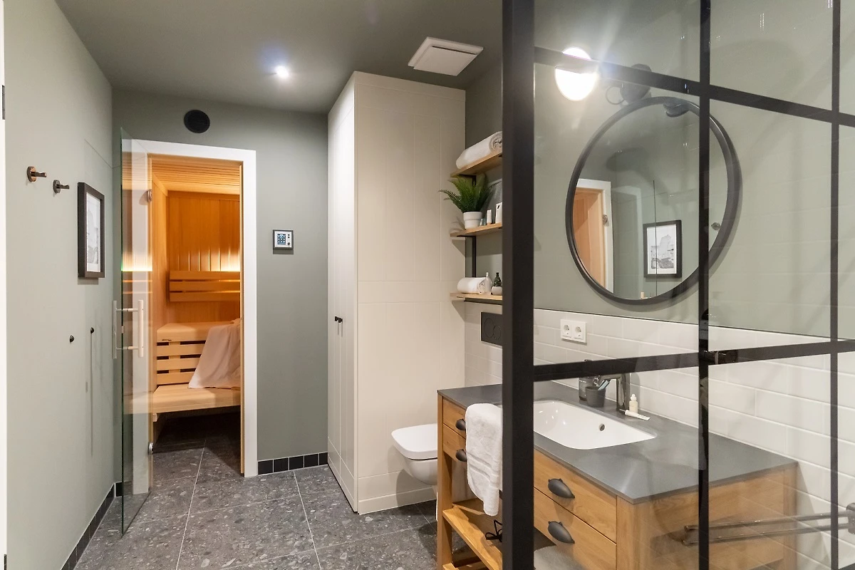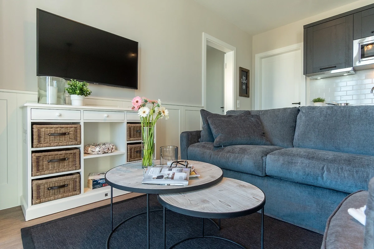 Das lichtdurchflutete Wohn-Schlafzimmer ist mit einer gemütlichen Sofaecke (Schlafsofa 140*200cm) einem Smart-TV und einem Deckenventilator ausgestattet. Das Schlafzimmer mit Verdunklungsmöglichkeit verfügt über ein gemütliches Doppelbett (ca. 191*213cm) und ebenfalls einem Smart-TV. Vom maritimen und im modernen Wohndesign (Cosman Interior) eingerichteten Wohn- und Schlafbereich aus haben Sie einen zauberhaften Blick zum Meer. Die angrenzende offene Küche ist mit allen Annehmlichkeiten voll ausgestattet. Für Kaffeeliebhaber steht neben einer Filterkaffeemaschine noch eine Nesspressomaschine zur Verfügung. Das Badezimmer ist mit einer ebenerdigen Dusche mit Glastrennwand ausgestattet. Das besondere Highlight ist die wohnungseigene Sauna, sowie eine Wellnessdusche - hier lässt es sich auch an Schietwettertagen herrlich relaxen. Sowohl vom Wohnzimmer als auch vom Schlafzimmer aus gelangen Sie auf den grossen Süd-Balkon. Hier erwarten Sie nicht nur der einmalige Ostseeblick, sondern auch eine Outdoor Sitzgruppe- selbstverständlich für 3 Personen; sowie 2 Deckchairs mit Tisch und ein Sonnenschirm sind ebenfalls vorhanden.