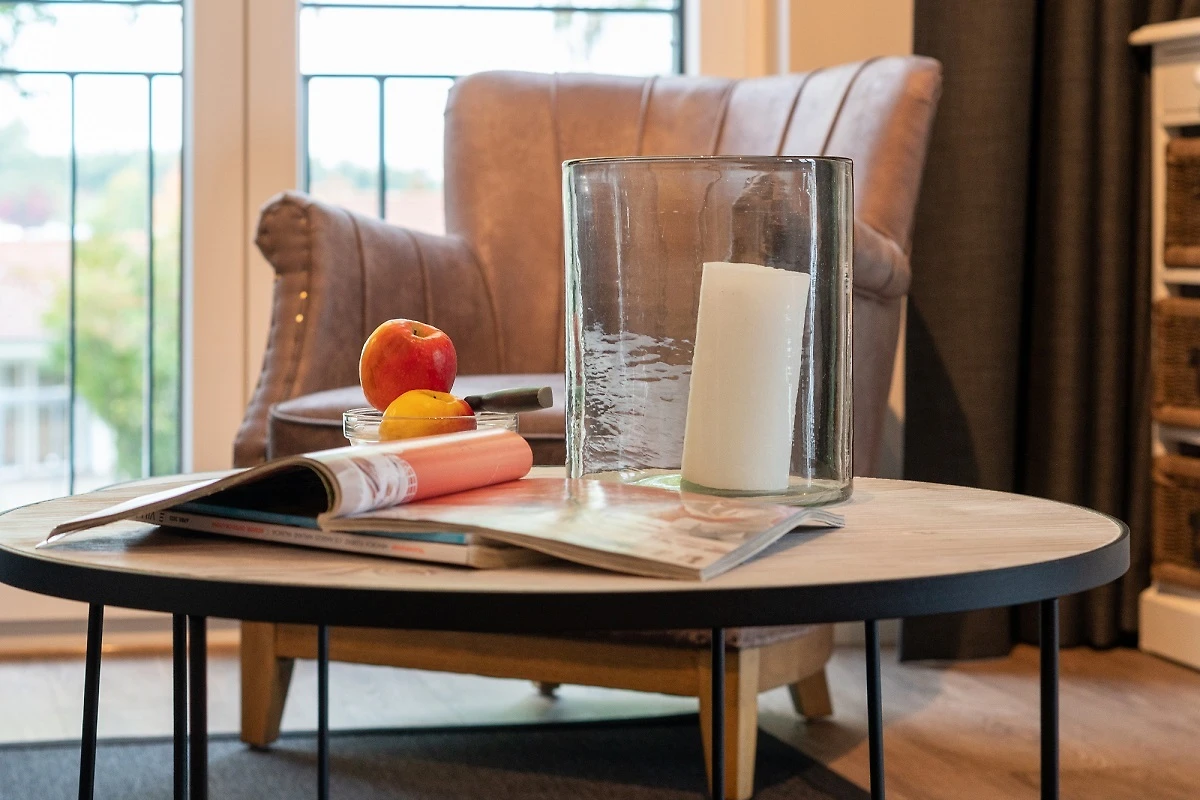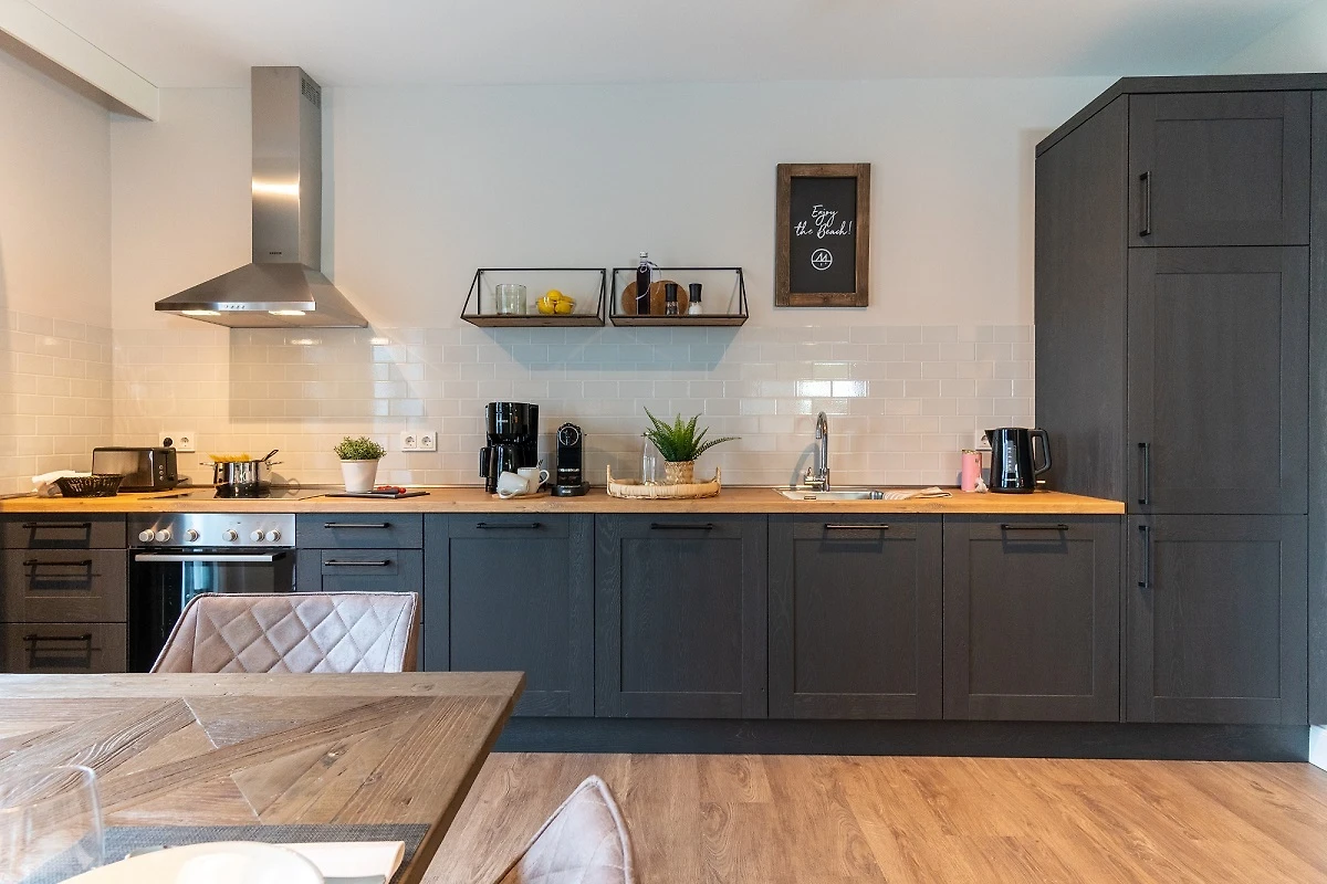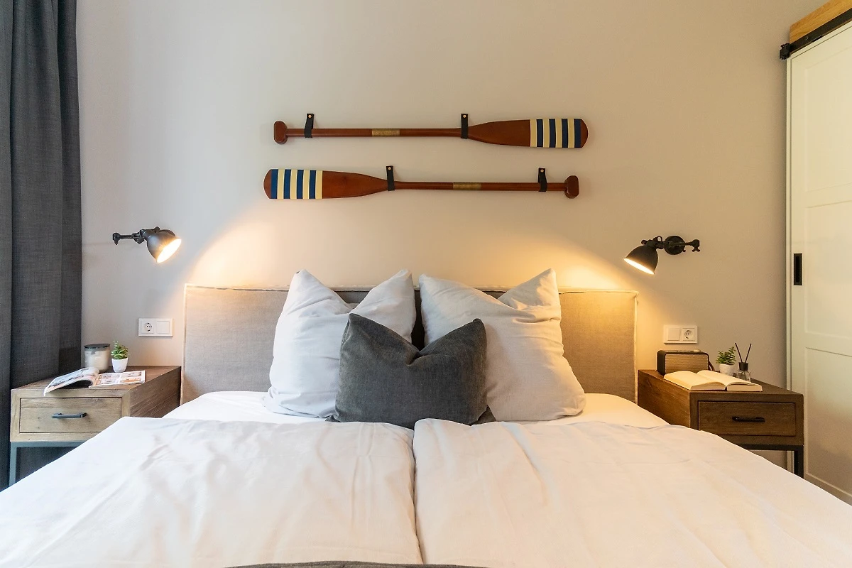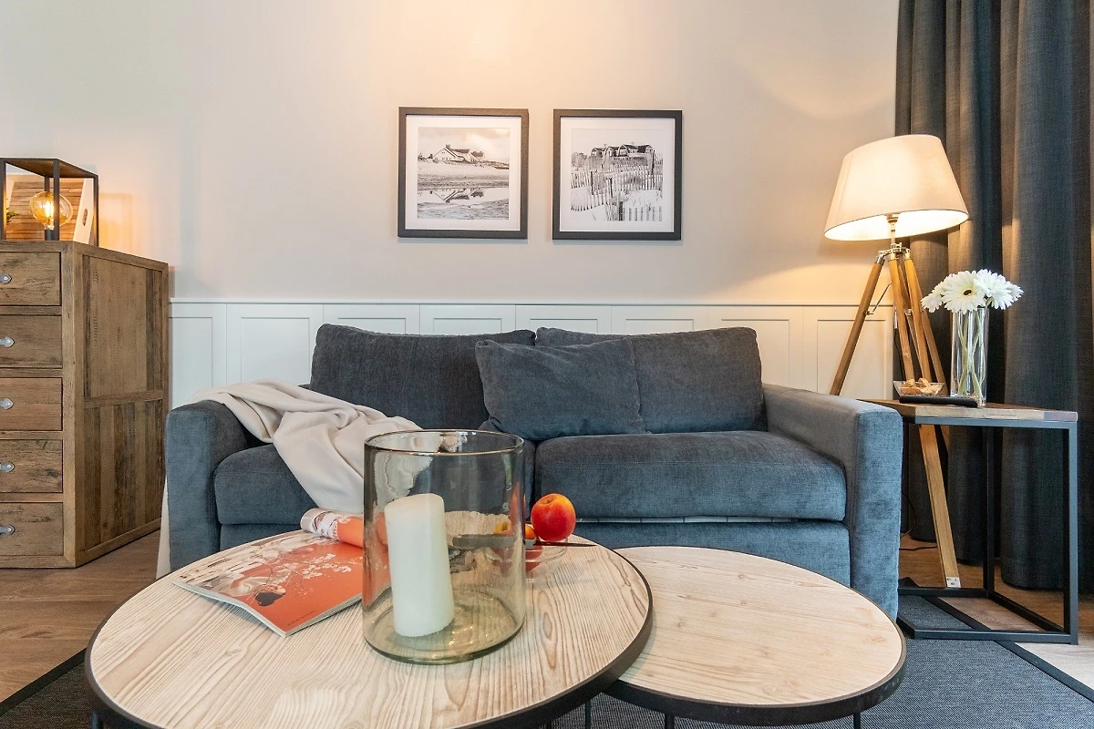 Die Wohnung befindet sich in der ersten Etage und ist grosszügig, modern und gemütlich eingerichtet. Die Natur stand Pate bei der Ausstattung und Möblierung. Das Meer, die Landschaft und die einmalige Ausstrahlung prägen das Designkonzept. An den Wänden finden sich die Farben von Strand und Meer wieder. Der Esstisch ist aus recycelter Ulme gefertigt, stimmig dazu sind die Teller und Tassen im Design „Nordic Sand". Zusammen mit den liebevoll ausgesuchten Deko-Elementen und Fotografien erinnert der Stil an den entspannten Long Island Spirit.
