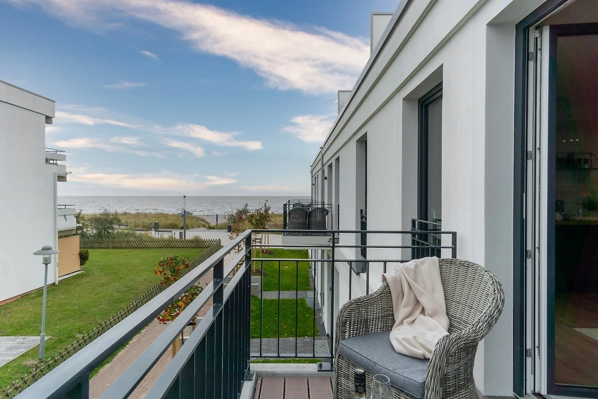 Last but not least der Balkon: Hier möchte man sich gleich in einen der beiden Sessel kuscheln, Beine hoch und dann nur noch geniessen – den Blick über das Meer bis zum Horizont …